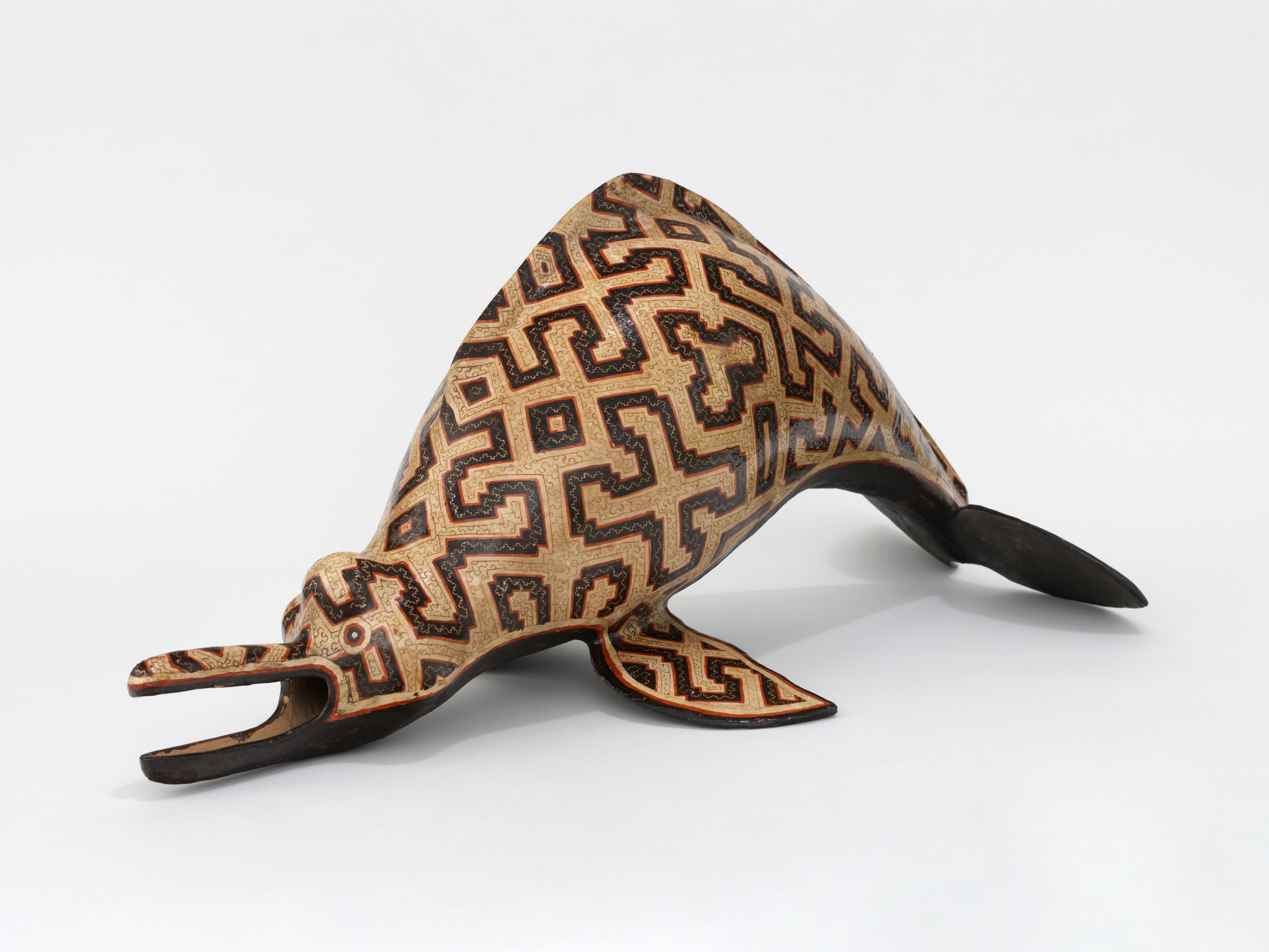 Celia Vasquez Yui is an artist, Indigenous rights activist, and political representative of the Shipibo-Conibo People of Peru. Born in the Amazonian city of Pucallpa in 1960, she began creating alongside her mother, an eminent ceramicist and descendant of the polychrome horizon cultures, whose archeological record throughout the Amazon dates back thousands of years. Balancing a cultural imperative for inventiveness with the constraints of traditional style, Vasquez Yui has distinguished her practice through astonishing creative innovations, exploring and expanding the zoomorphic features of the style. Not only does Vasquez Yui often work alongside her daughter Diana Ruiz Vasquez—an intergenerational collaboration that adds another expansive dimension to the work through which two bodies and two minds merge to finish each other’s designs—but she also has the custom to cut off a lock of hair from the head of her youngest apprentice in order to make from scratch the paint brushes of different sizes she uses to paint the designs. This way, her kené pathways channel into a pledge for the future too.