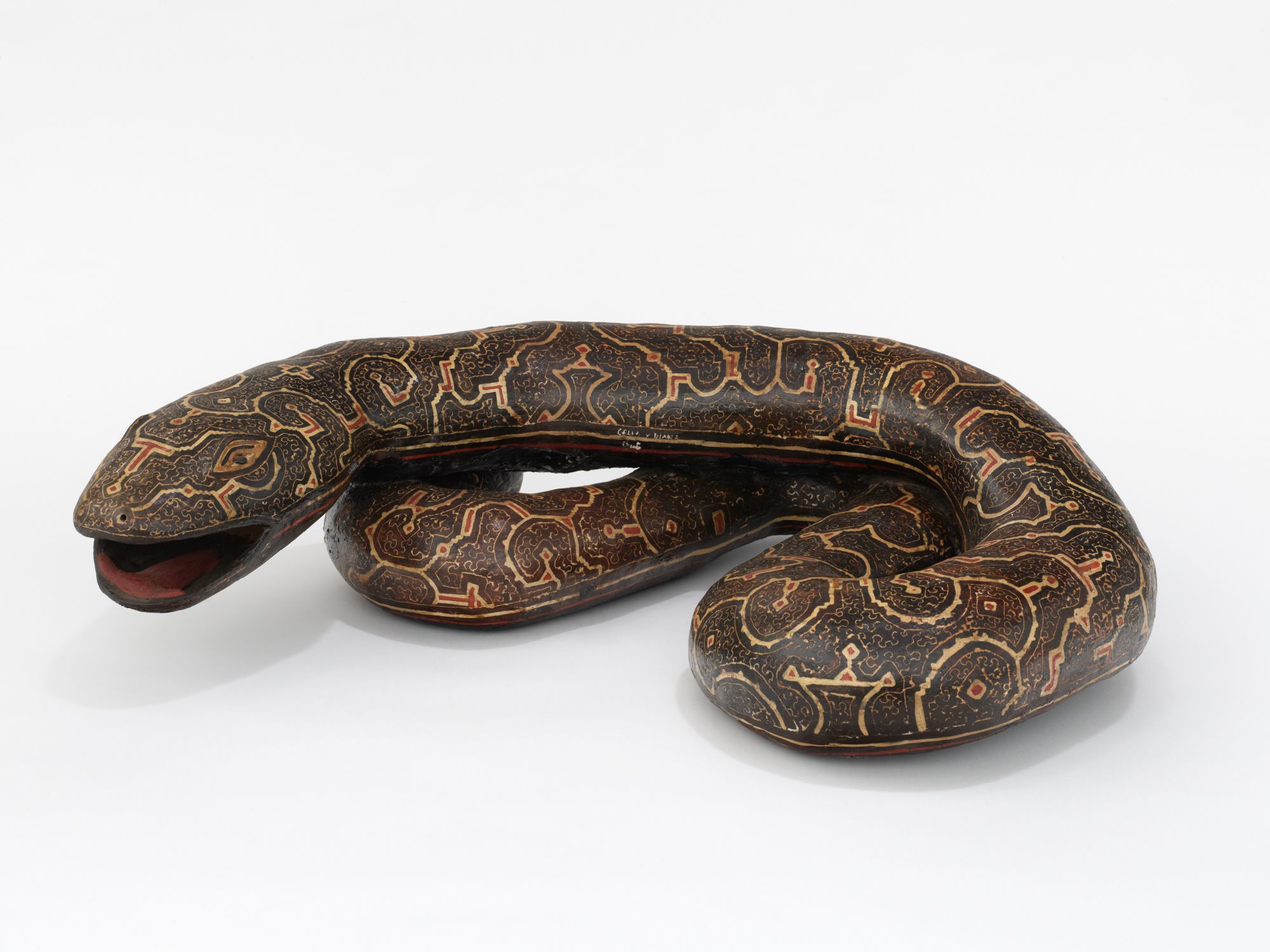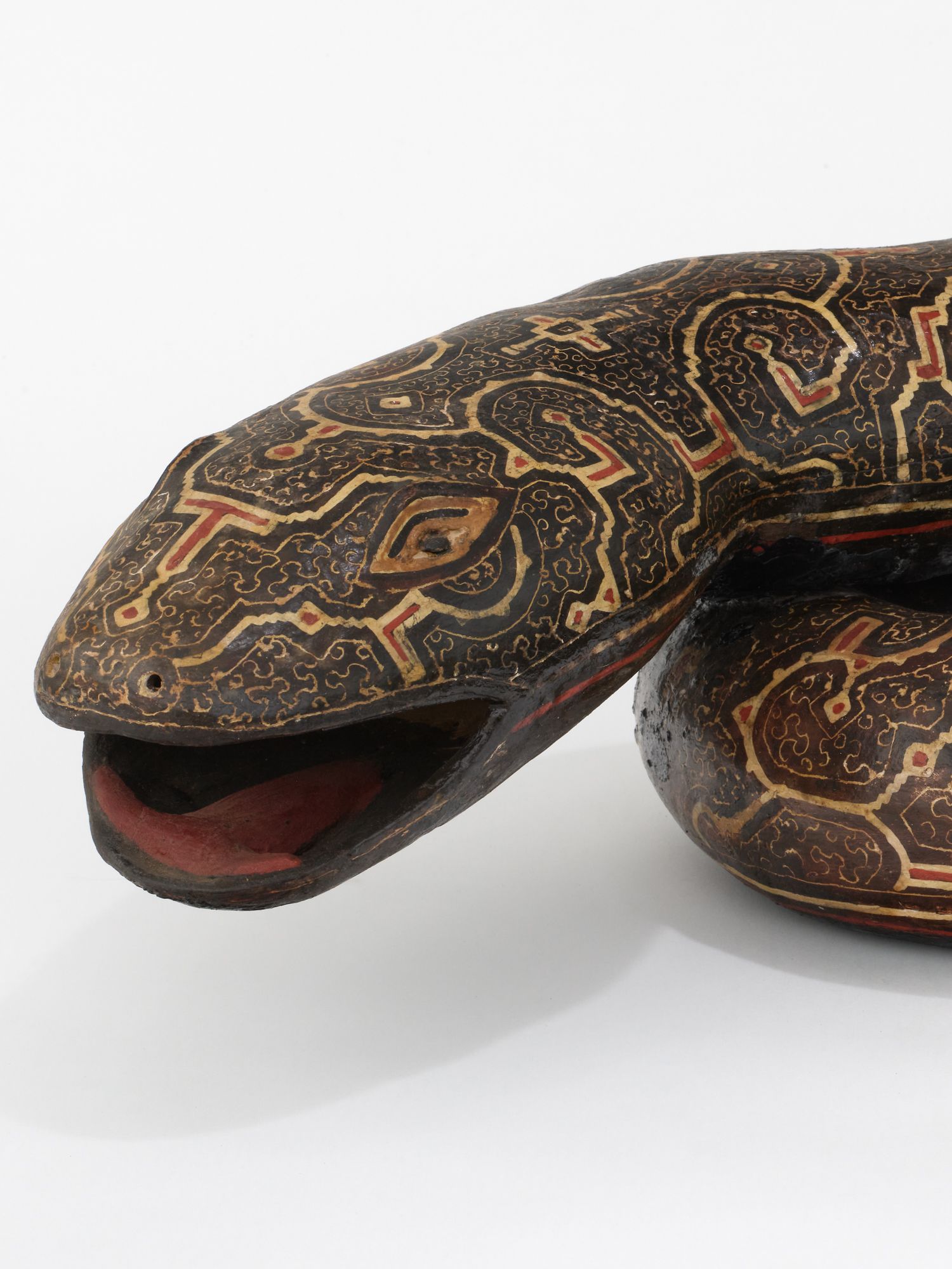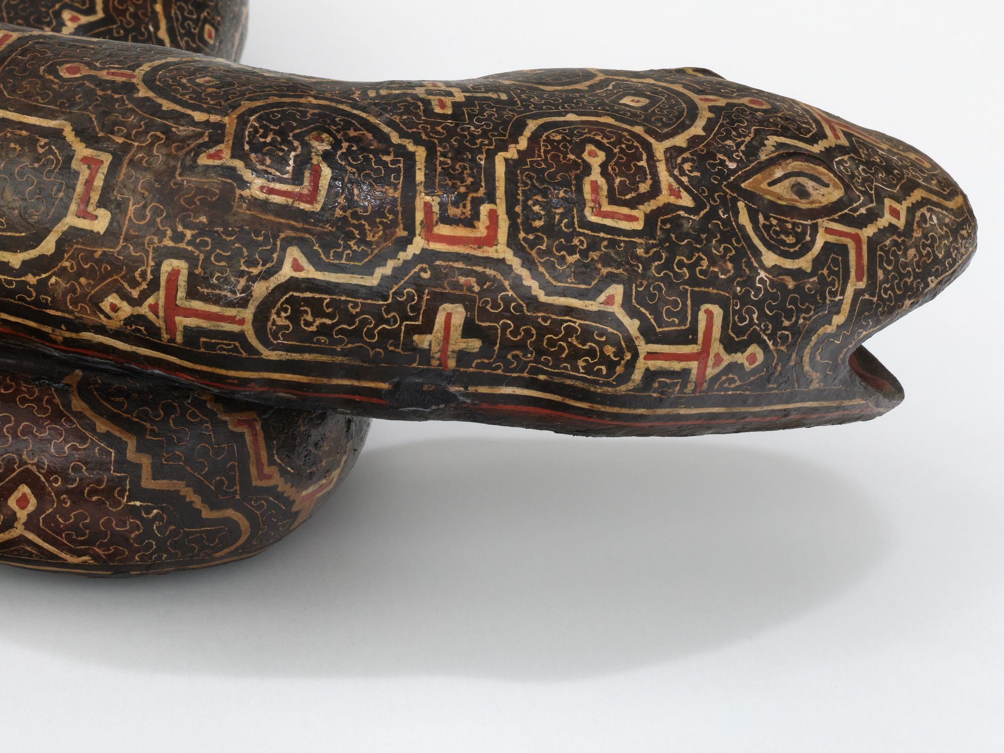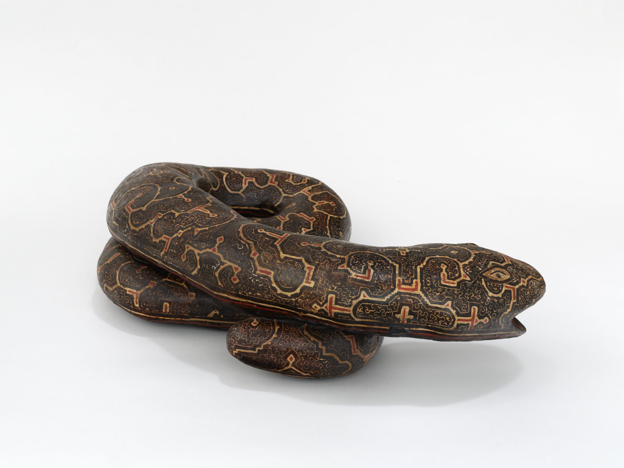 Coil-built pre-fire slip-painted clay and vegetal resins