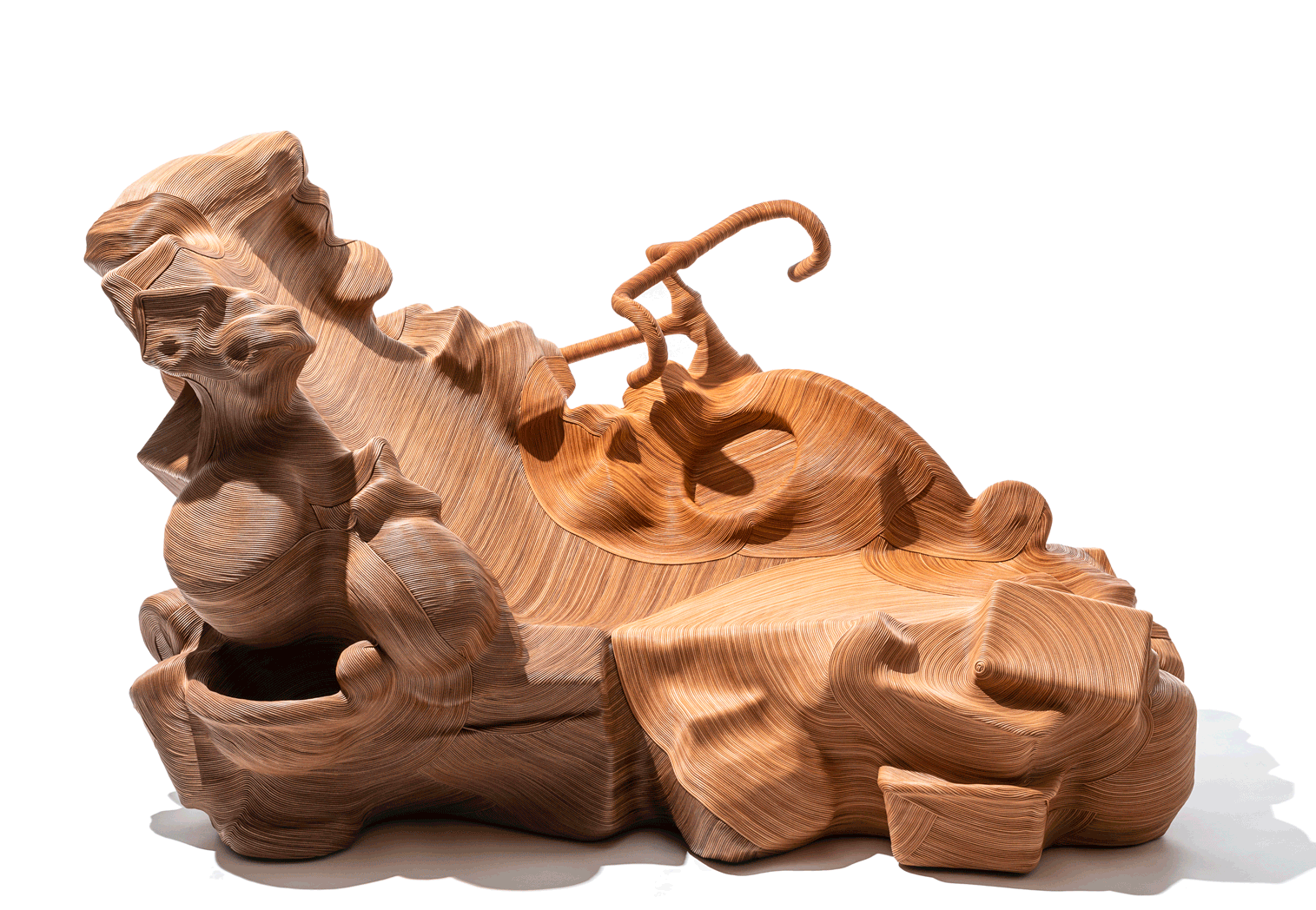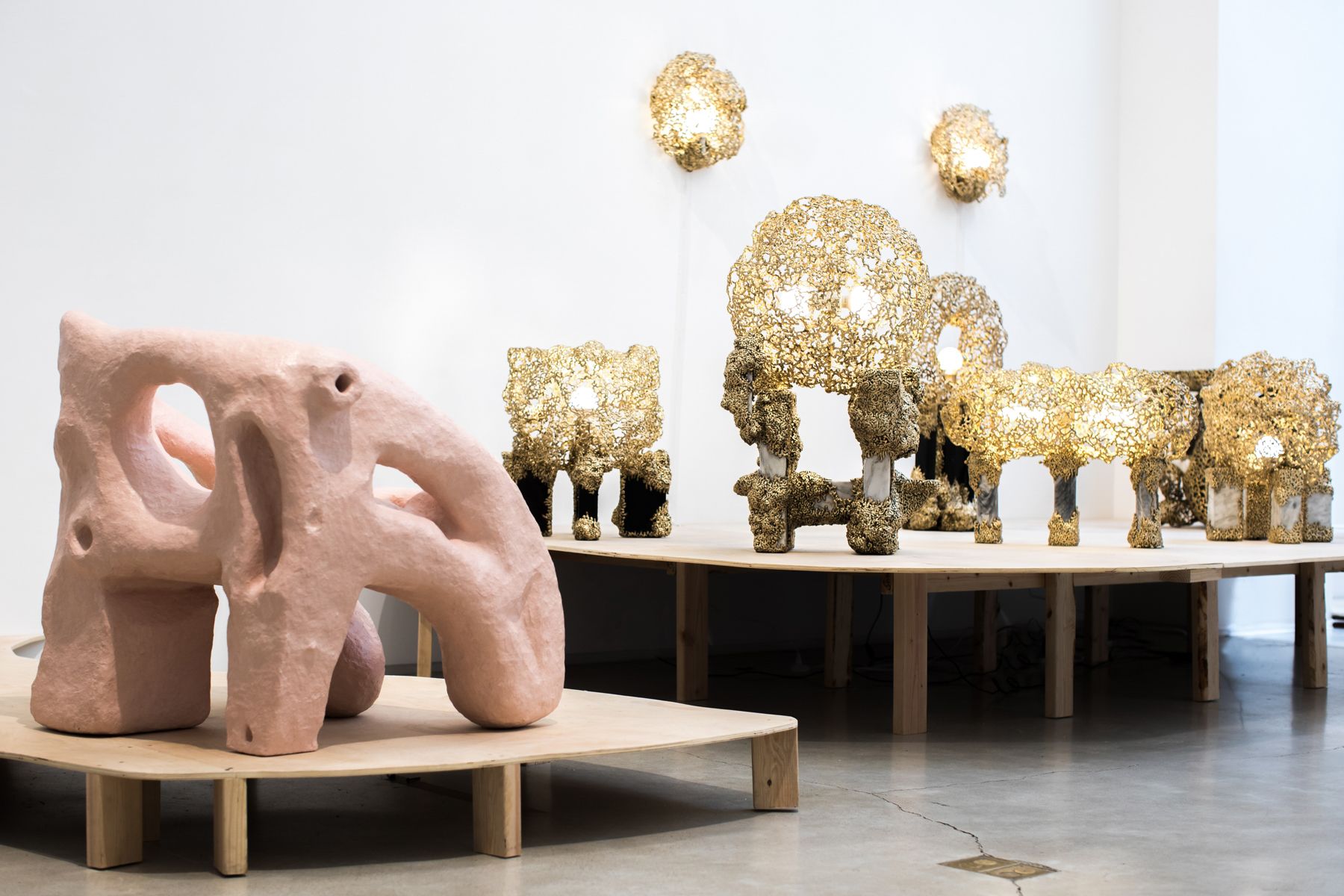 Jay transforms everyday objects into something new and extraordinary; assemblages that are at once art and craft. Oh’s ongoing Savage series is composed of seemingly jerry-rigged structures made of household objects, which are intricately hand wrapped in raw leather. The manufactured plastic objects that lie beneath, are transformed and unified into a sculptural design object, making a strong statement about the cultural condition of abundance and obsolescence.