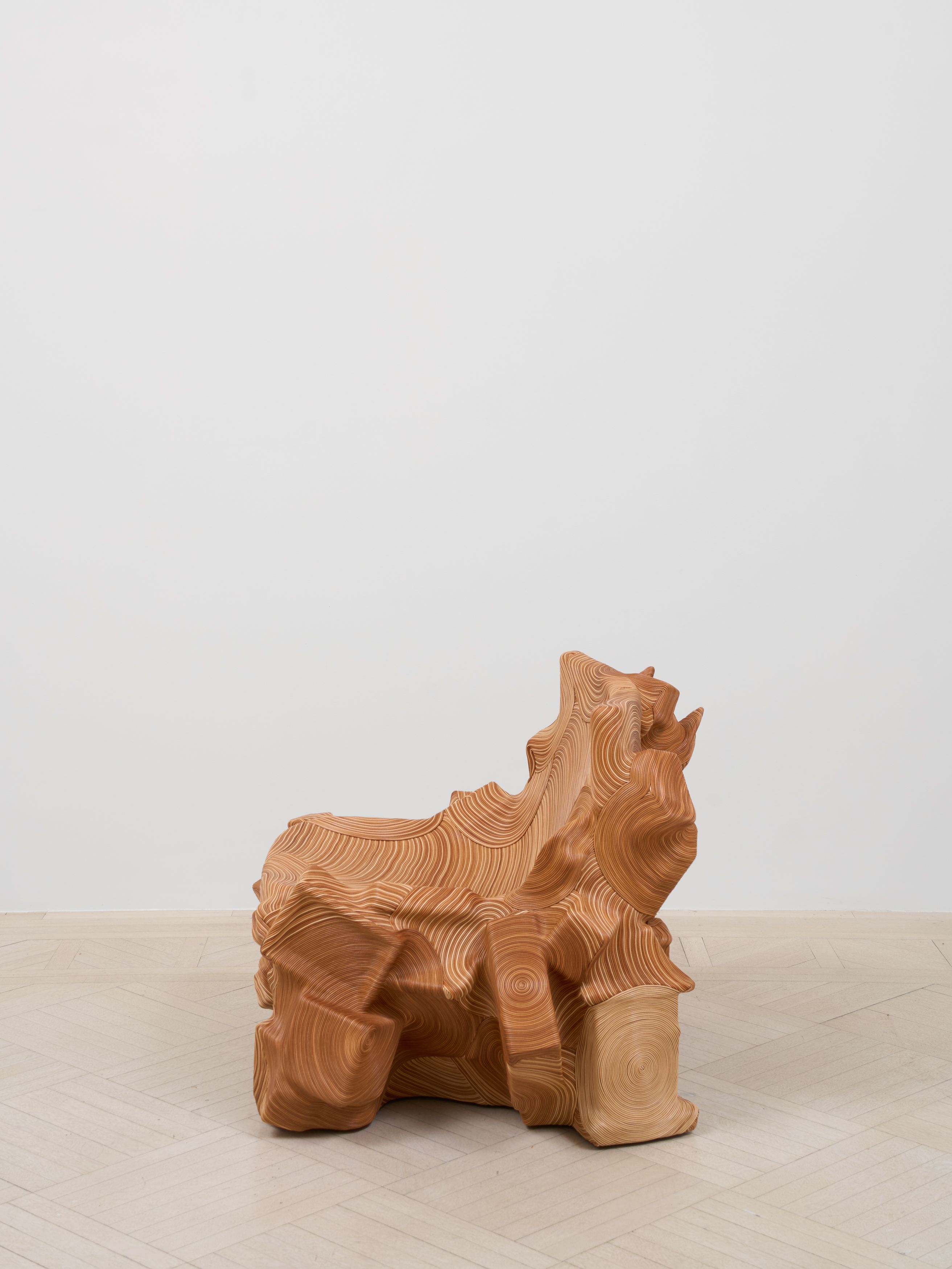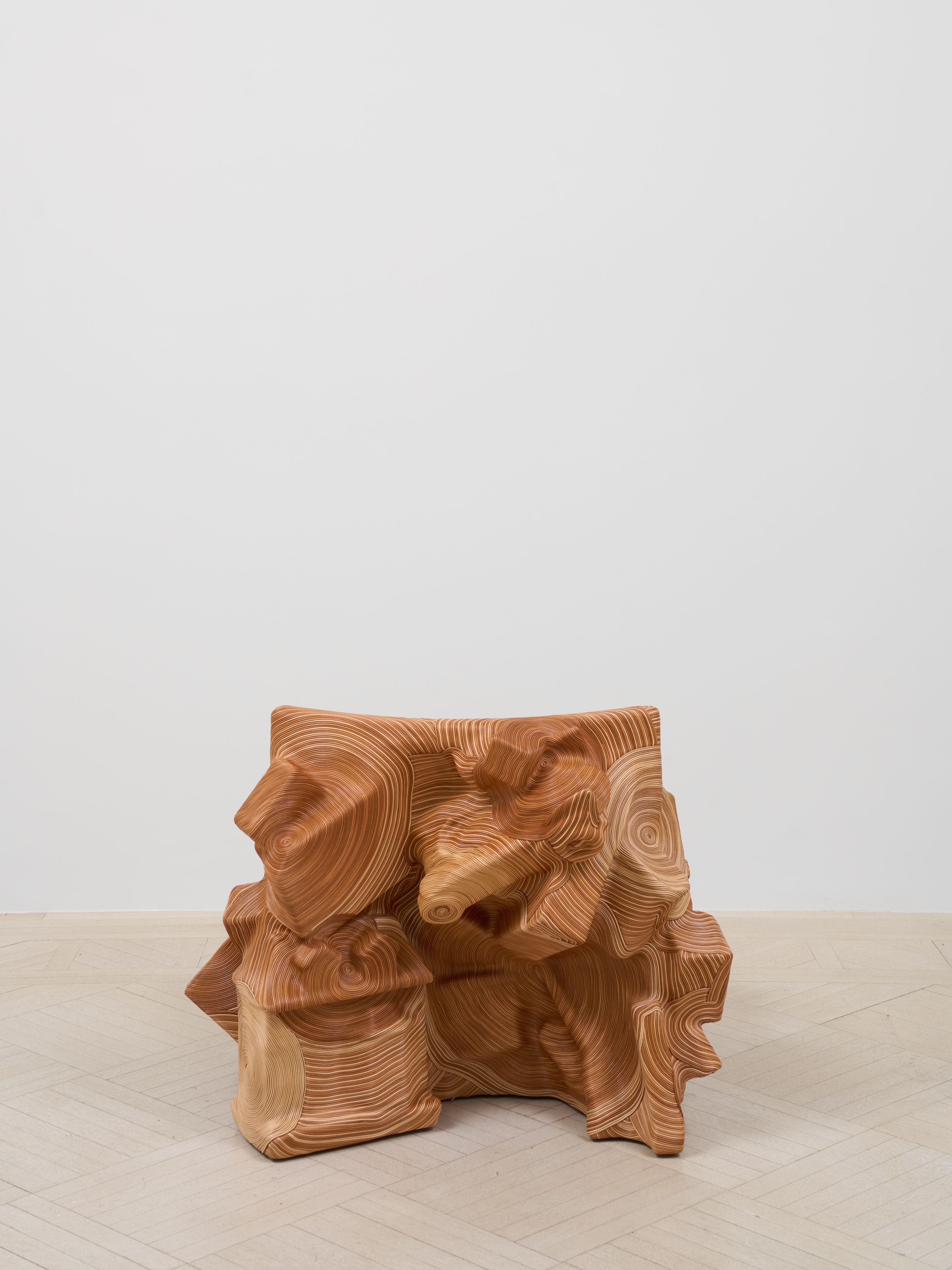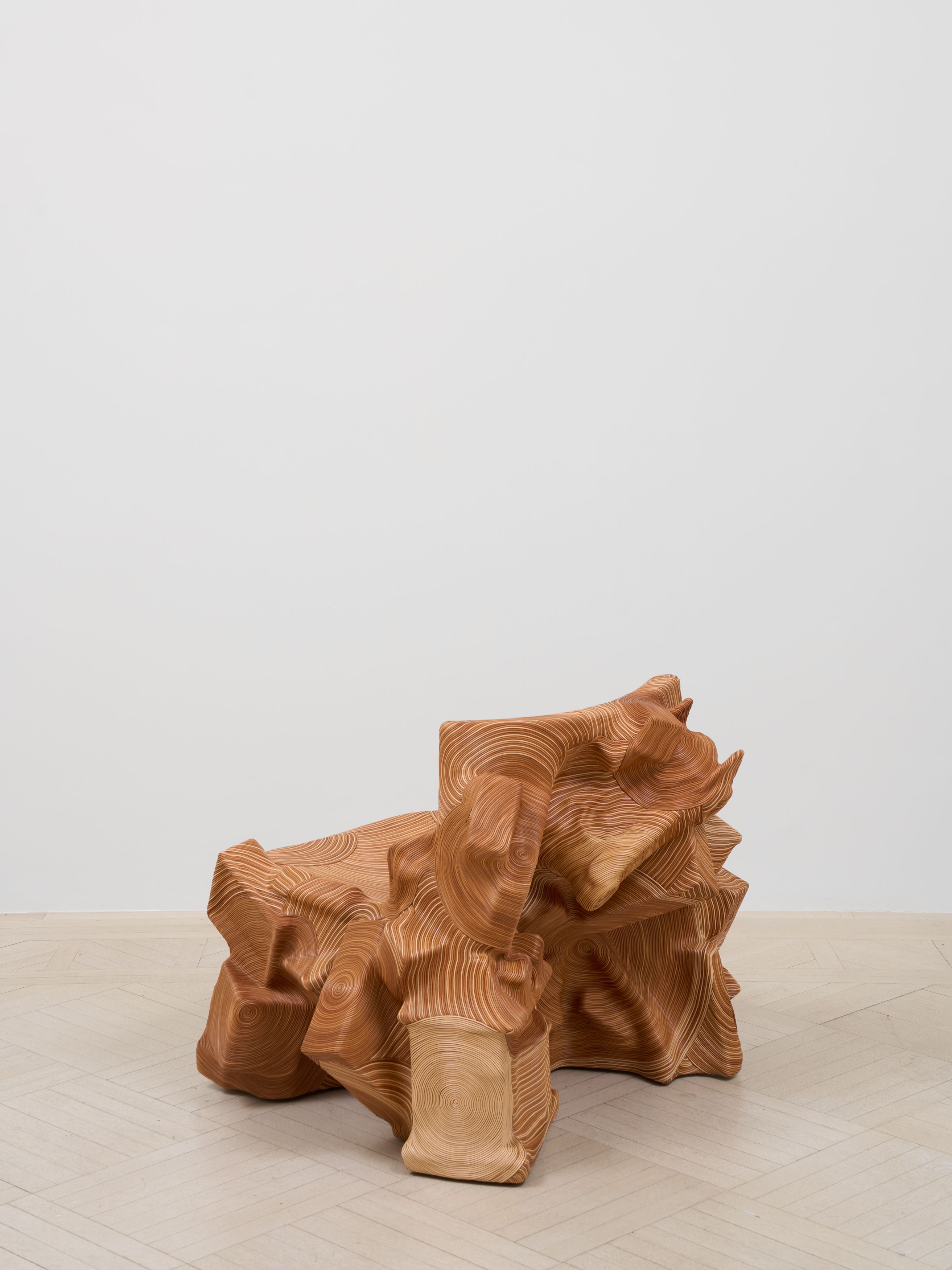 Plastic, metal and wood objects (Rubik's cube, bat mobile toy, doll house, tupperware, toy car, doll house, lantern, briefcase, book, picture frame, wooden building bocks, etc.), plywood base, adhesive, natural leather cord, leather finisher Estimate 900 yards leather cord used