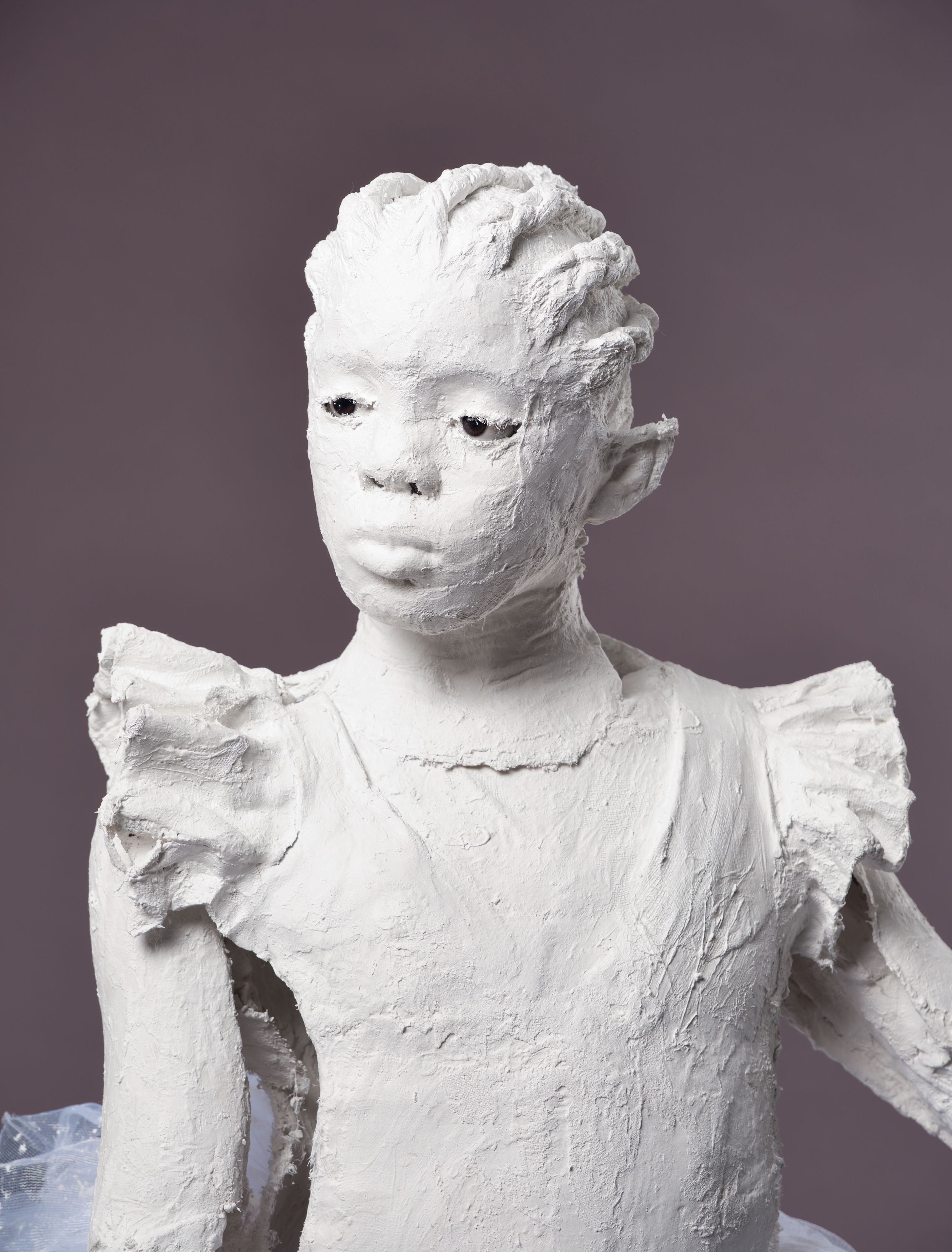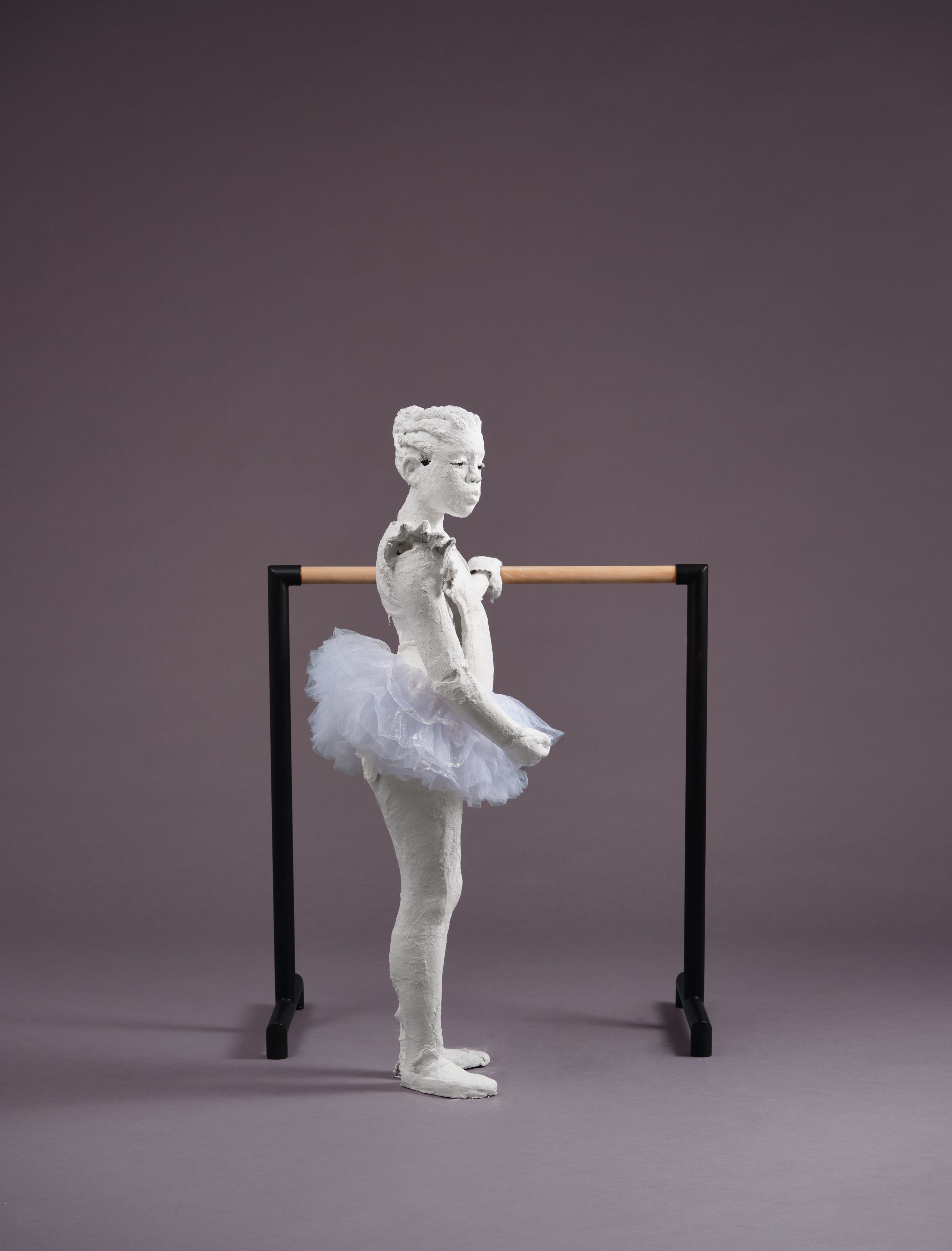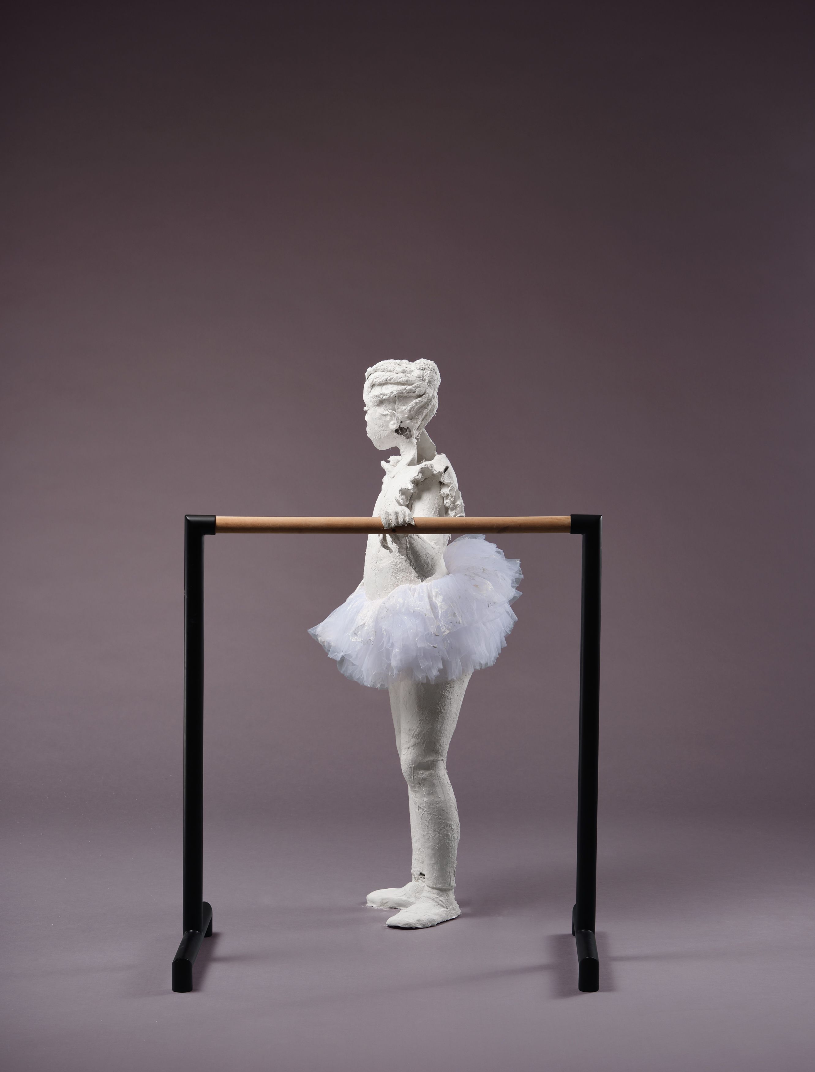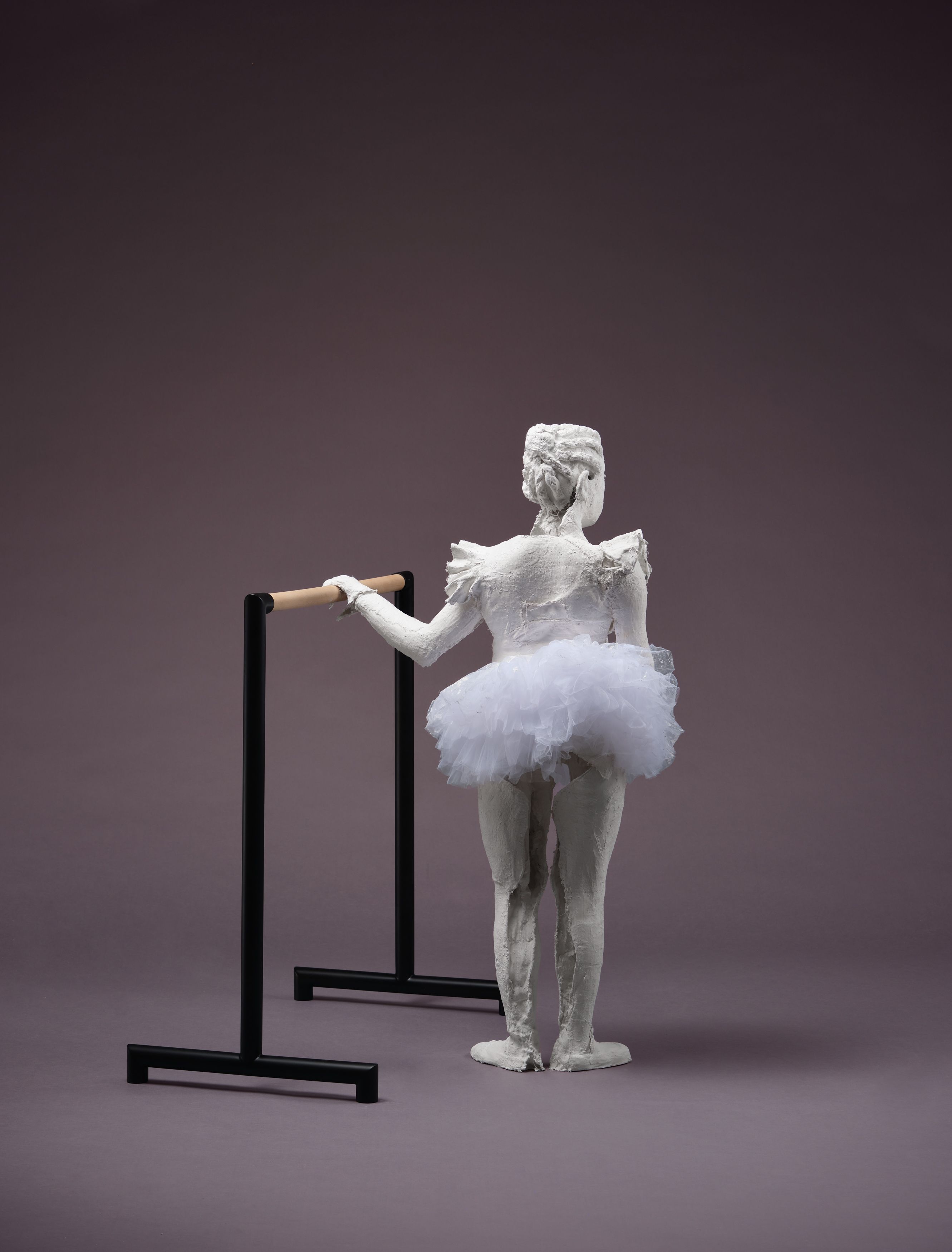 Plaster, steel, glass eyes, tulle, chicken wire, and wood ballet barre