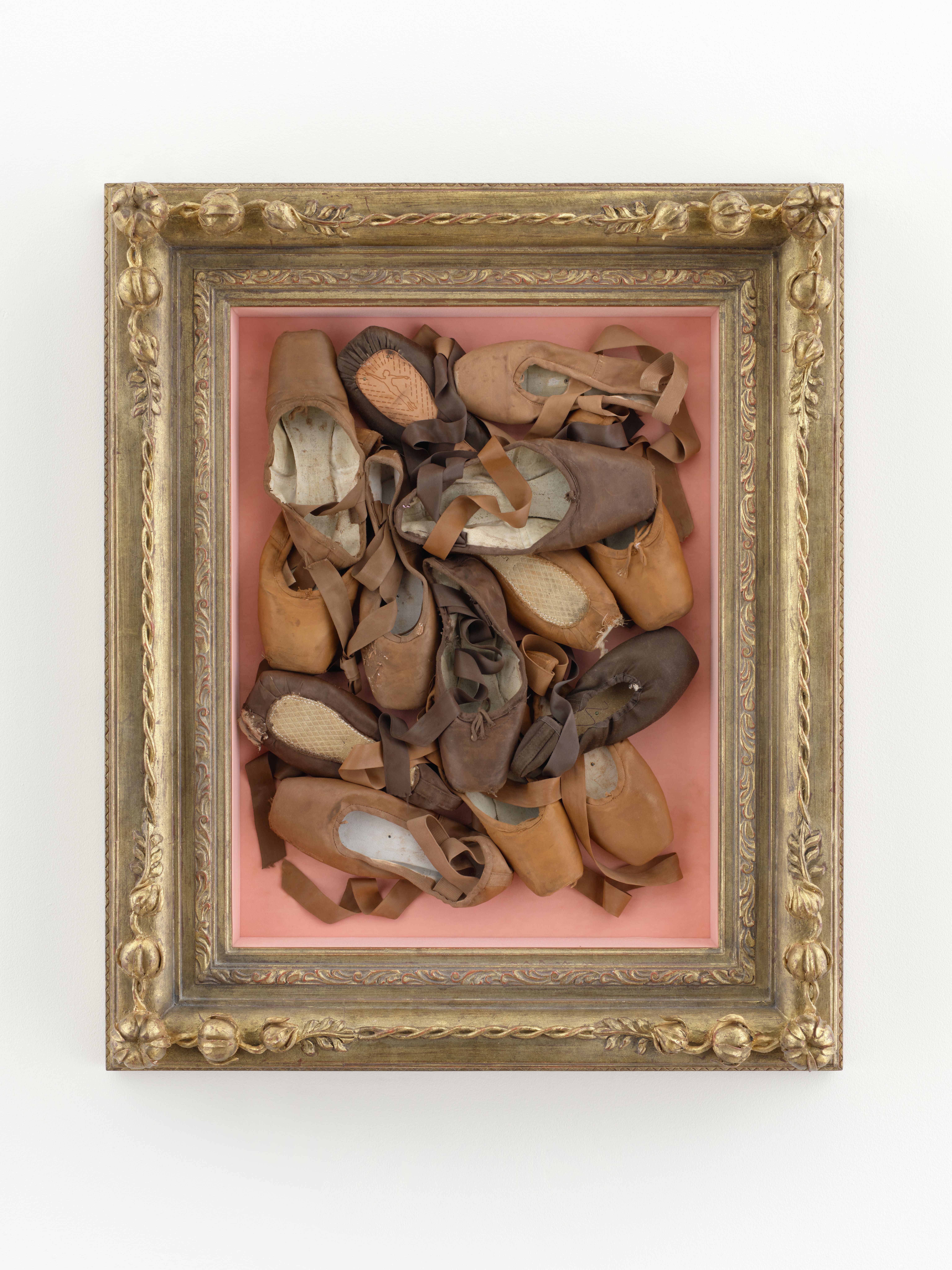 Wood, glass, pointe shoes, fabric, ribbon, makeup, and gold leaf
