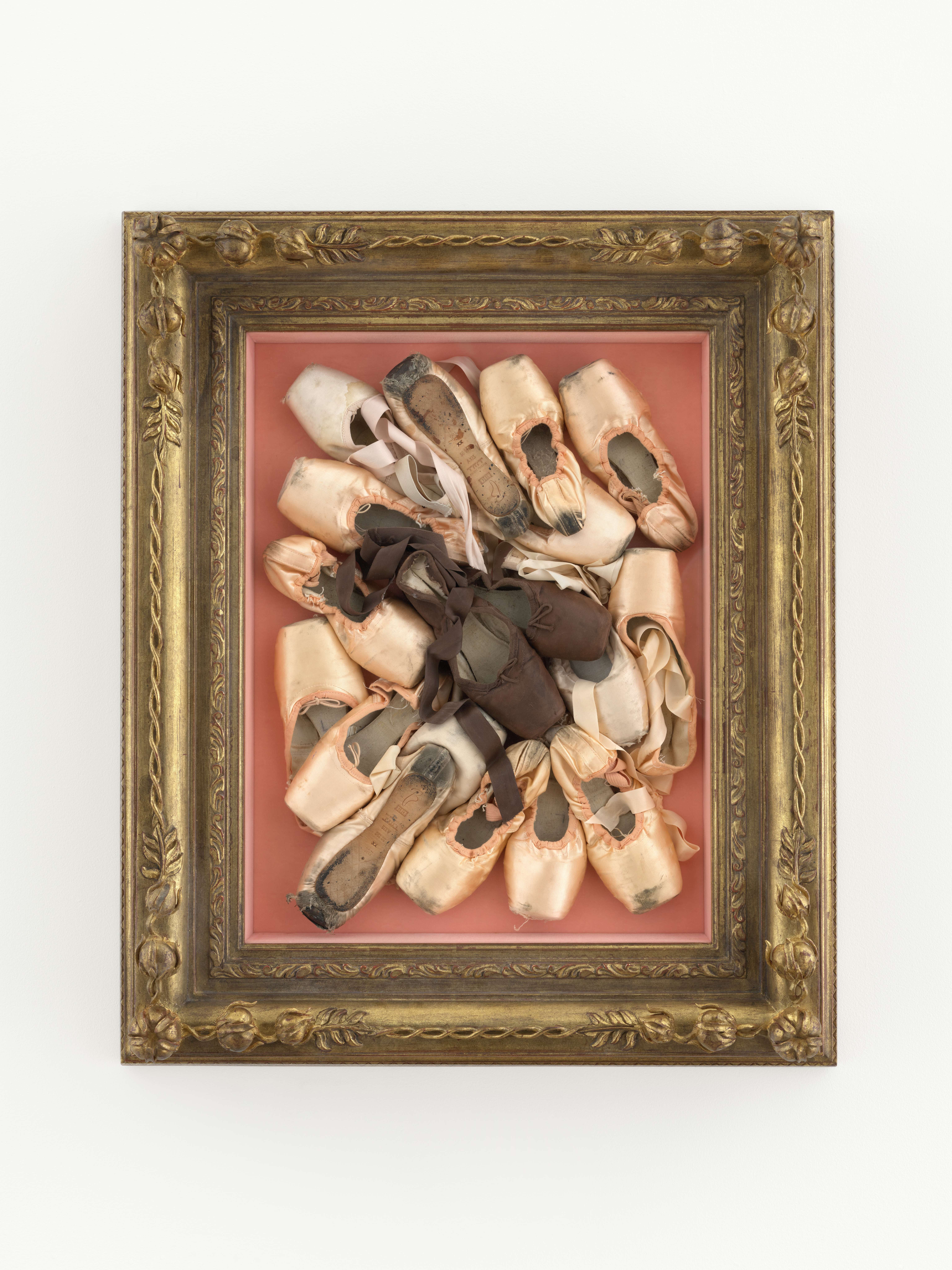 Wood, glass, pointe shoes, fabric, ribbon, makeup, and gold leaf