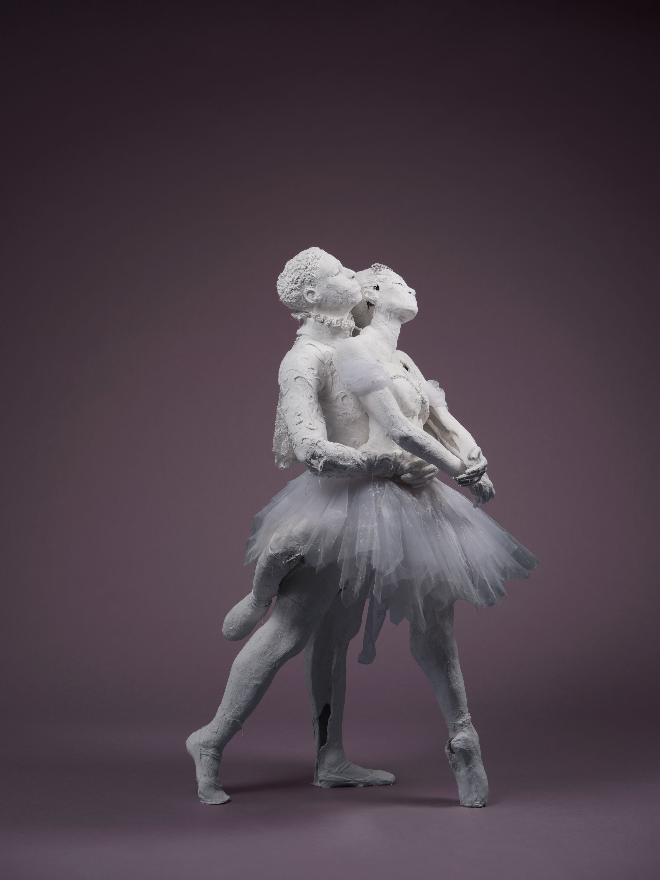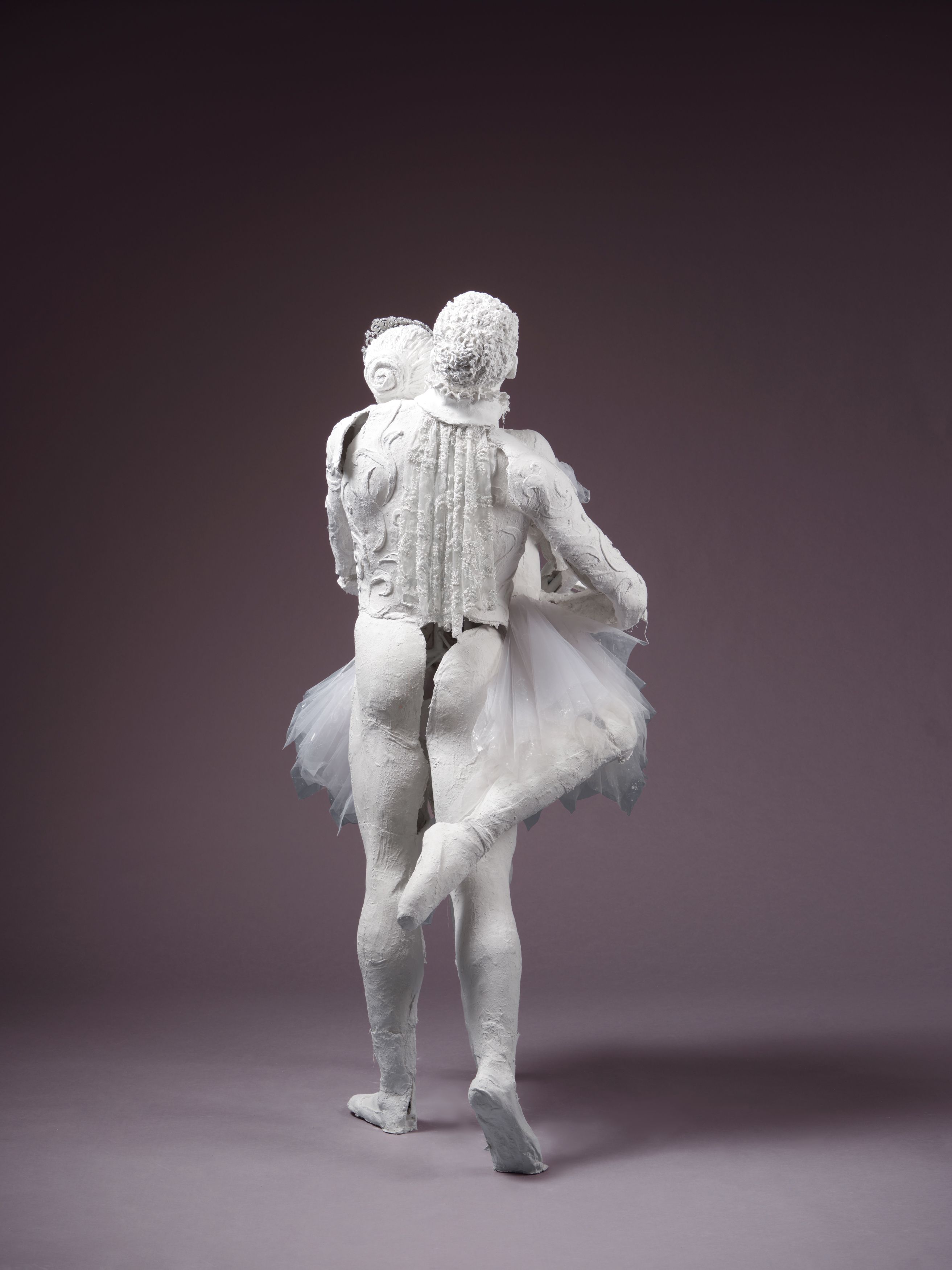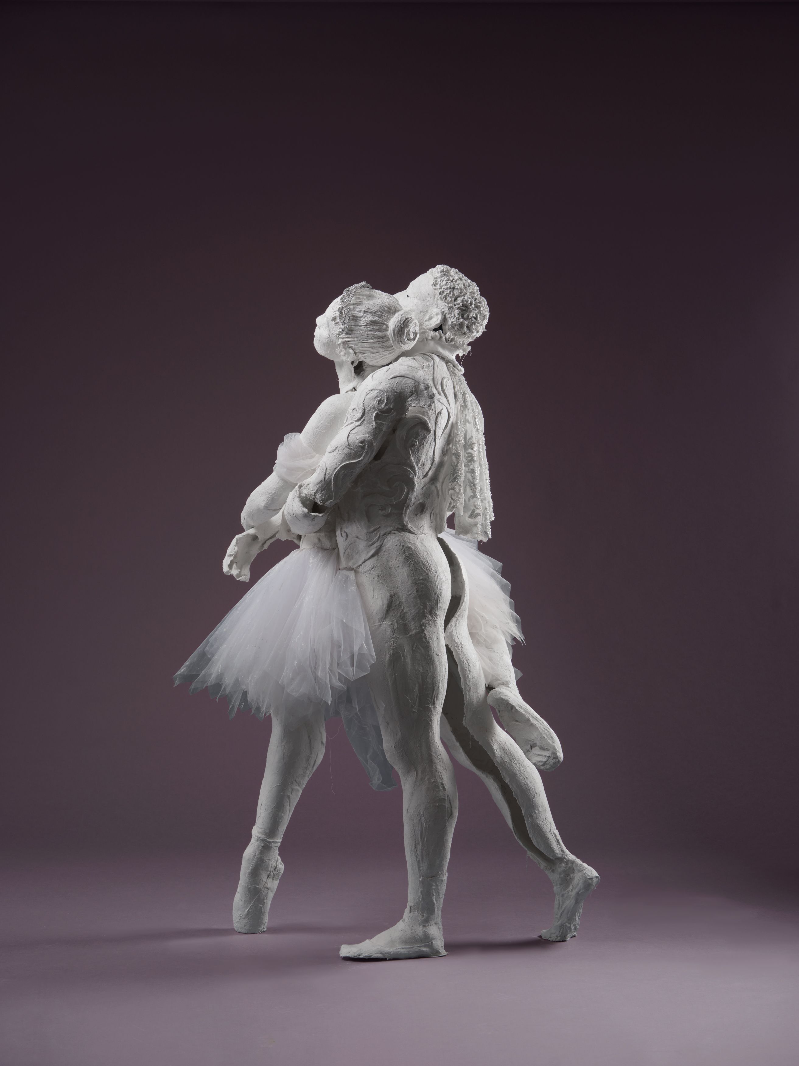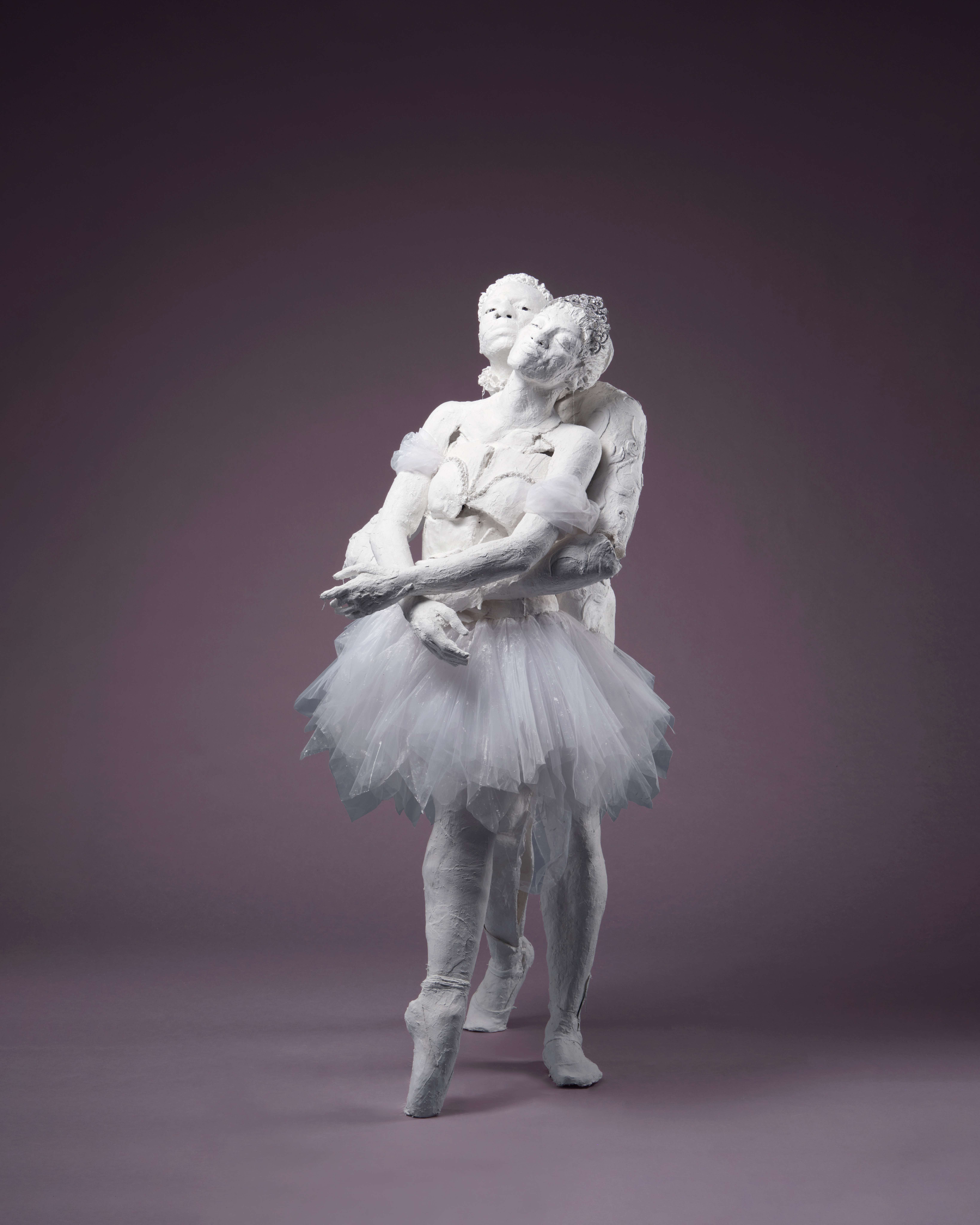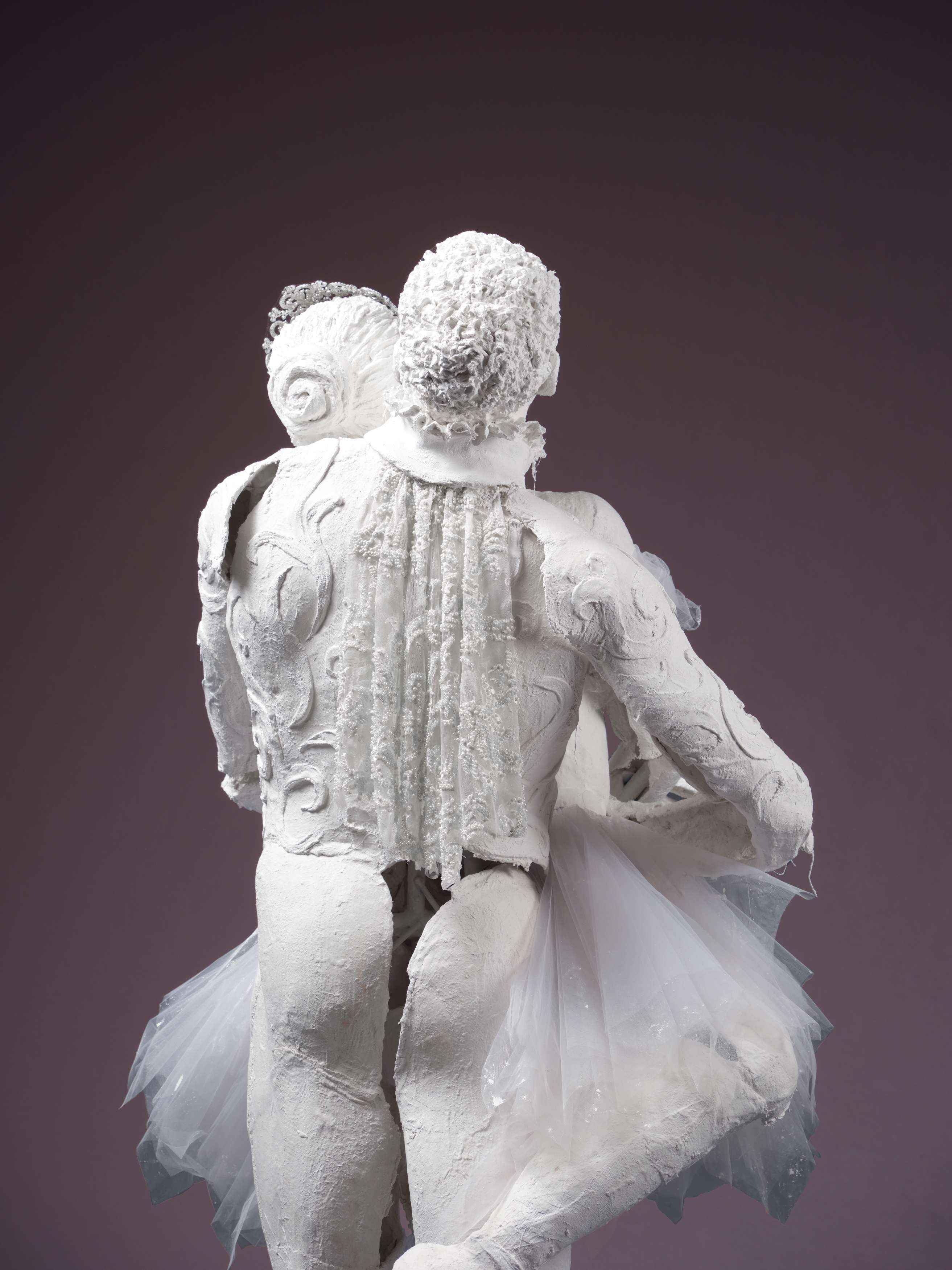 Plaster, steel, glass eyes, tulle, and chicken wire