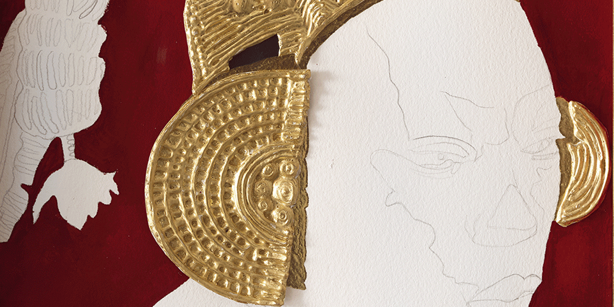 Lina Iris Viktor is a Liberian-British conceptual artist, painter, and performance artist whose practice draws on a range of influences, including African symbolism from ancient Egypt and contemporary Mali, among other places, classical astronomy, and European portraiture. Viktor’s canvases can be described as “light-works”, often using a limited palette of white, black, and gold. The use of gold relates to Mesoamerican and Egyptian cultures – gold as a conduit between worlds, summoning spiritual transcendence. Viktor describes herself as a “neophyte student of Astrology”, considering symbols of cosmology, and elements of mysticism, mathematics, and celestial arrangements within her paintings.