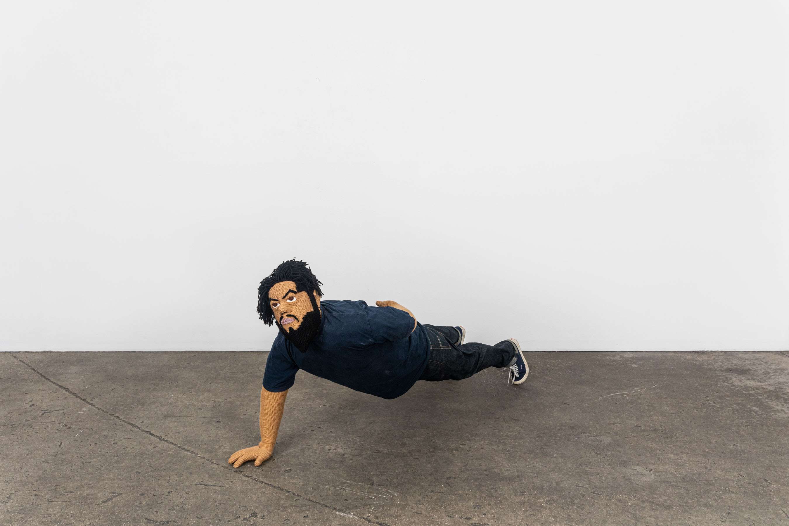 Luis Flores (b. 1985, Los Angeles) work ranges from sculpture, installation, and video performance to painting and drawing. Uniting these dynamic practices is his interest in the visualization of gender, masculinity, and sexuality. Flores' approach to art making involves a deliberate combination of the mechanics of self-portraiture and fabric material. His life-size soft sculptures, constructed with hand-crocheted yarn are like doppelgängers, whereas his small-scaled crocheted works, such as Cusi, or caste sculptures, such as Venus, are re-imaginations explorations of art history. Flores’ work continually taps into a limited engagement with and access to emotions as a hallmark of masculinity, race in America, and gender expectations and stereotypes.Flores processes these notions through the form of his own body, which is in fact constructed by means of a craft often explicitly attached to the female gender.