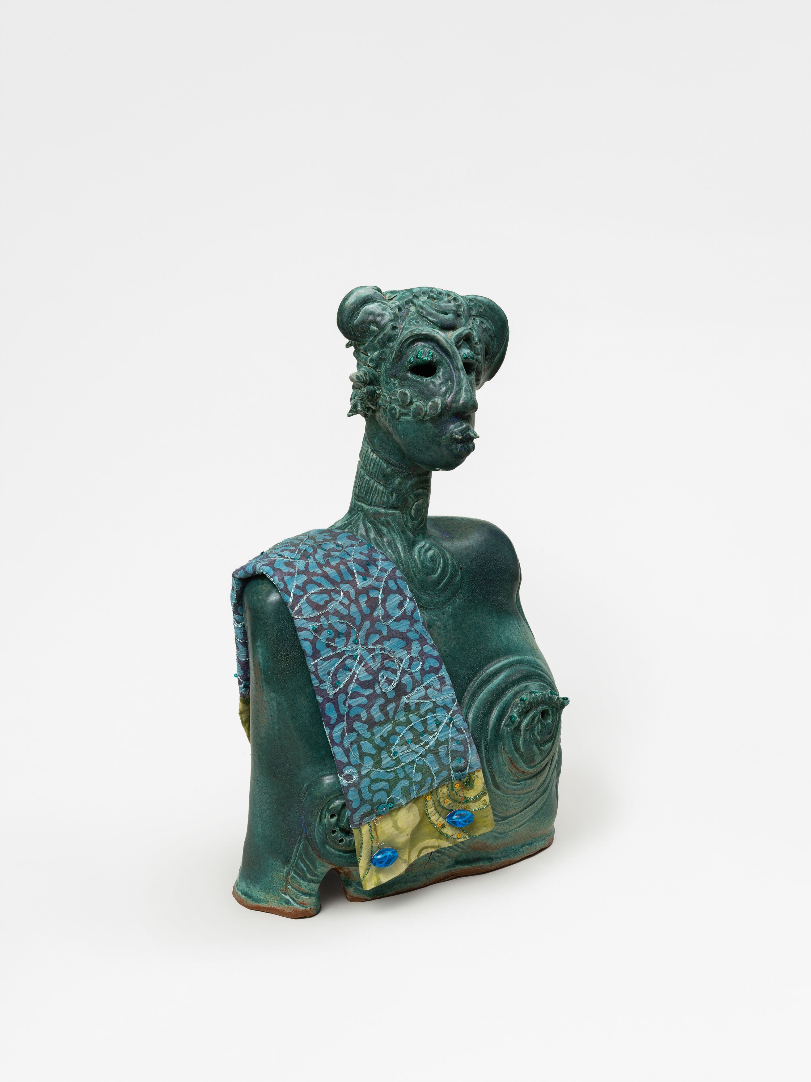 Hand-built stoneware, glaze, fabric, glass beads, glitter