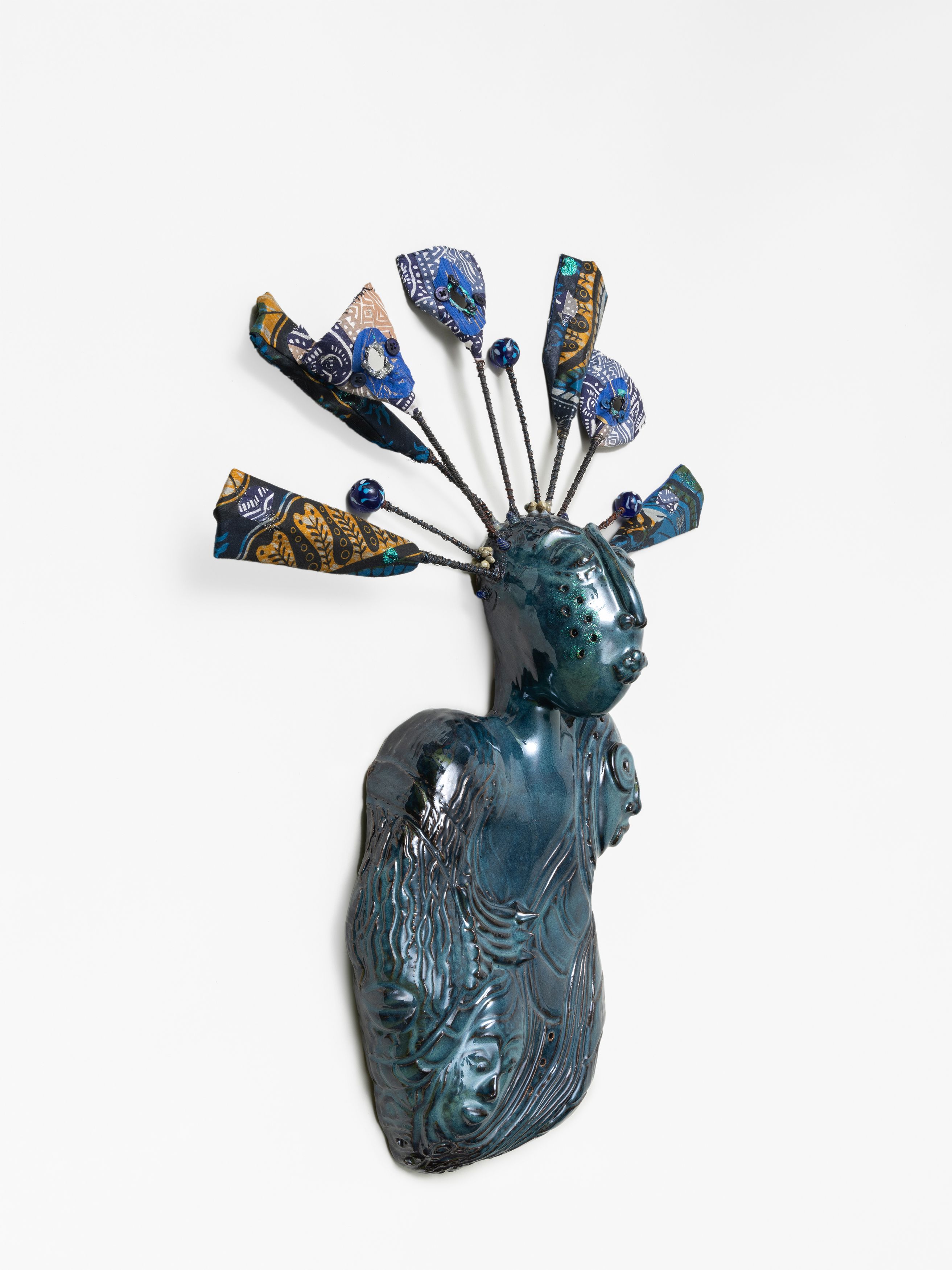 Hand-built stoneware, glaze, wood, wire, fabric, shells, various beads