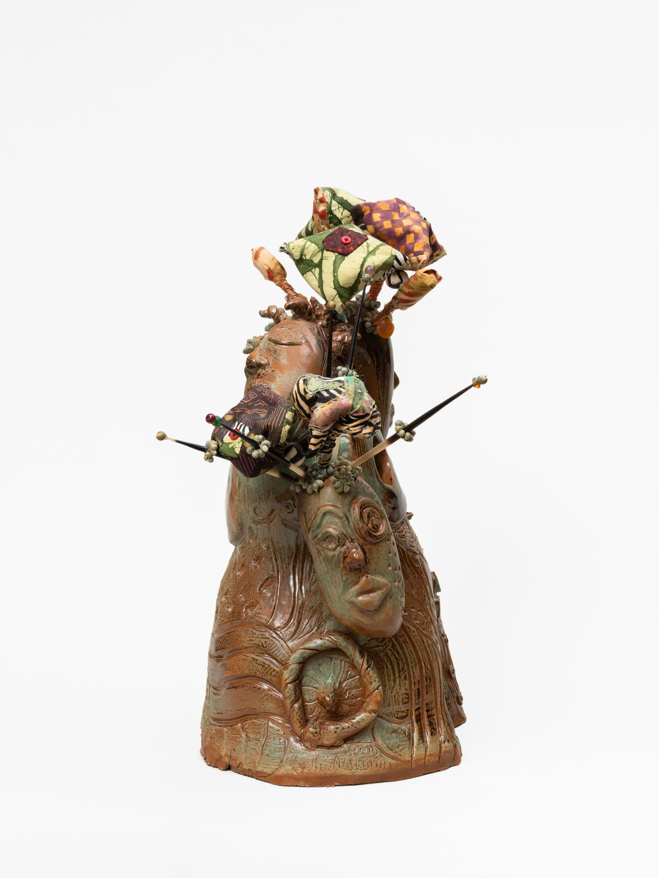 Hand-built stoneware, glaze, wire, fabric, shells, beads, porcupine quill