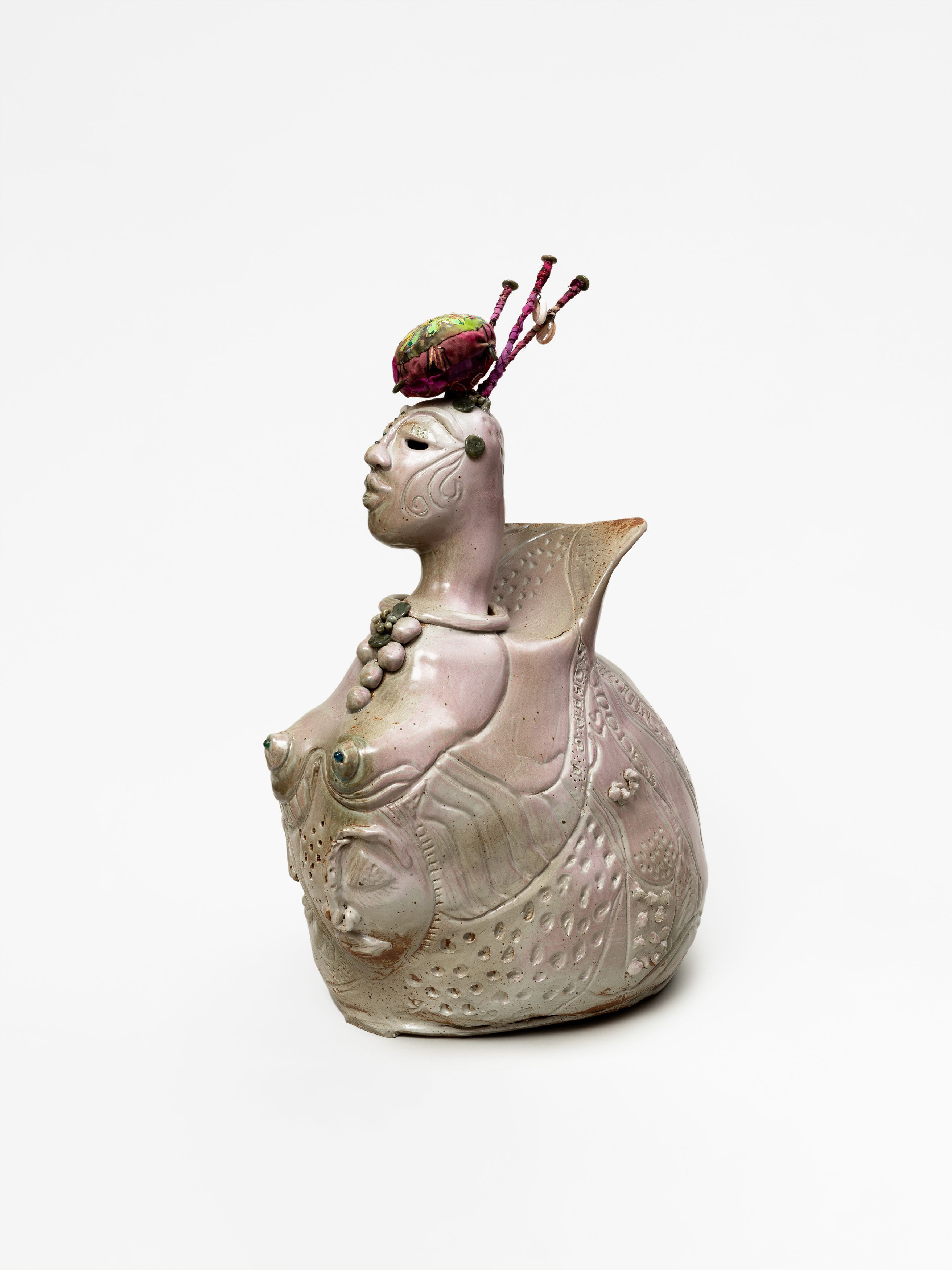Hand-built stoneware, glaze, fabric, wood, wire, cowrie shell, stone, glass, glitter