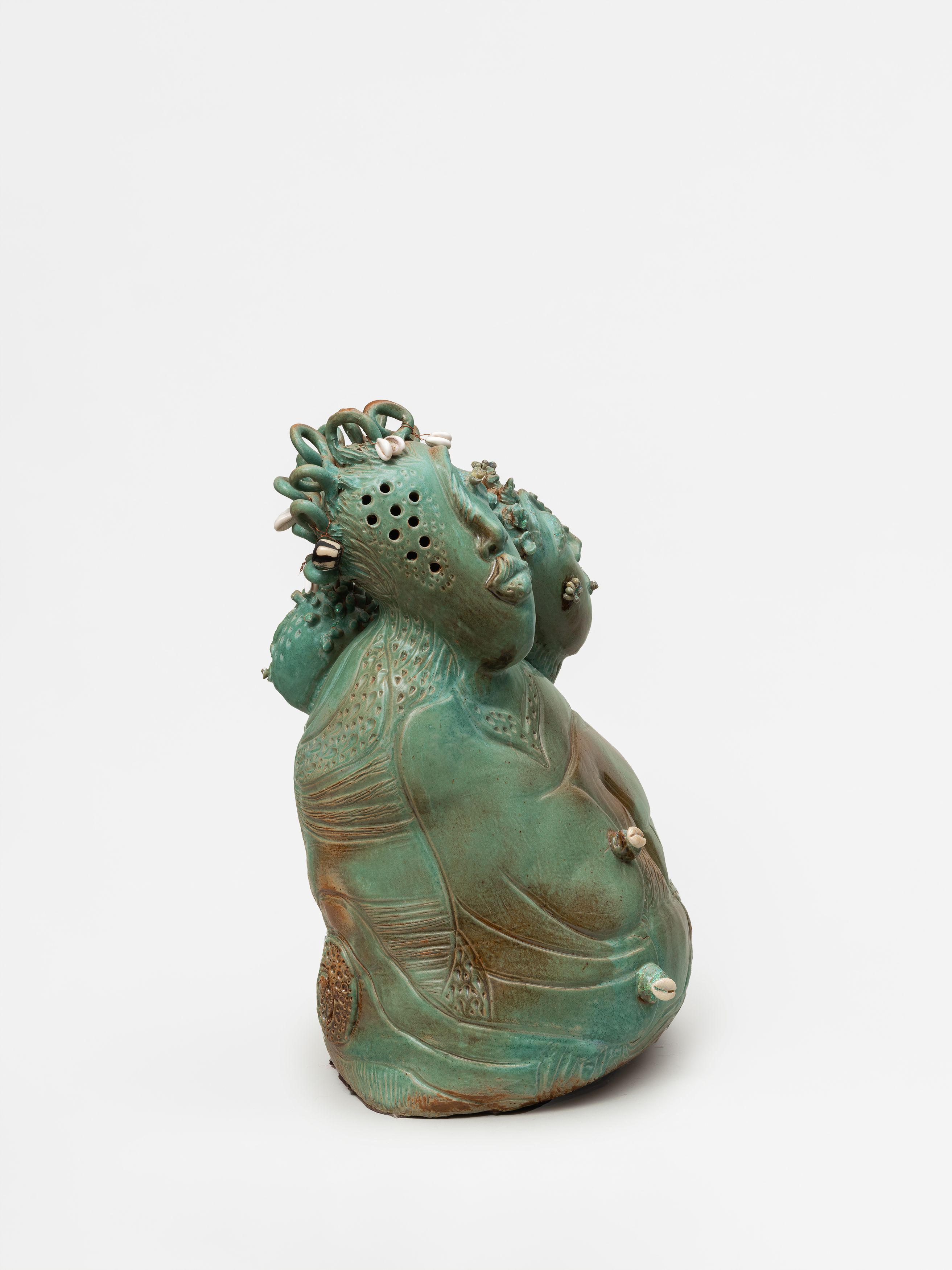 Hand-built stoneware, glaze, cowrie shell, various beads, glitter