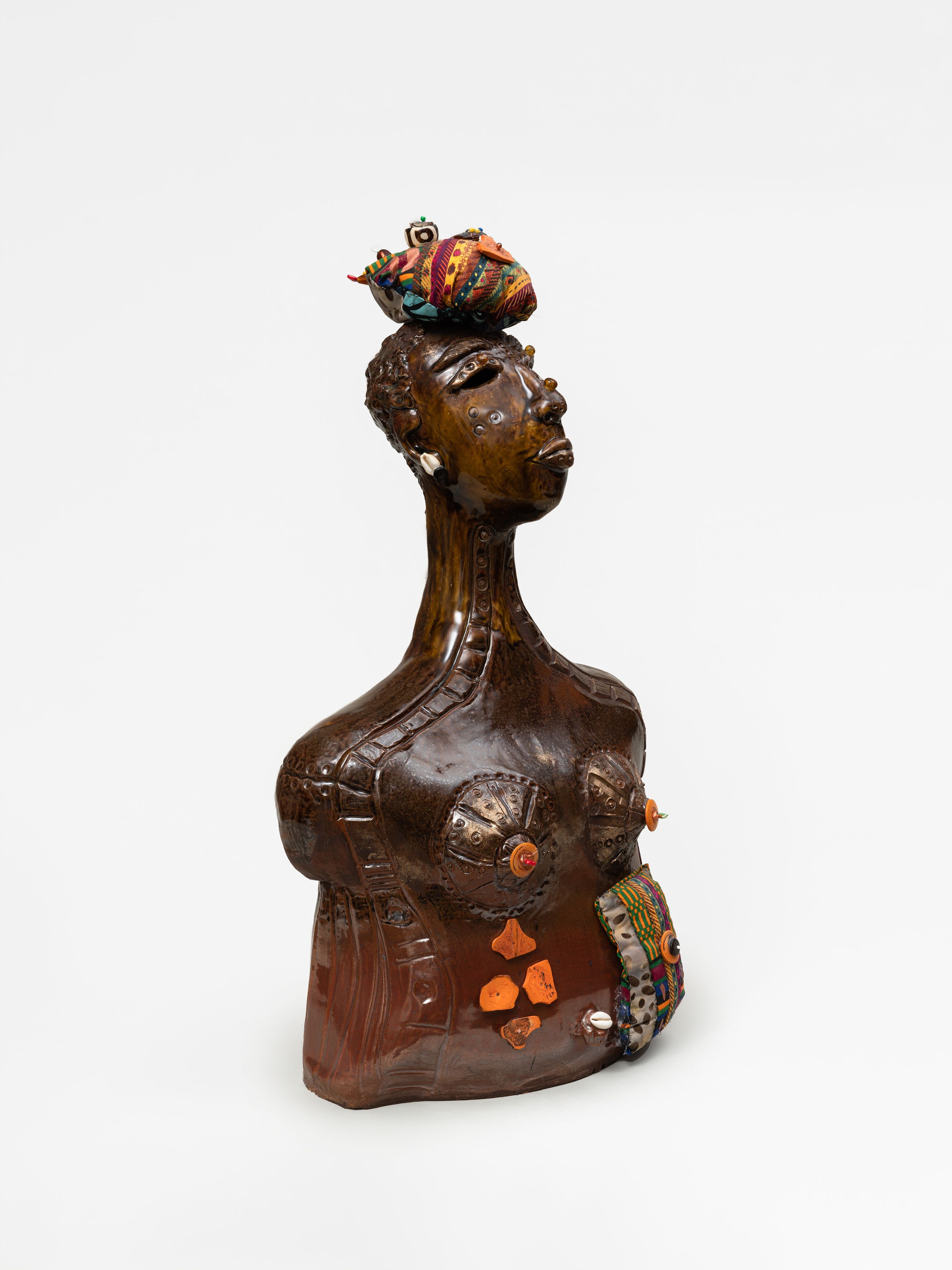 Hand-built stoneware, glaze, fabric, cowrie shells, various beads, glitter