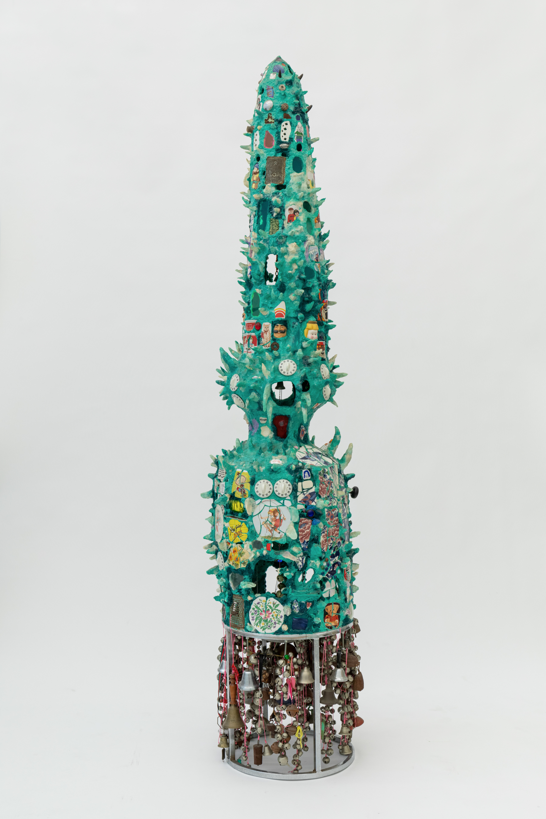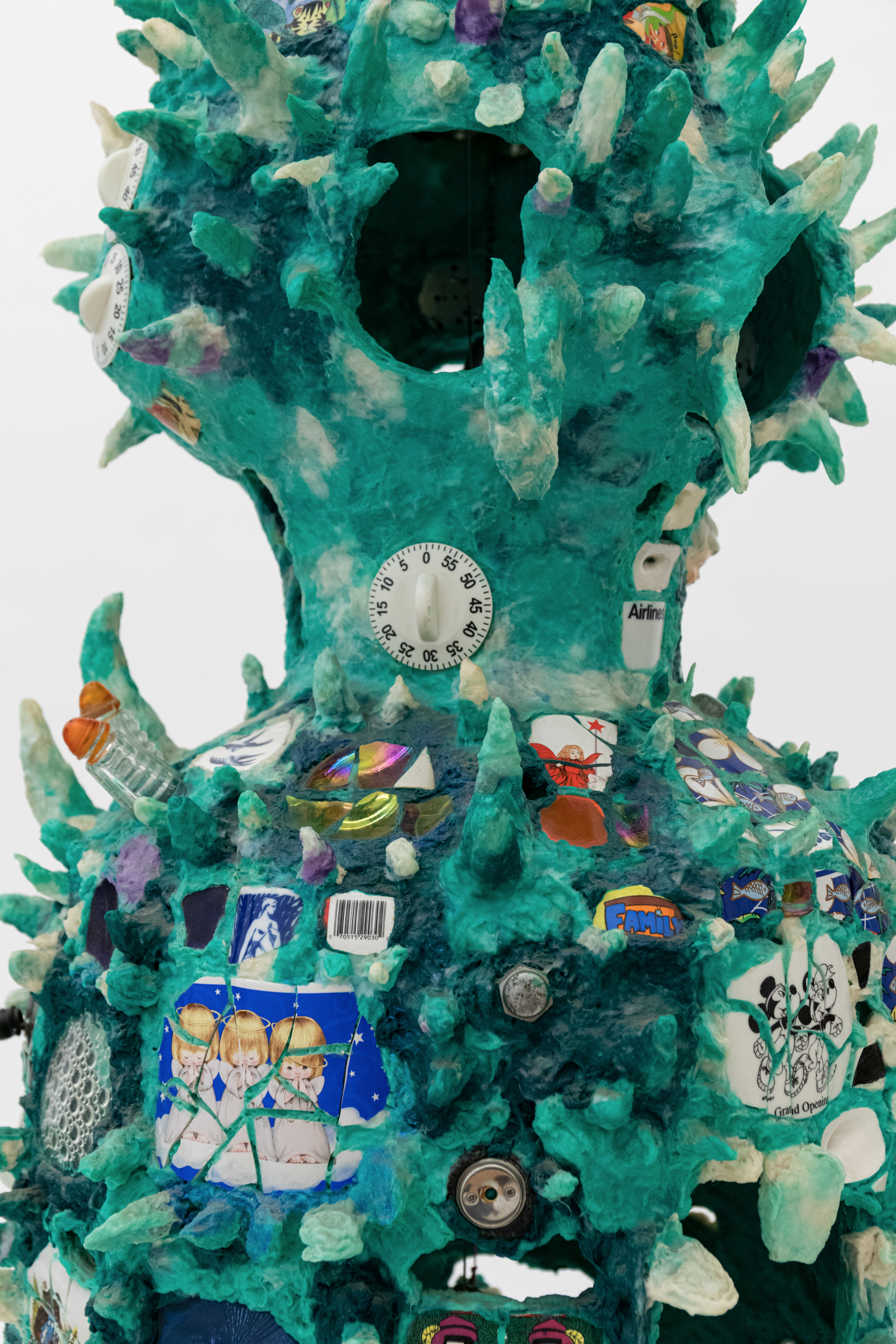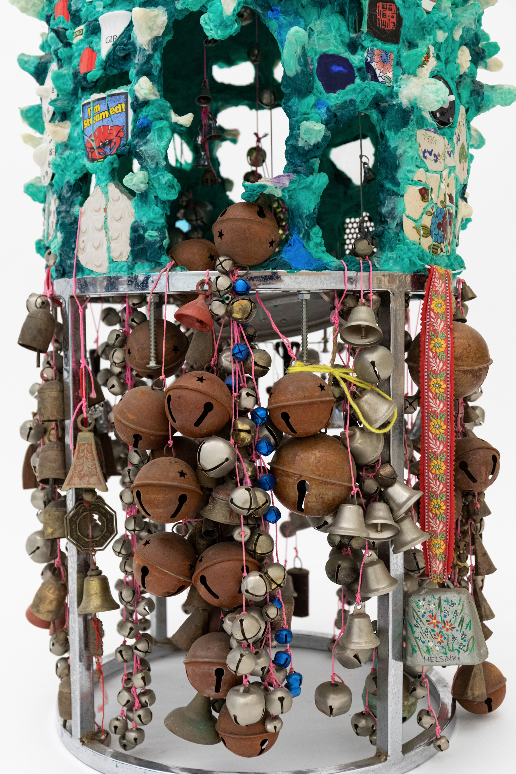 Mixed media including painted cotton, light bulbs, salt shakers, glass, ceramic fragments, doorknob, buttons, bells, string, plastic dials, and hardware
