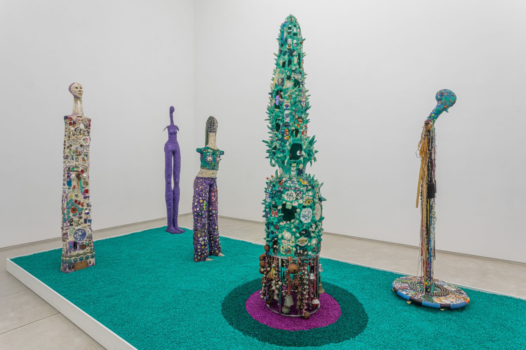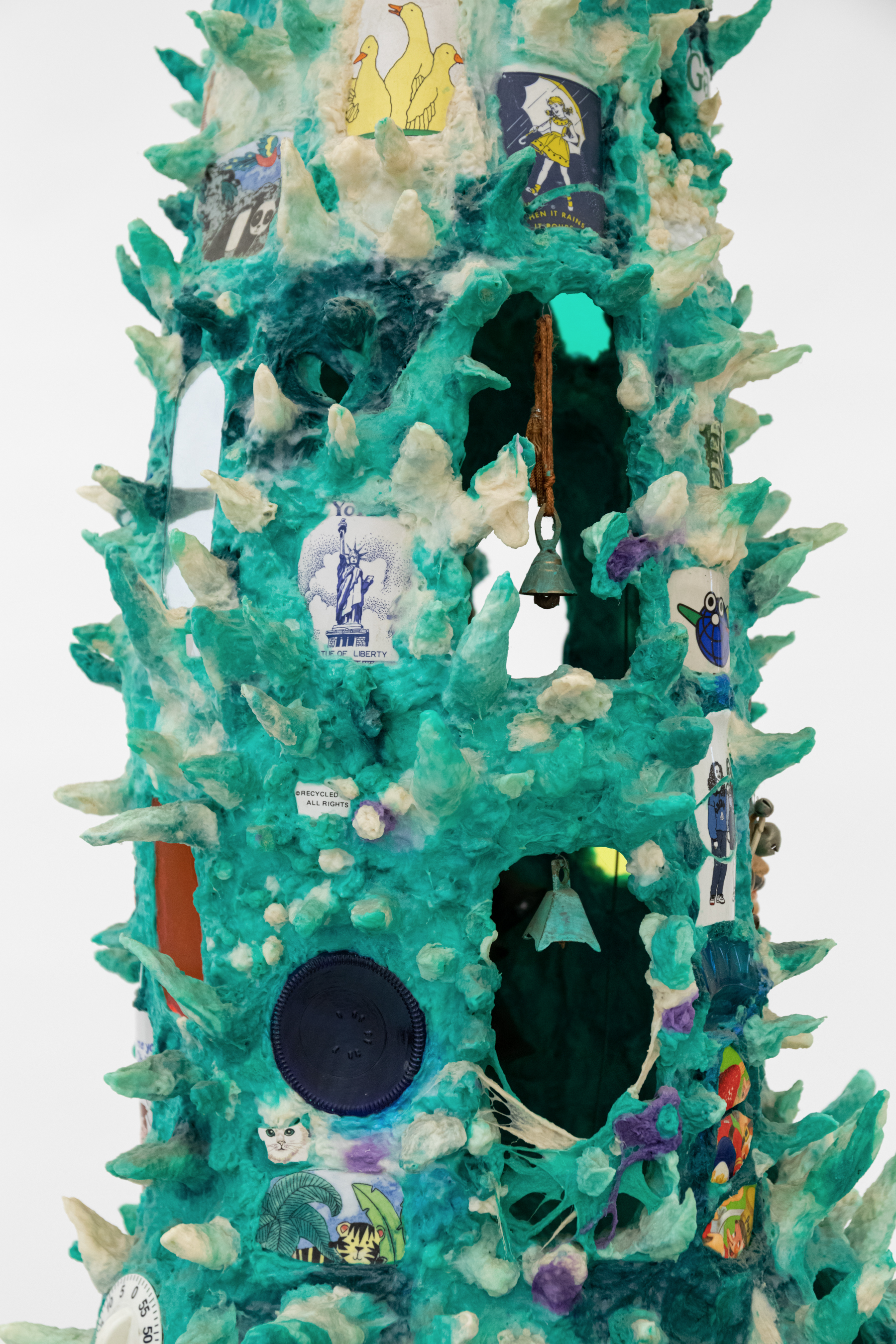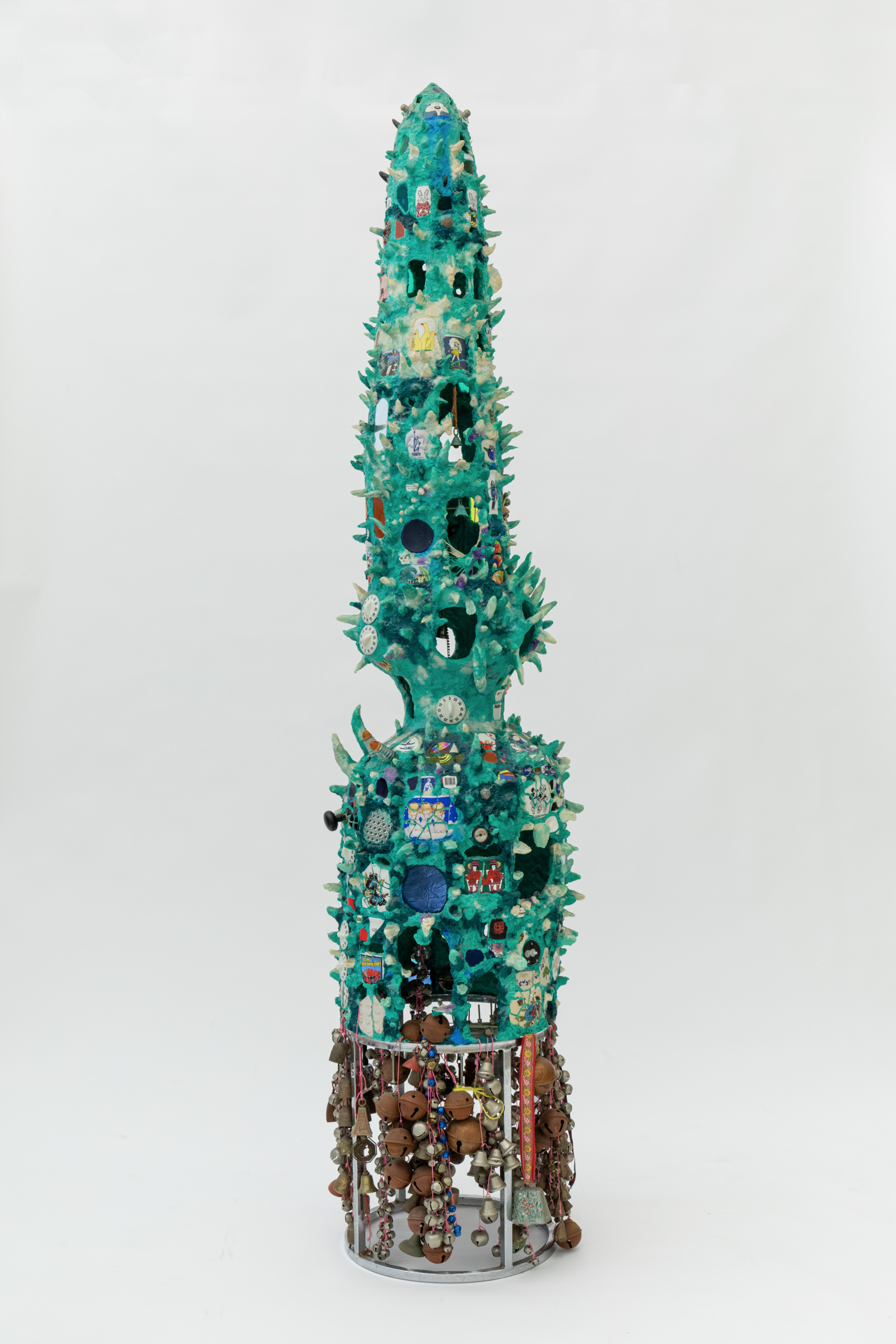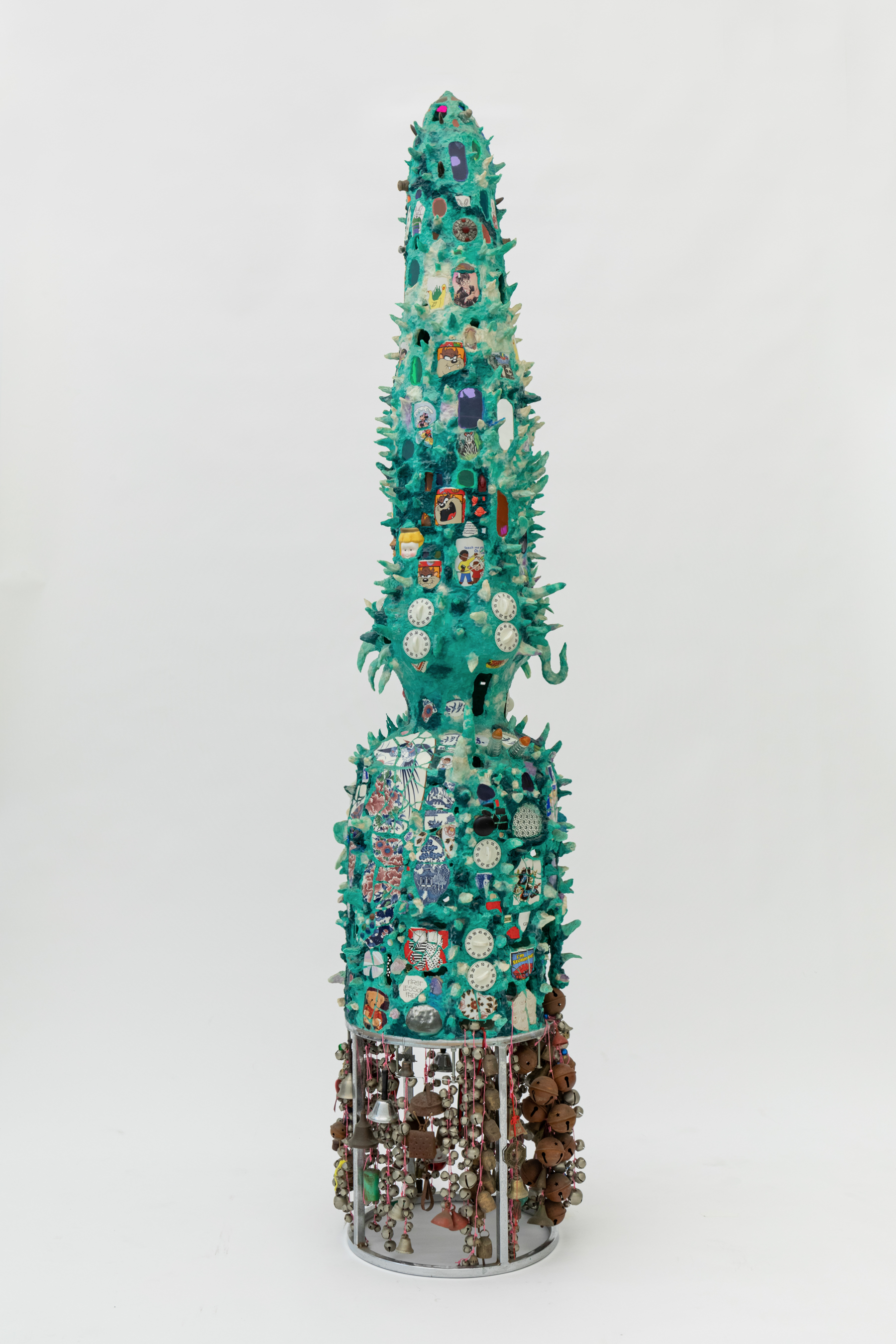 Mixed media including painted cotton, light bulbs, salt shakers, glass, ceramic fragments, doorknob, buttons, bells, string, plastic dials, and hardware