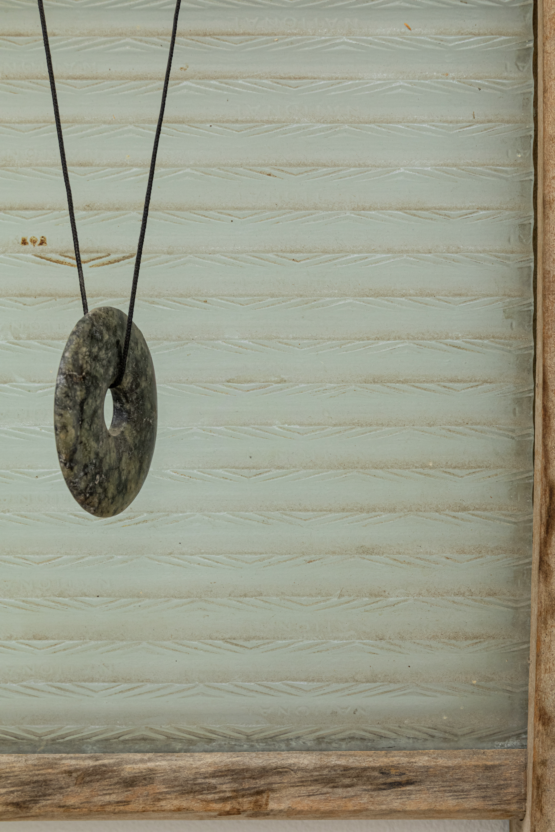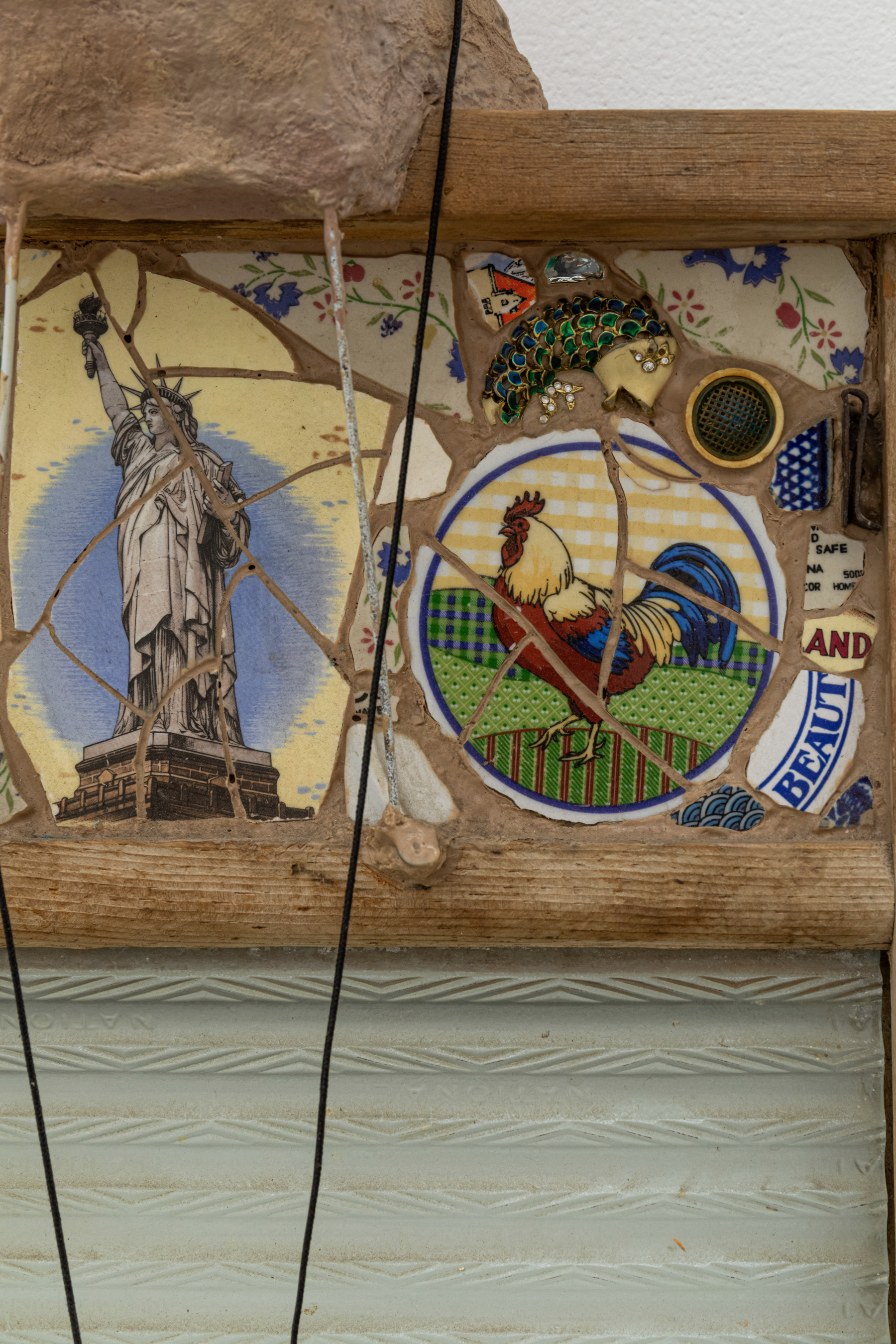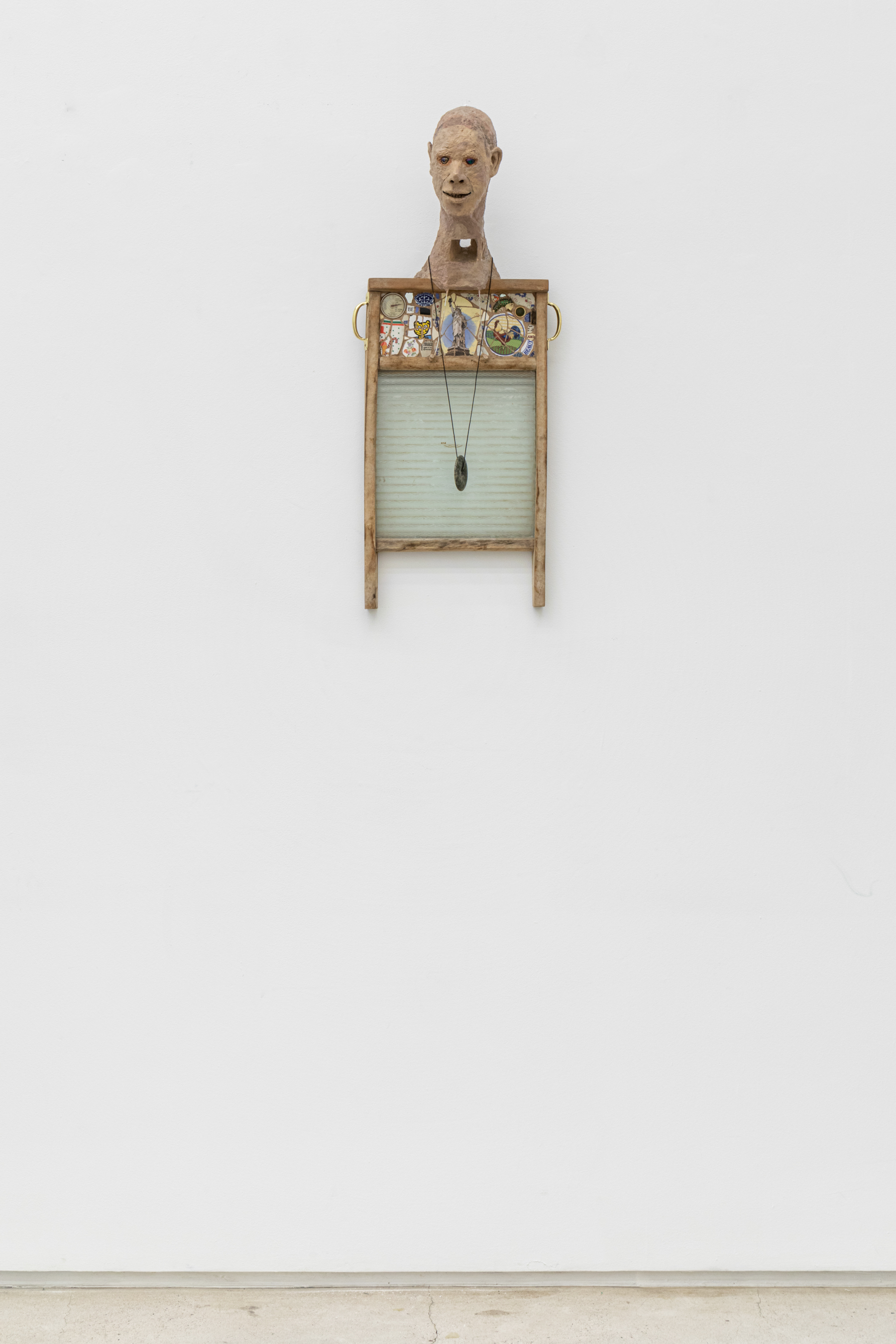 Mixed media including wooden washboard frame, glass, painted cotton, ceramic fragments, metal handles, dials, jewelry, stone, and string