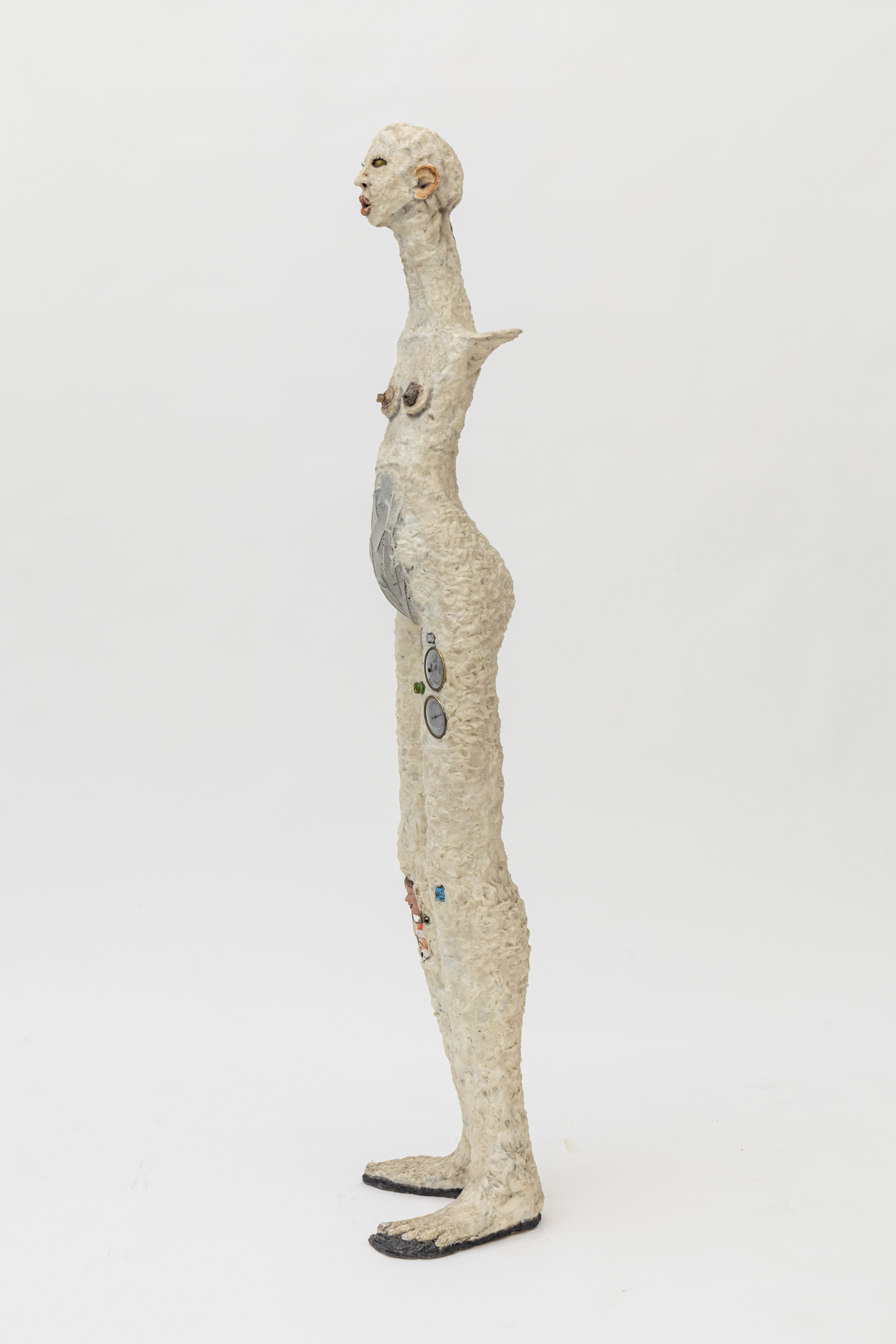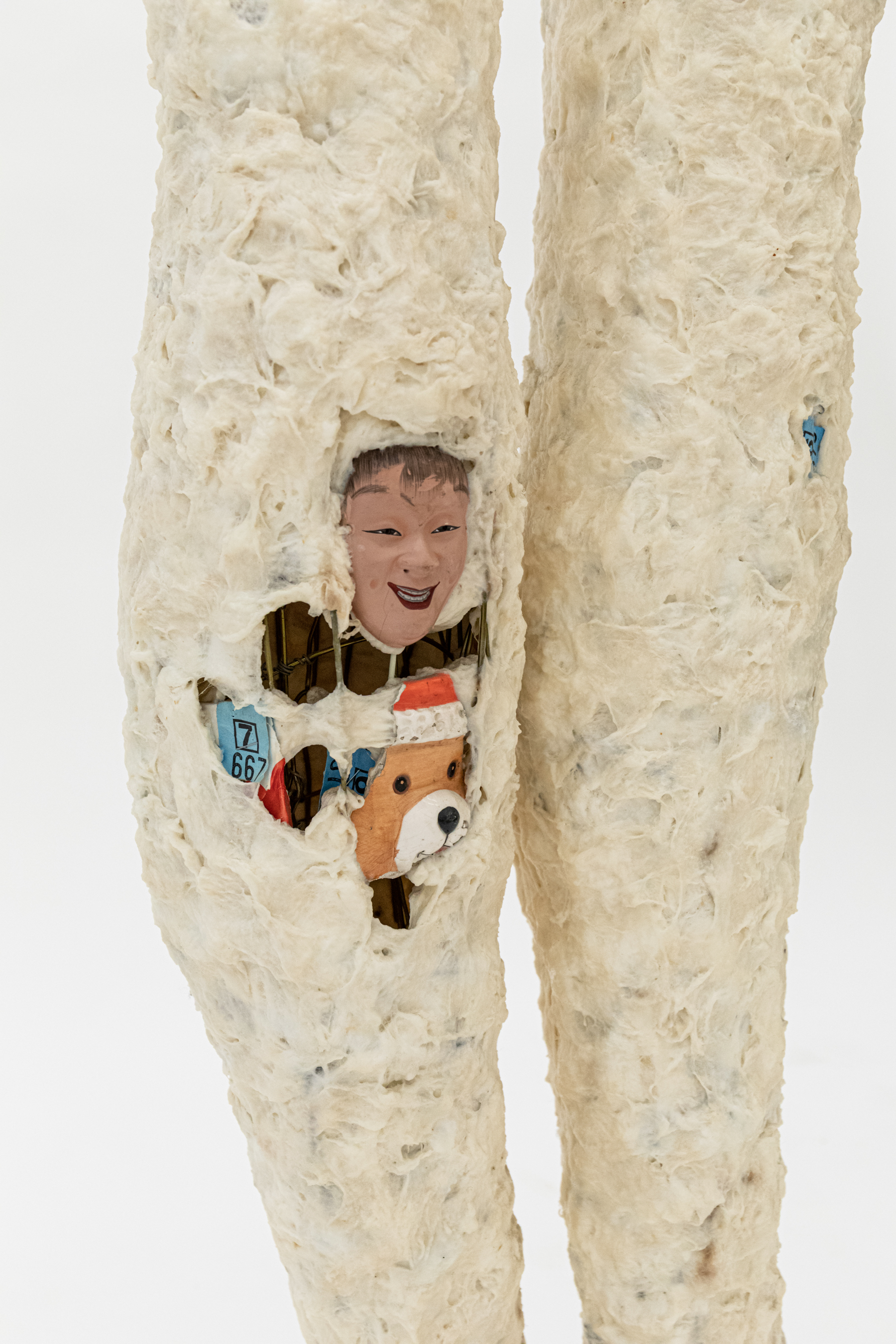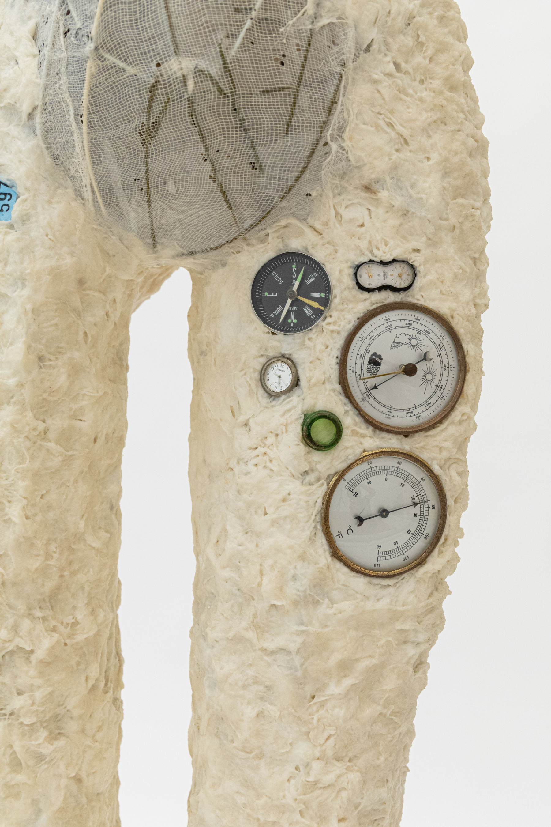 Mixed media including painted cotton, wood, ceramic fragments, dials, metal, cheesecloth, and false eyelashes