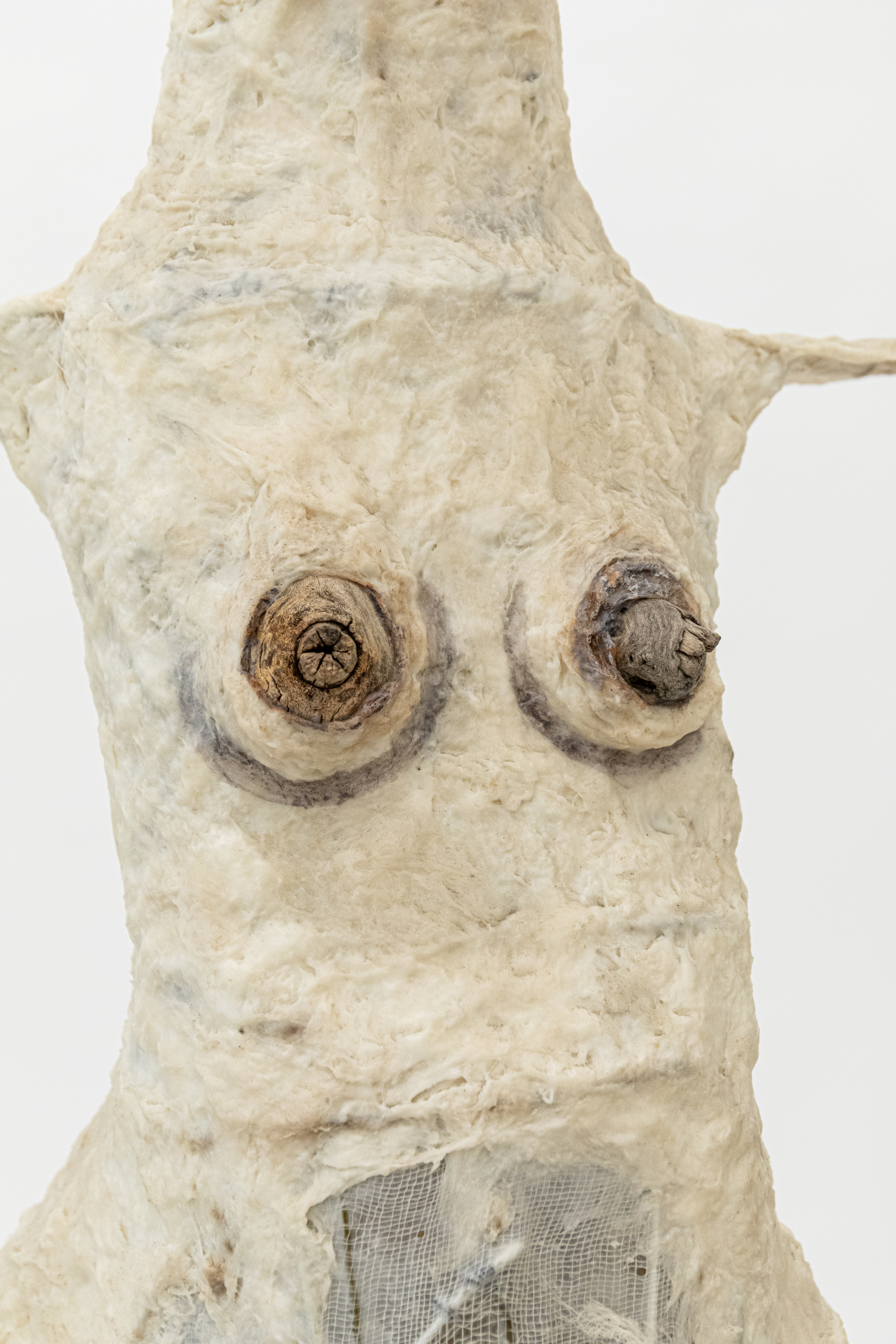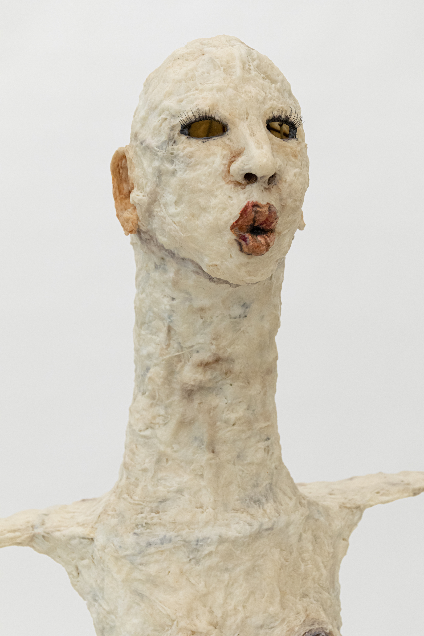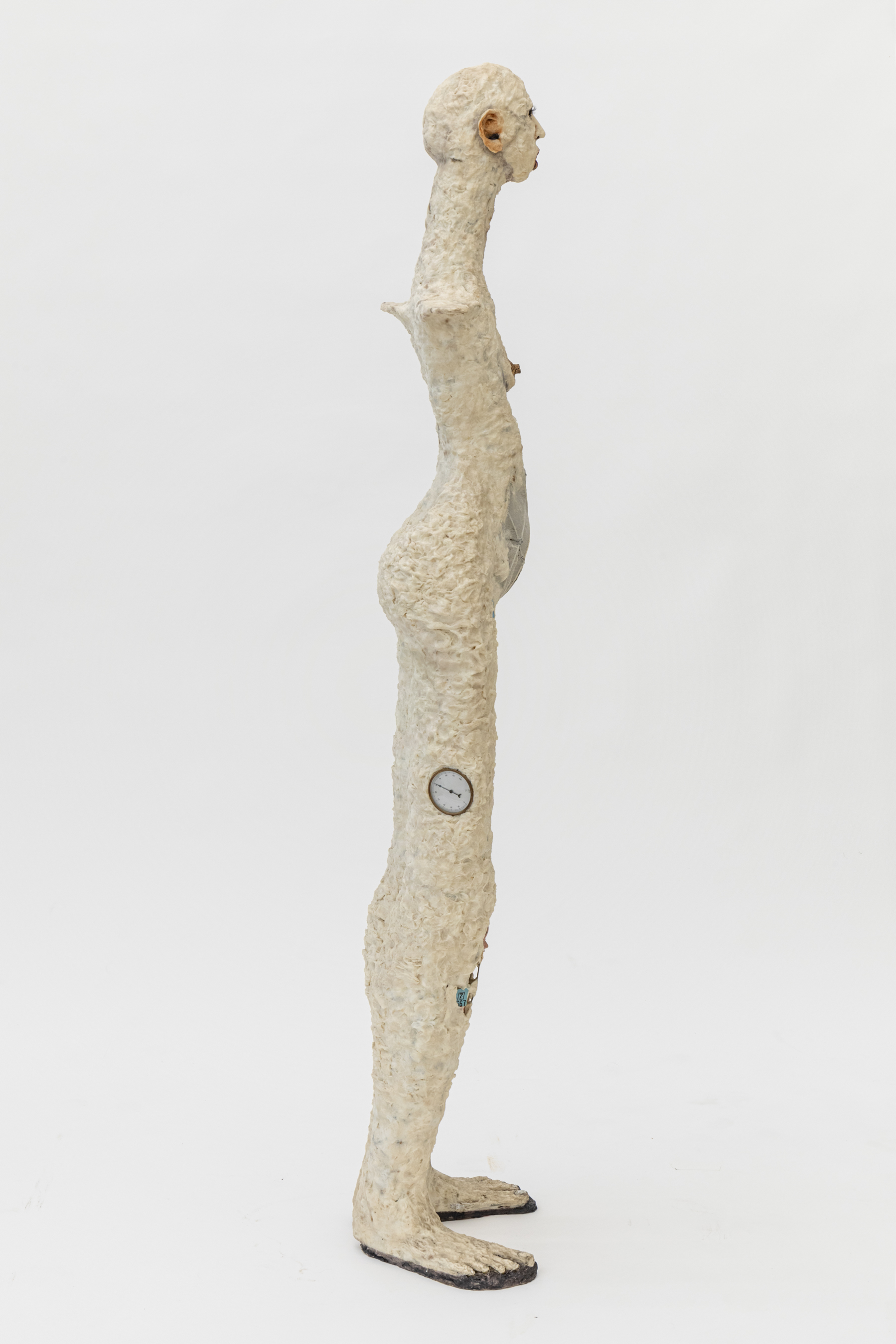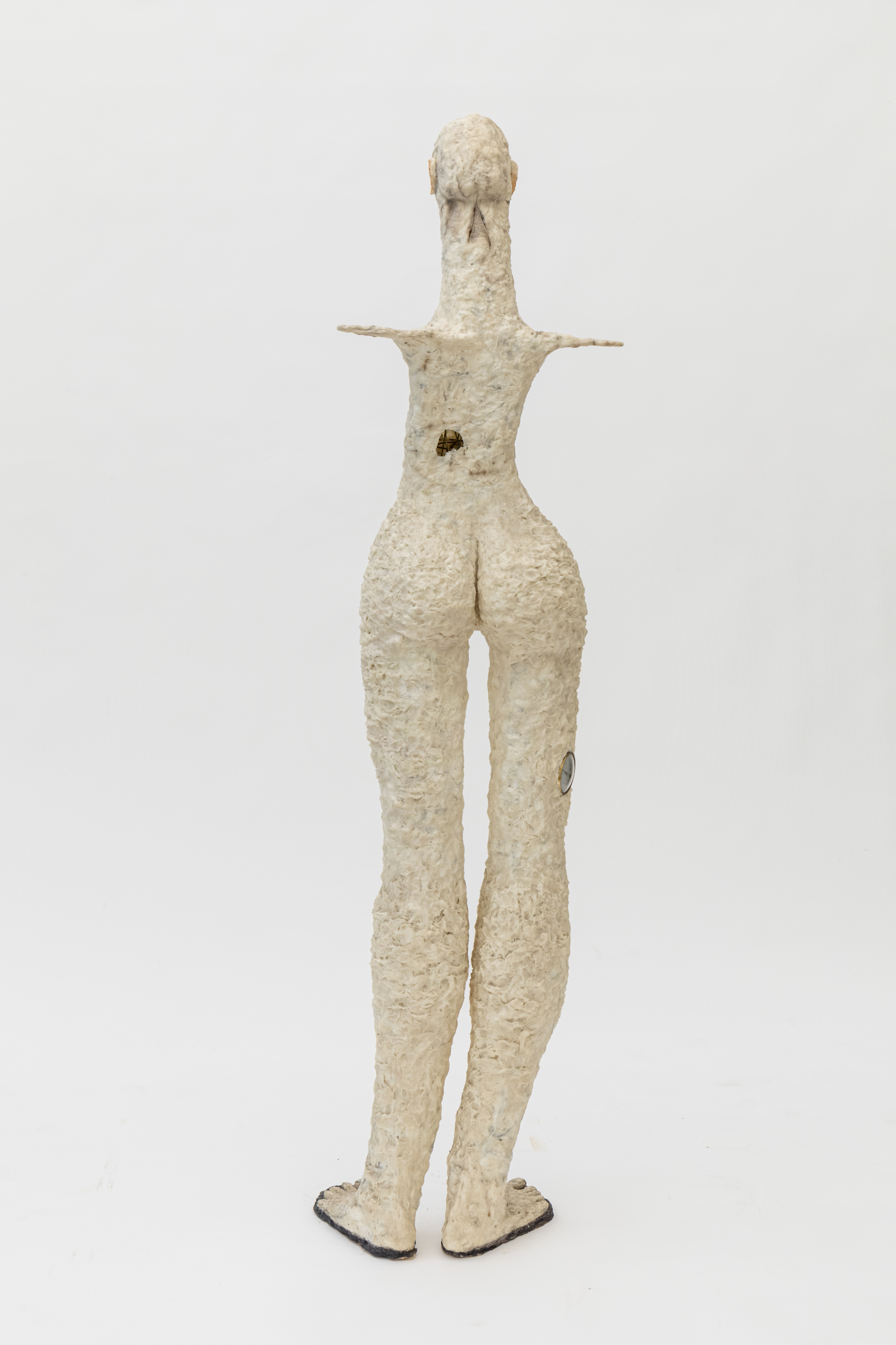 Mixed media including painted cotton, wood, ceramic fragments, dials, metal, cheesecloth, and false eyelashes