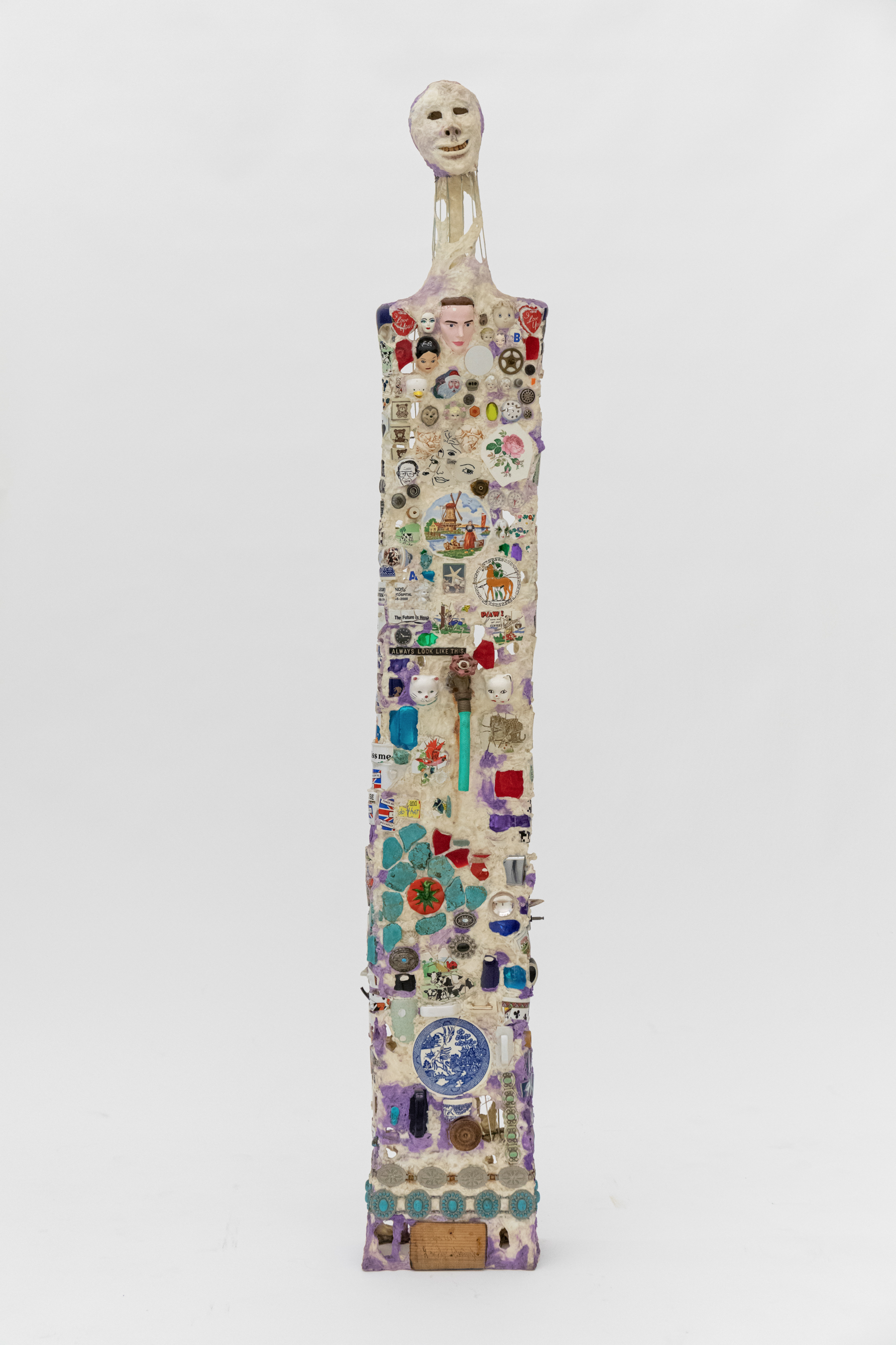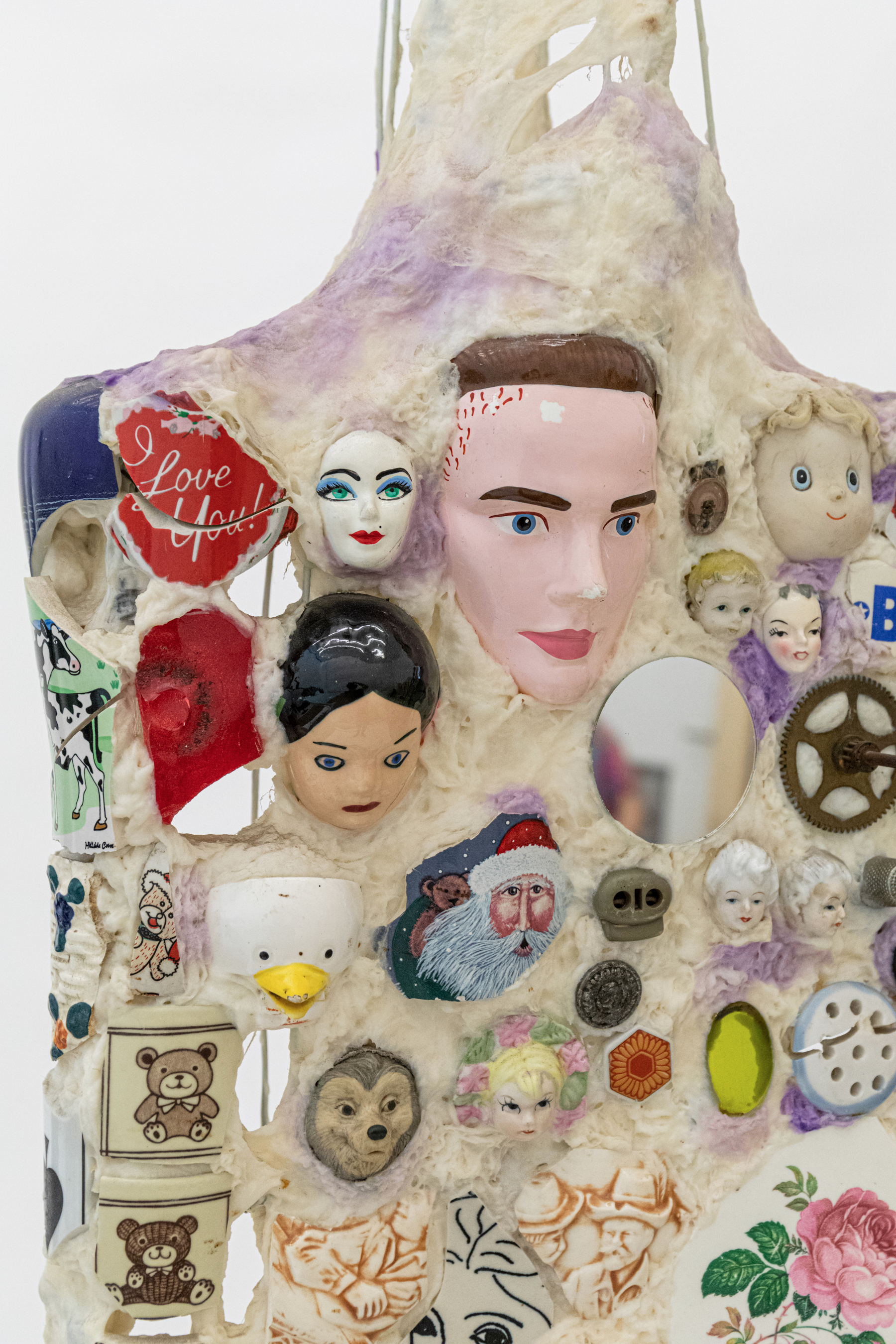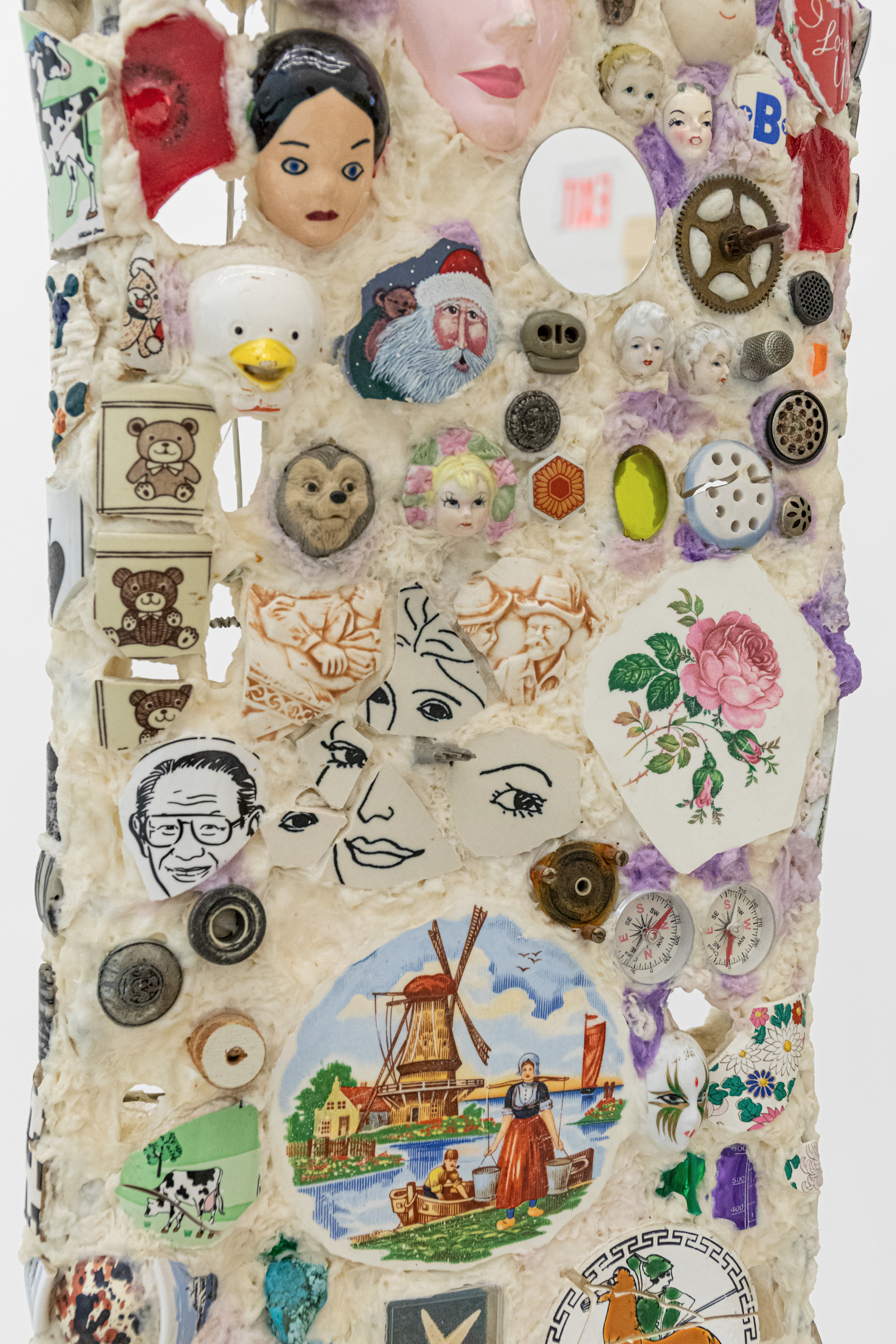 Mixed media including painted cotton, ceramic fragments, glass, mirrors, compasses, dials, metal, metal jewelry, wood, rubber hose, spout, and dice