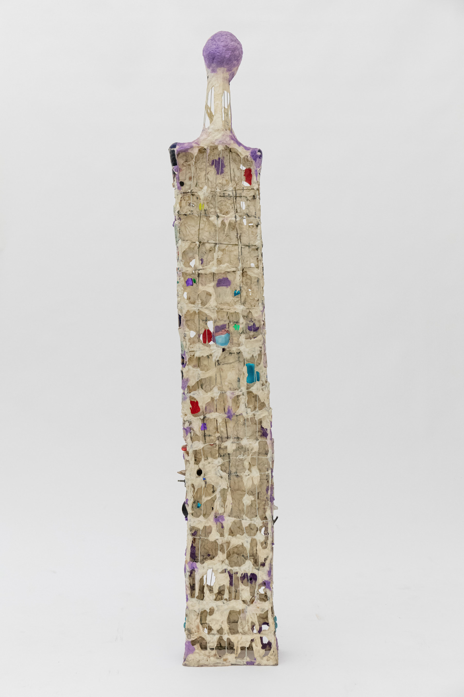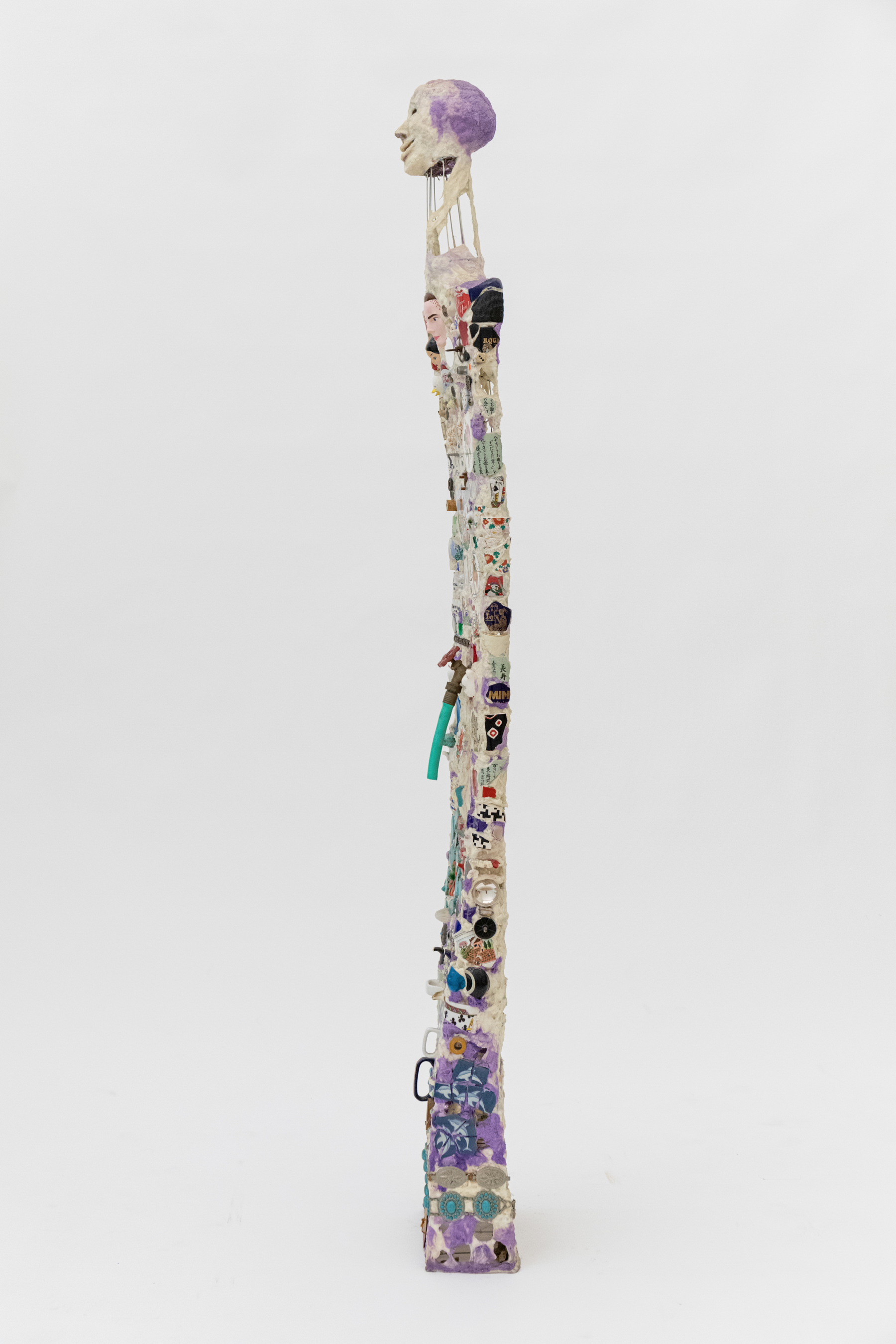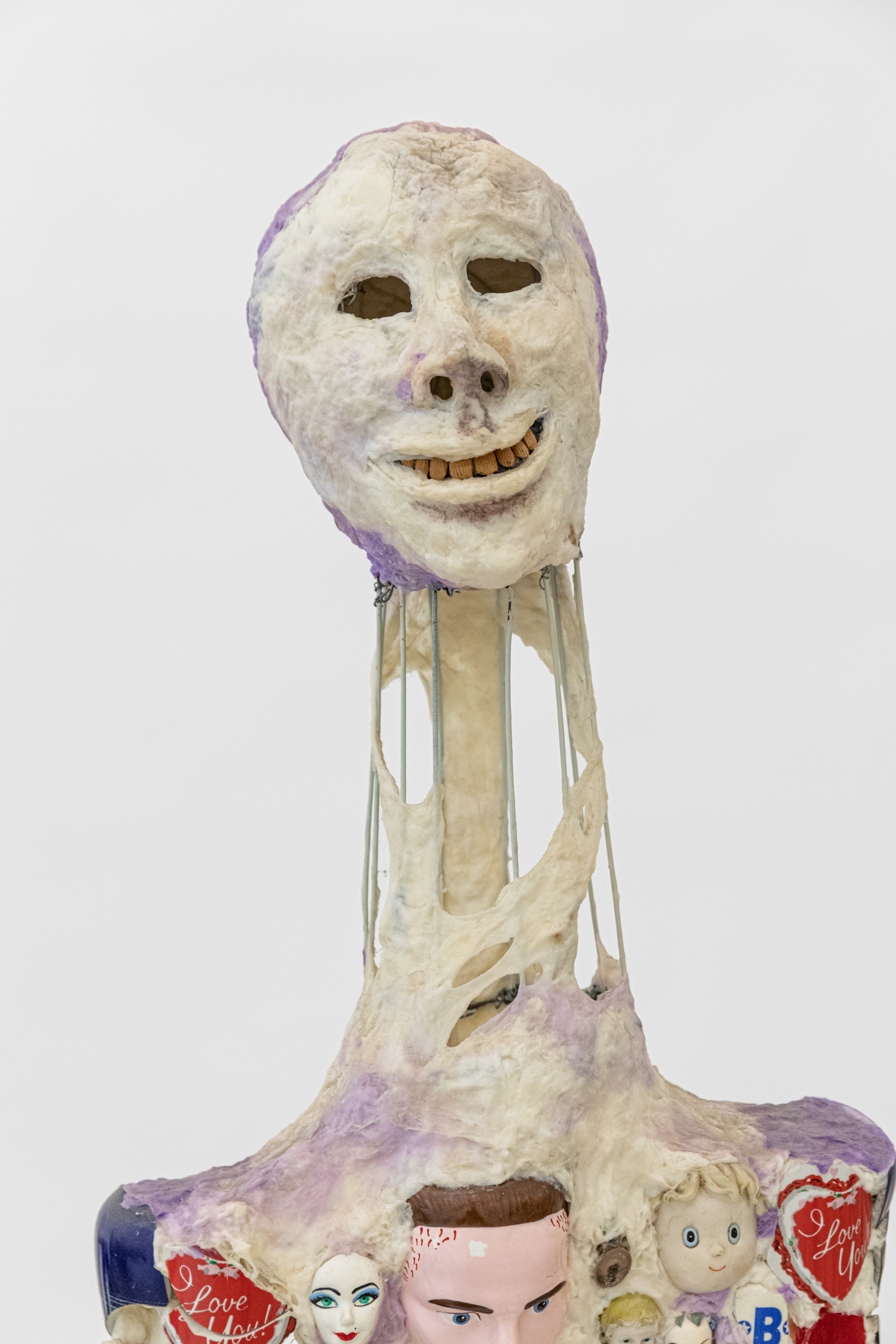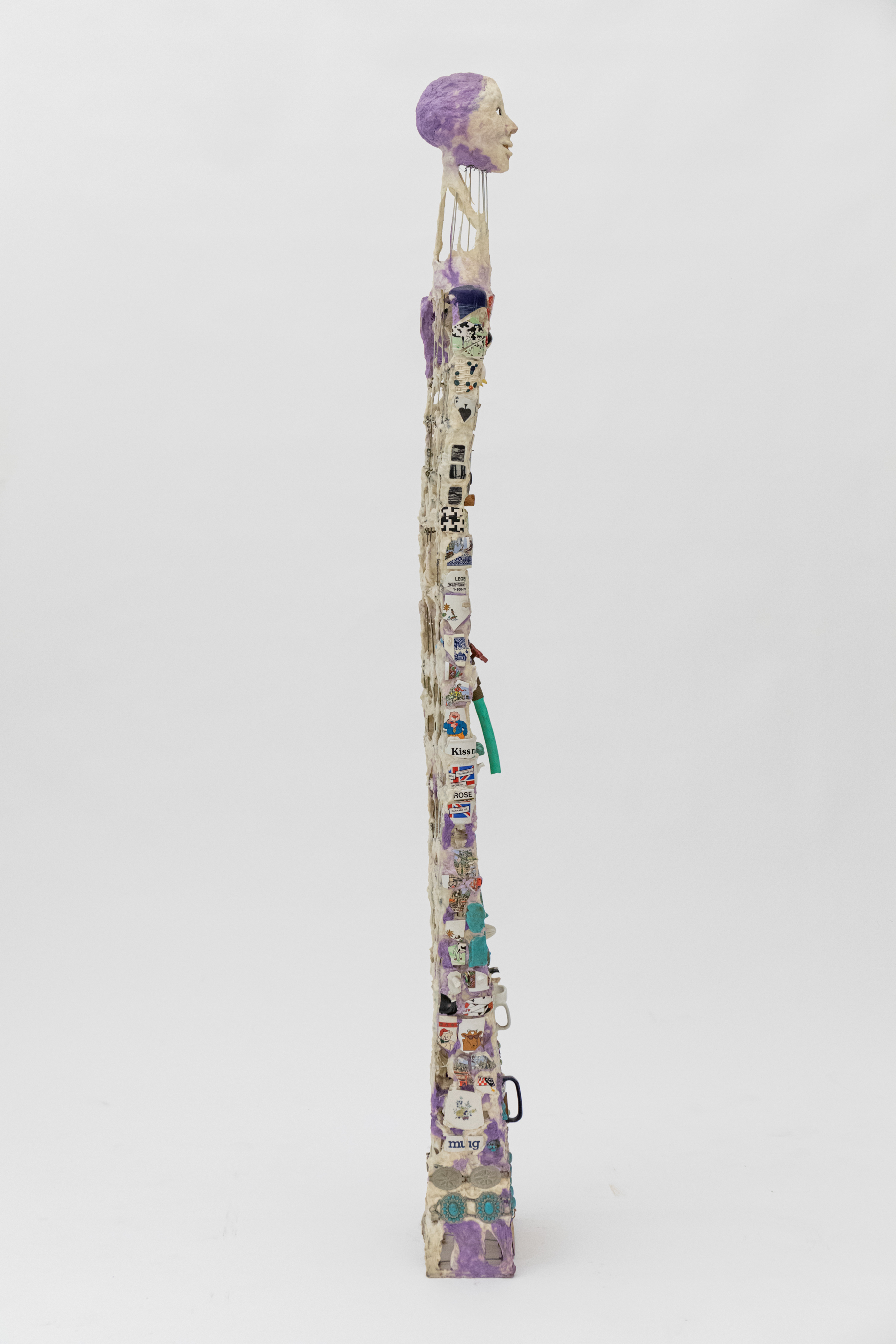 Mixed media including painted cotton, ceramic fragments, glass, mirrors, compasses, dials, metal, metal jewelry, wood, rubber hose, spout, and dice