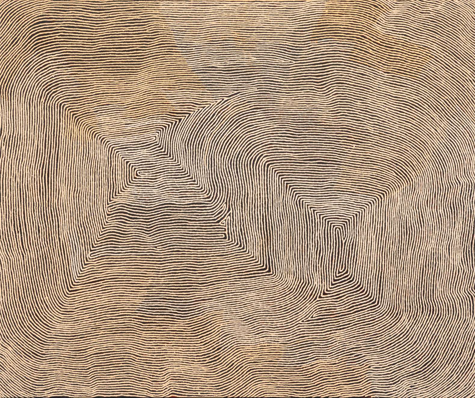 Warlimpirrnga Tjapaltjarri (b. circa late 1950s) and members of his family—including younger sister Yukultji Napangati—lived a semi nomadic life as hunter-gatherers in the Gibson and Great Sandy Desert regions of Australia with little or no outside contact until 1984. His artworks, which have become leading international exponents of contemporary painting from Australia, depict undulating landscapes that oscillate with visual energy. Few painters can match the optical intensity found in his work. Shimmering like a mirage, they pulse and swirl, hovering between the canvas and the eye like an electromagnetic field. The artist generates this effect by painting patterned backgrounds on which he meticulously adds tight, meandering lines composed of thousands of dots. These lines and switchbacks correspond to mythical stories of the Pintupi people and the formation of the desert in which they live, operating more as mnemonic devices than representations of narrative or visual memory.