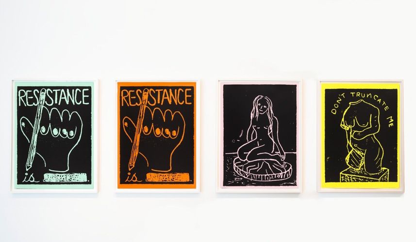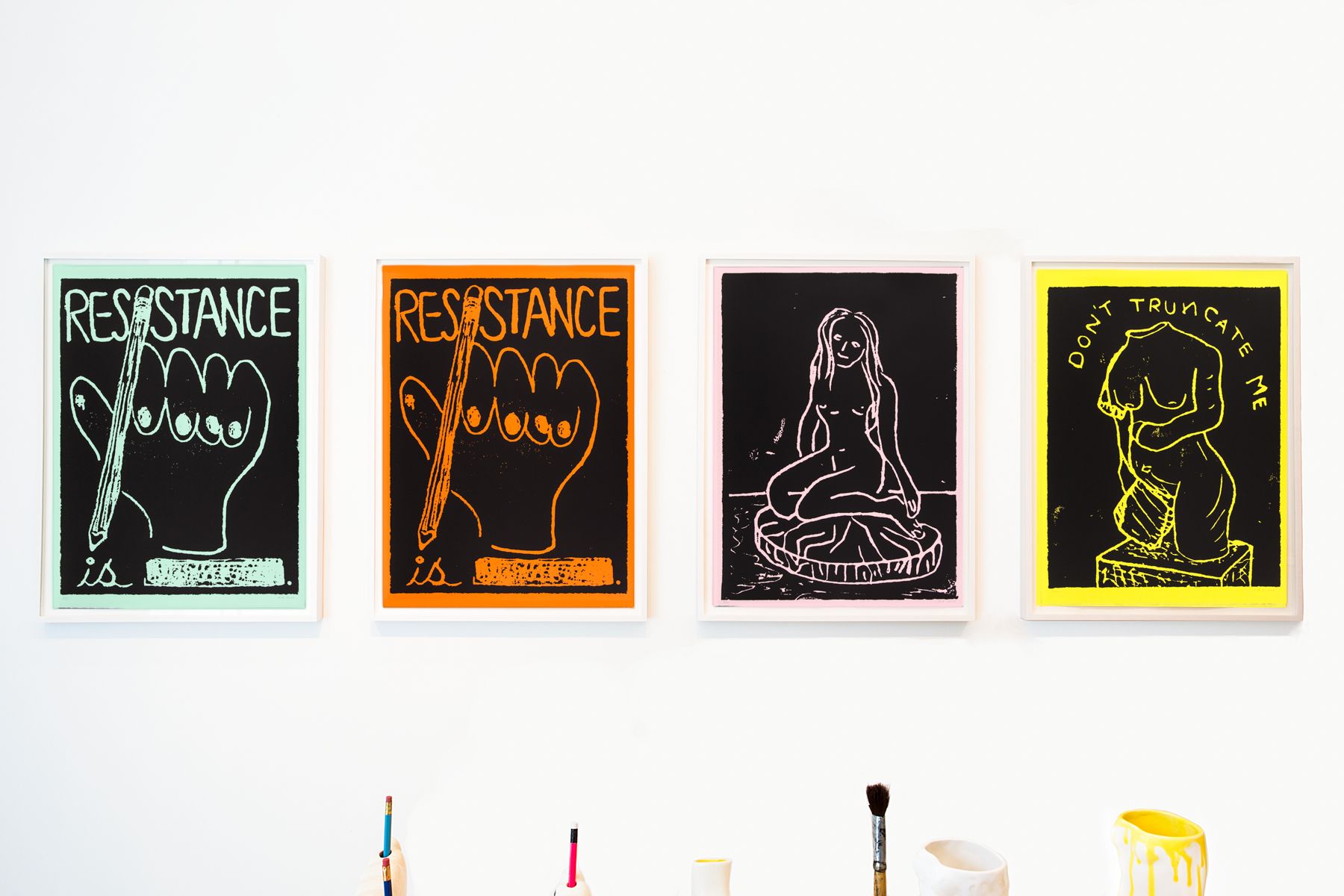The persistent development of a figure is also seen in her short films, where the small porcelain figurines she is known for painting on a large scale are the “characters”. In Daughters of the Revolution, a flea market troupe of small ceramic tchotchkes come together and join forces to hold a protest of a few seconds duration. One stop-animation film presents drawings of sculptures in a garden enjoying a daytime interlude. In Sunny-Side Up, Venus de Milo salt and pepper shakers cheaply refashioned with small heads and oversized breasts are seen repositioned, journeying across a kitchen to perform their functional duties. The Green Head considers a single sculptural head through different lenses, filters, and lights, like Monet’s Haystacks via the various filters of smart phone camera apps. The videos can also be viewed as moving portraits, slipping into still-life and taking up the concerns and genres of traditional painting. In conjunction with the paintings and videos, Bessone developed a series of ceramics, silkscreens and vinyl prints in various sizes that reiterate ideas about obsessive rehearsal and insist on a variable material, scale, and shape of the female body.