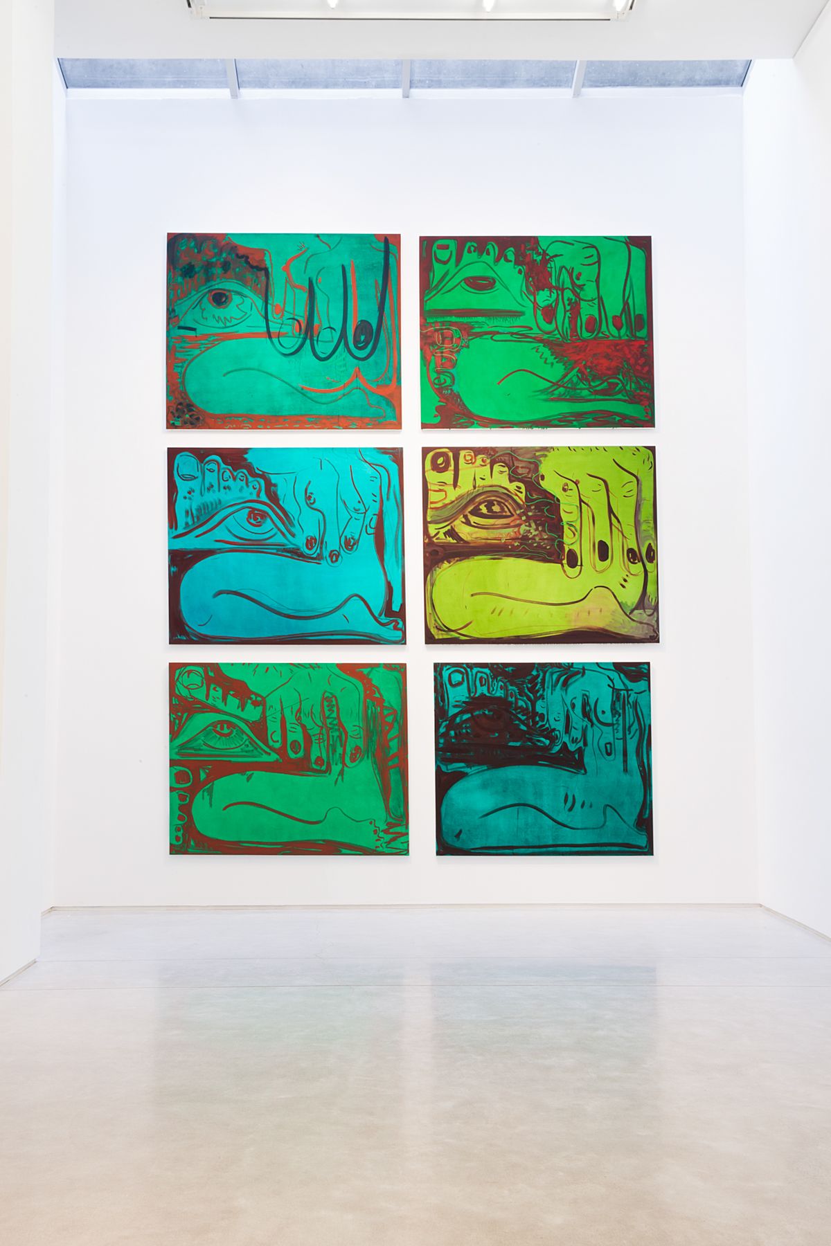 Bessone presents several red on green paintings of a single female figure fitting the canvas frame in a truncated foot-to-neck seated profile view. Bessone uses the body as a framework and motif to repeat and reconsider. Bessone insistently re-adjusts the figure and color in each composition to both sustain a prolonged interest in a single, sketchy body and to refine a serious study of the gaze through slight and vigorous variation. With subversive suggestions of only parts of a nude, the central unidentifiable figure is represented without a literal relationship of body parts to one another. A single eye, foot, or breast is detached and embellished, and in some cases, merged with unlike parts functioning like a pictograph or hieroglyph. This painterly push-and-pull allows for figures that are positioned and repositioned within single compositions, strangely shifting in scale and vibrating between two and three dimensions and painting, drawing and writing. The contrasting use of red highlights on green grounds underscores the variation, as does the juxtaposition of these canvases with one another in Bessone’s careful configuration of the pieces in the gallery. Some canvases appear black on blue, purple on green, and some a heightened crimson on jade. Bessone tweaks the degrees of hue and gestures of shape just so, in a slowly and steadily intensifying inquiry into the painted representation of the body.