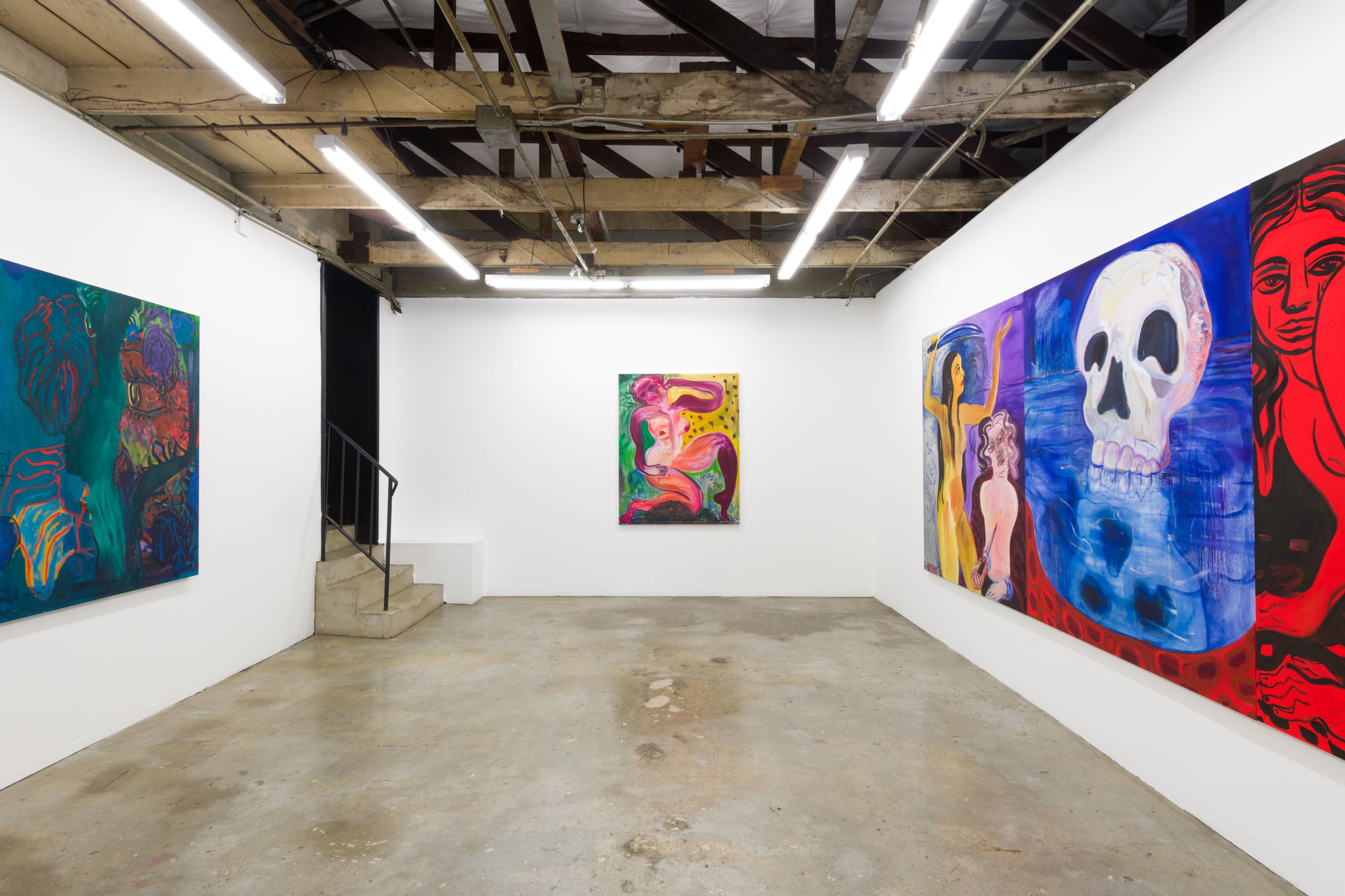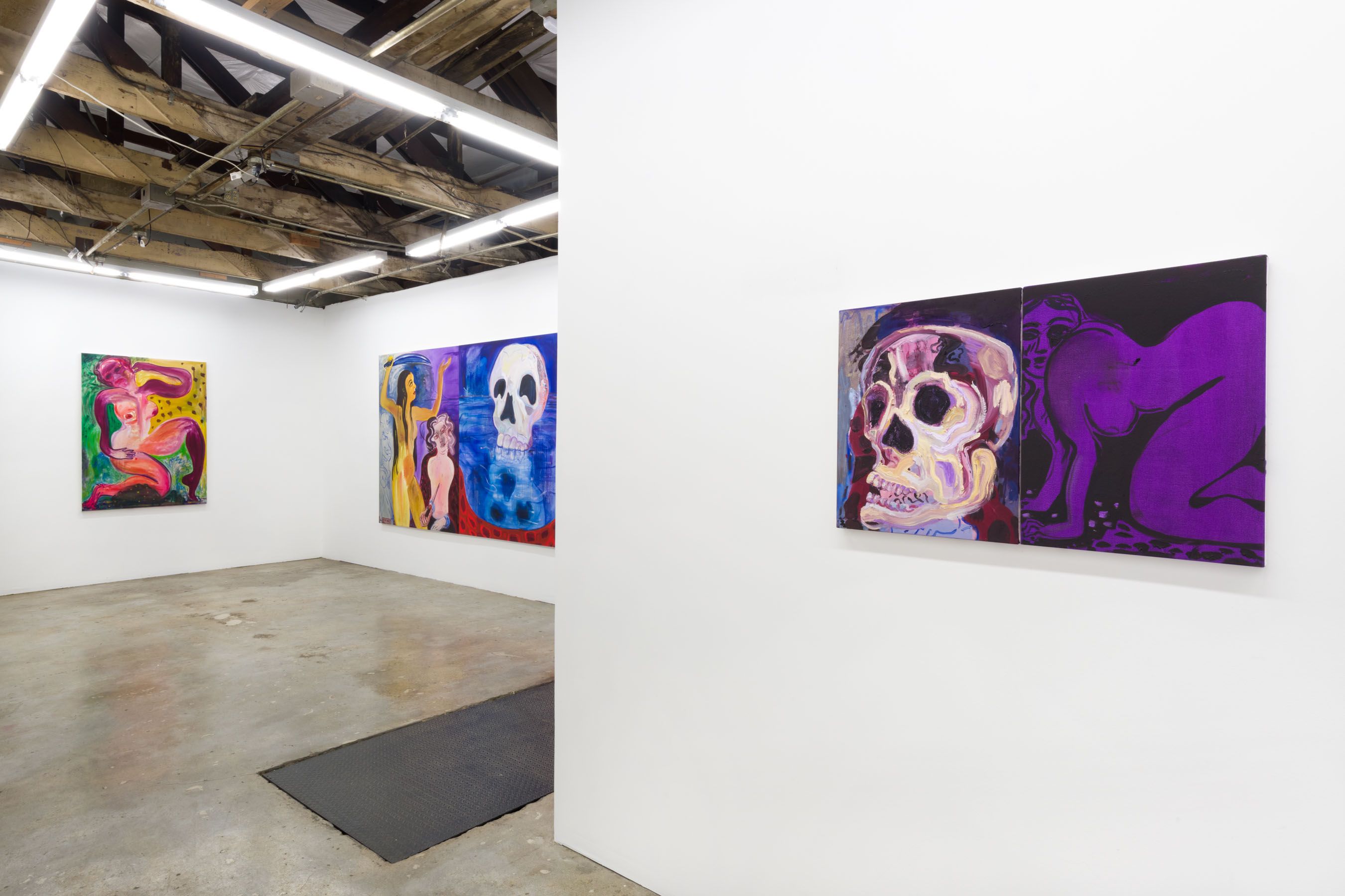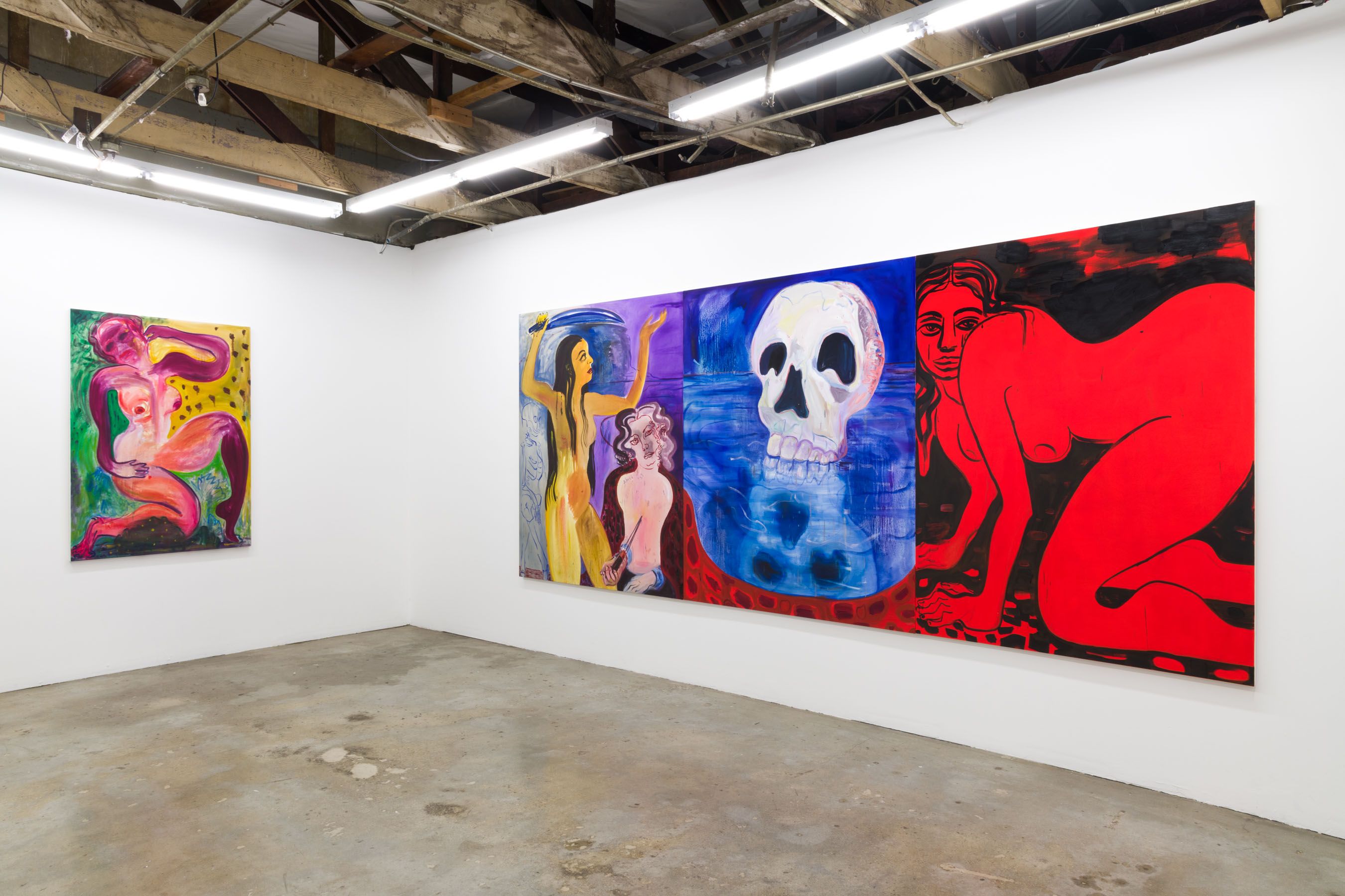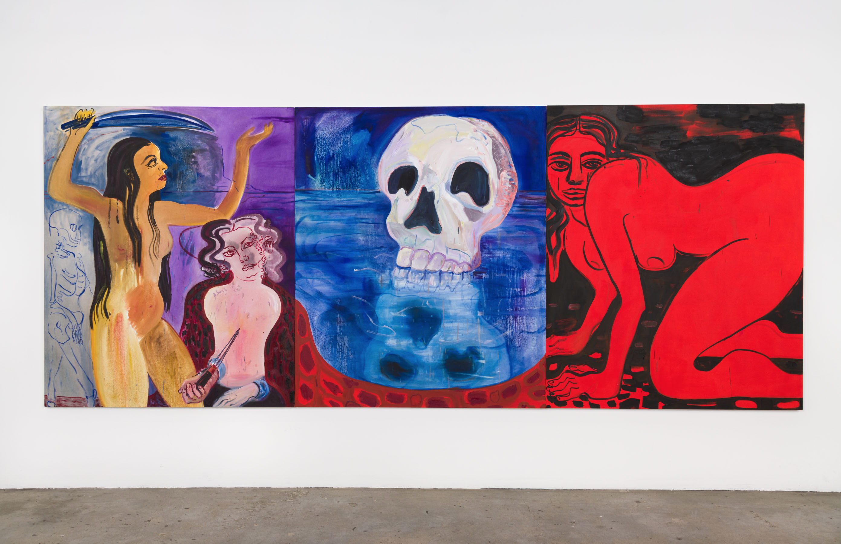 On the opposing wall is the even larger painting Weapons were Drawn, Sacrifices were Made, Battles were Waged, Pleasure was Had. Unlike it’s facing neighbor, this triptych is made from three distinct panels, each painted differently and featuring a unique archetypal image made singular through their juxtaposition. The left panel consists of three figures; two naked women holding blades and a skeleton. The central panel focuses on a large skull springing up like an island from a murky body of water. The right hand panel is painted in a reduced color palette of black and red depicting a nude woman on all fours. Whereas In the Valley of Exes creates a cohesive environment and mysterious narrative based on the display of the nude female’s body, the second triptych reads as three singular pictures in conversation purely by their proximity to one another.