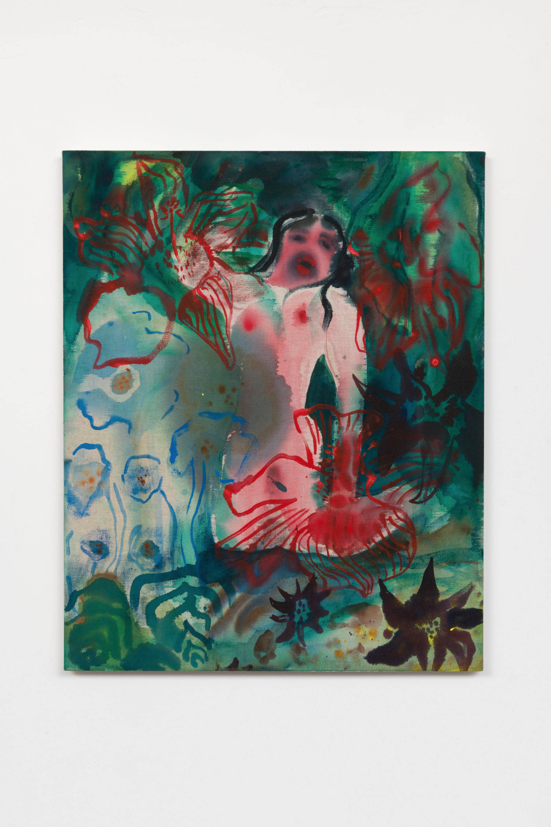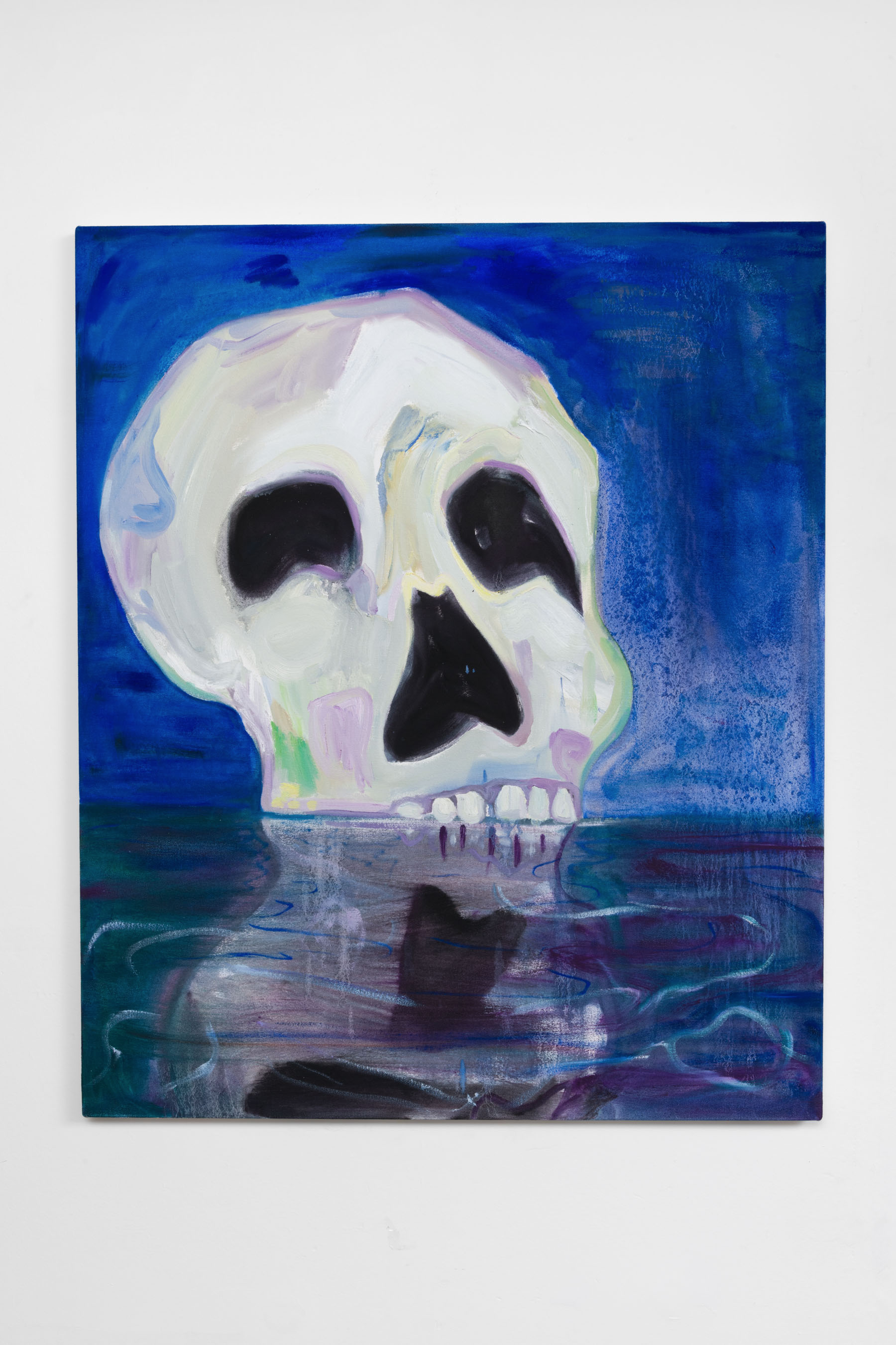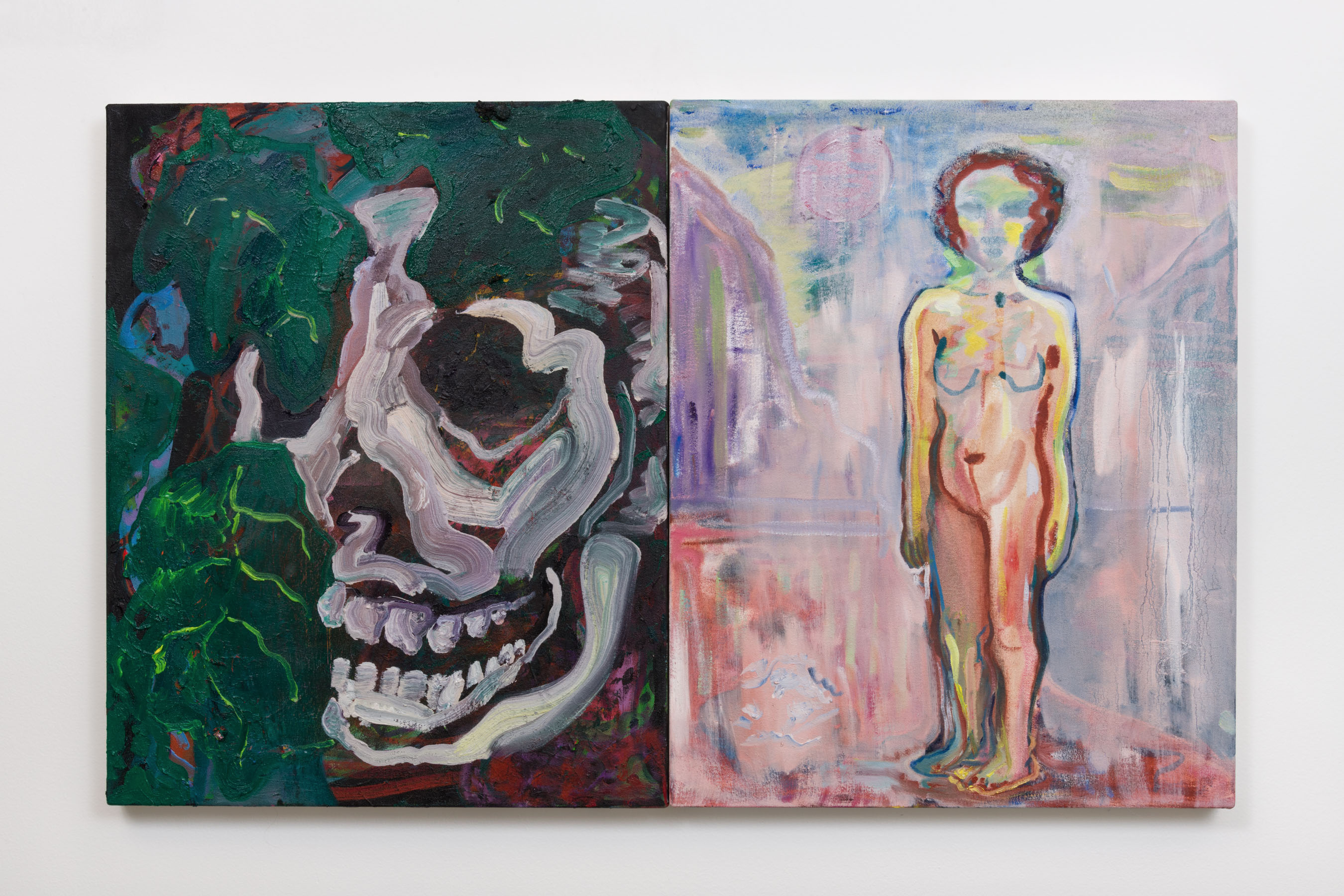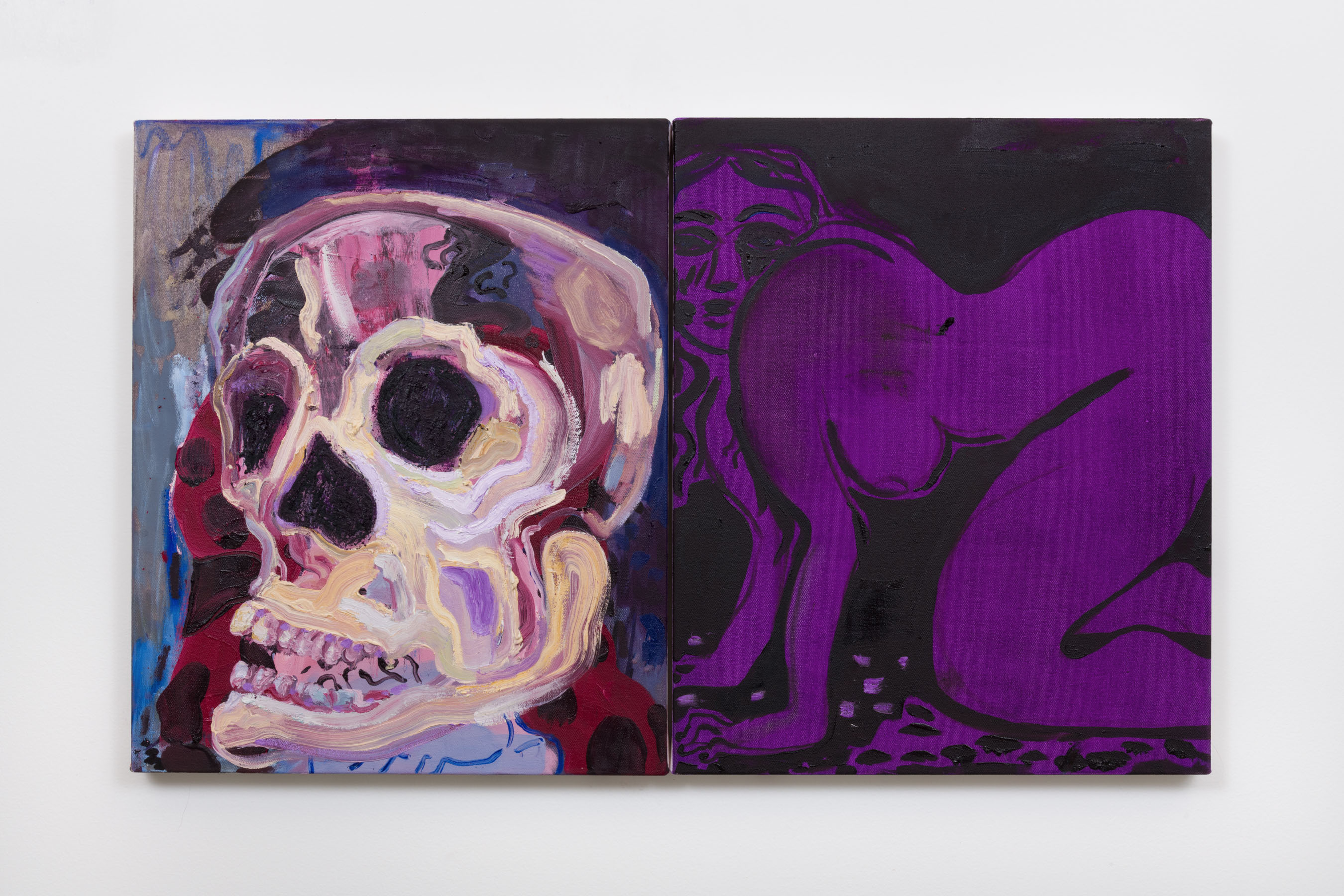 On the opposing wall is the even larger painting Weapons were Drawn, Sacrifices were Made, Battles were Waged, Pleasure was Had. Unlike it’s facing neighbor, this triptych is made from three distinct panels, each painted differently and featuring a unique archetypal image made singular through their juxtaposition. The left panel consists of three figures; two naked women holding blades and a skeleton. The central panel focuses on a large skull springing up like an island from a murky body of water. The right hand panel is painted in a reduced color palette of black and red depicting a nude woman on all fours. Whereas In the Valley of Exes creates a cohesive environment and mysterious narrative based on the display of the nude female’s body, the second triptych reads as three singular pictures in conversation purely by their proximity to one another.