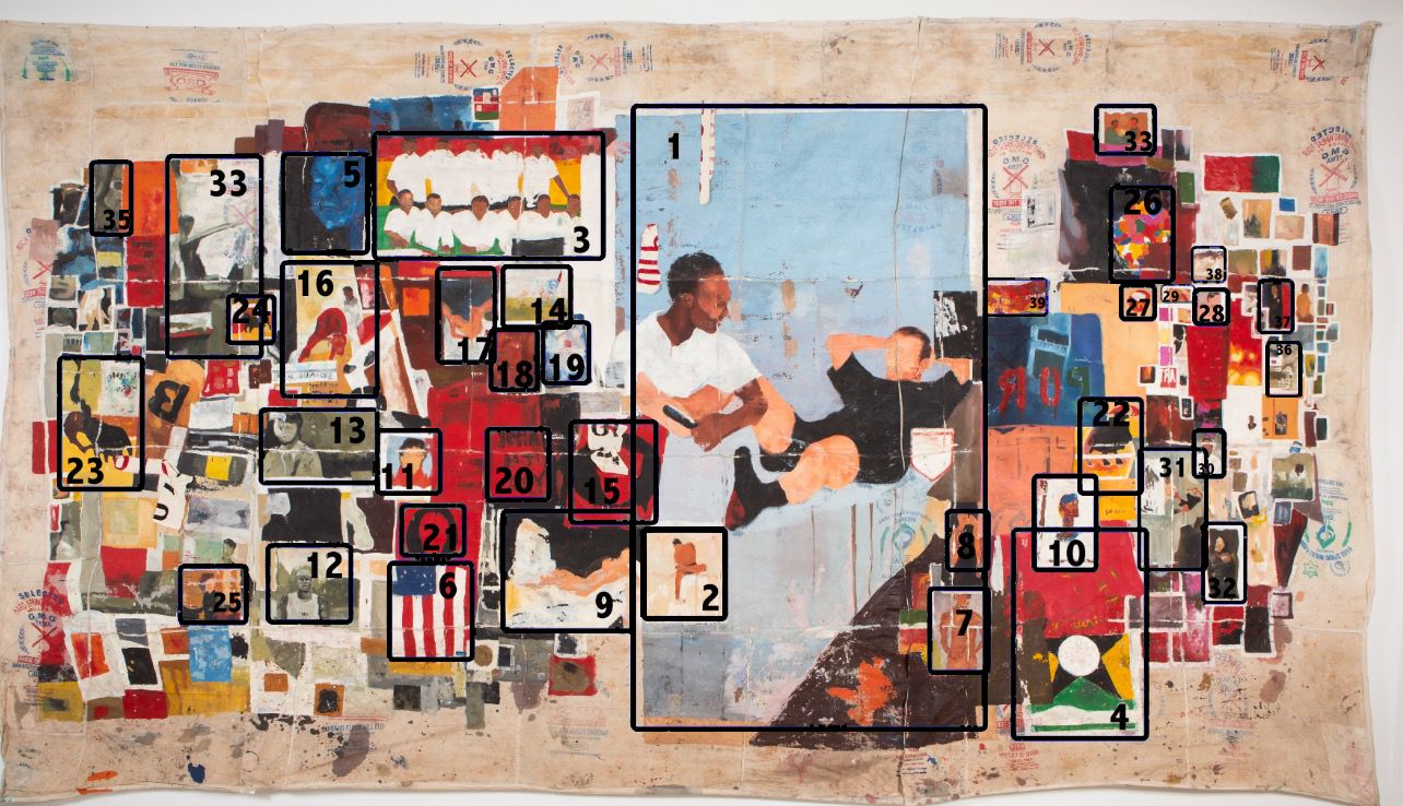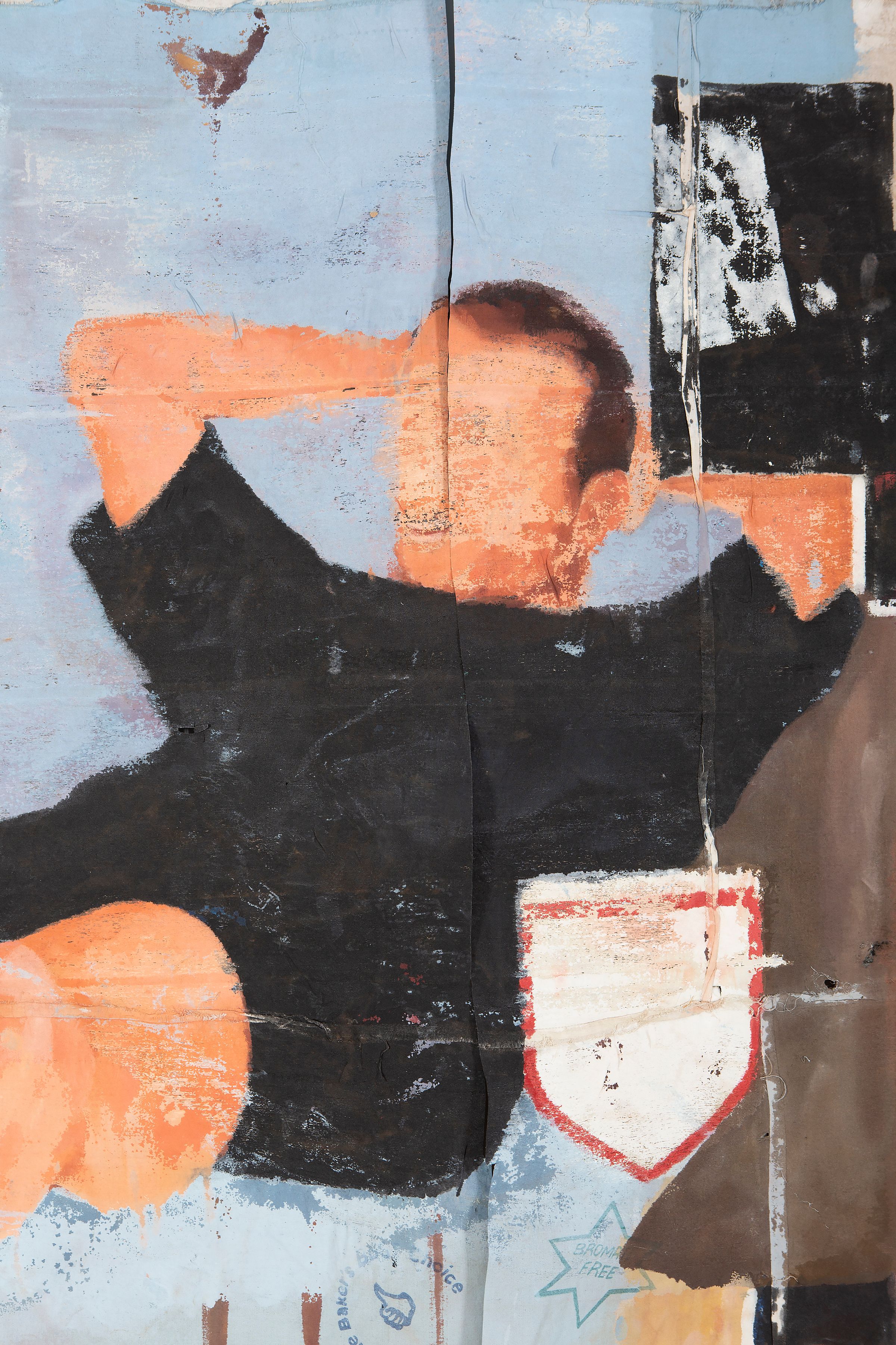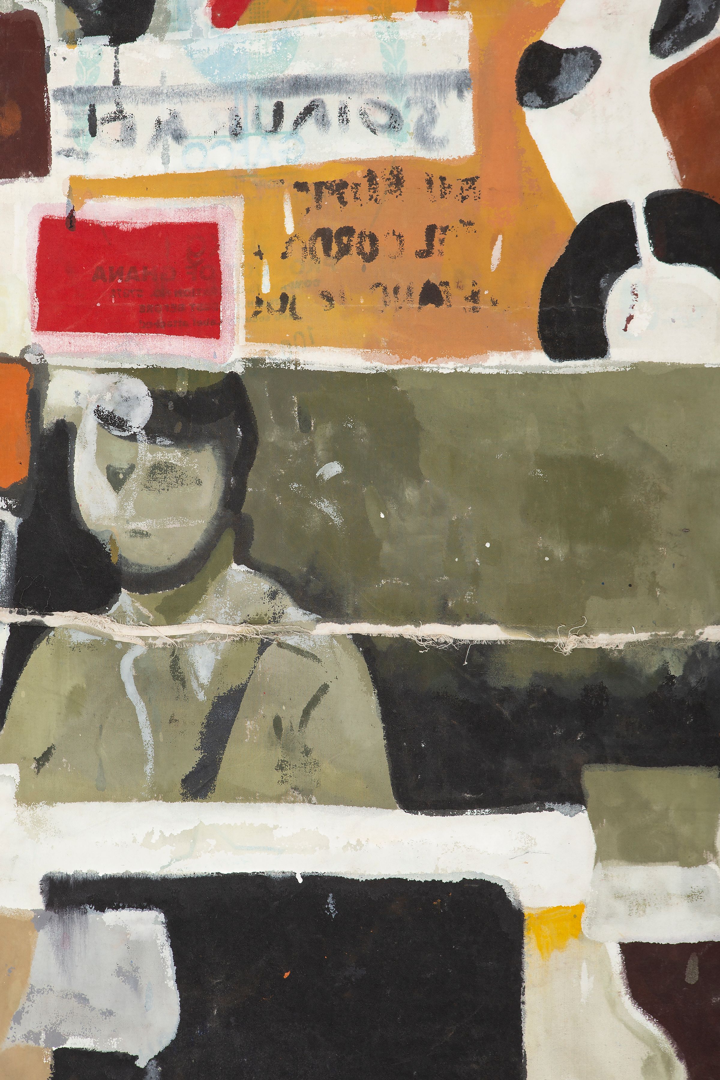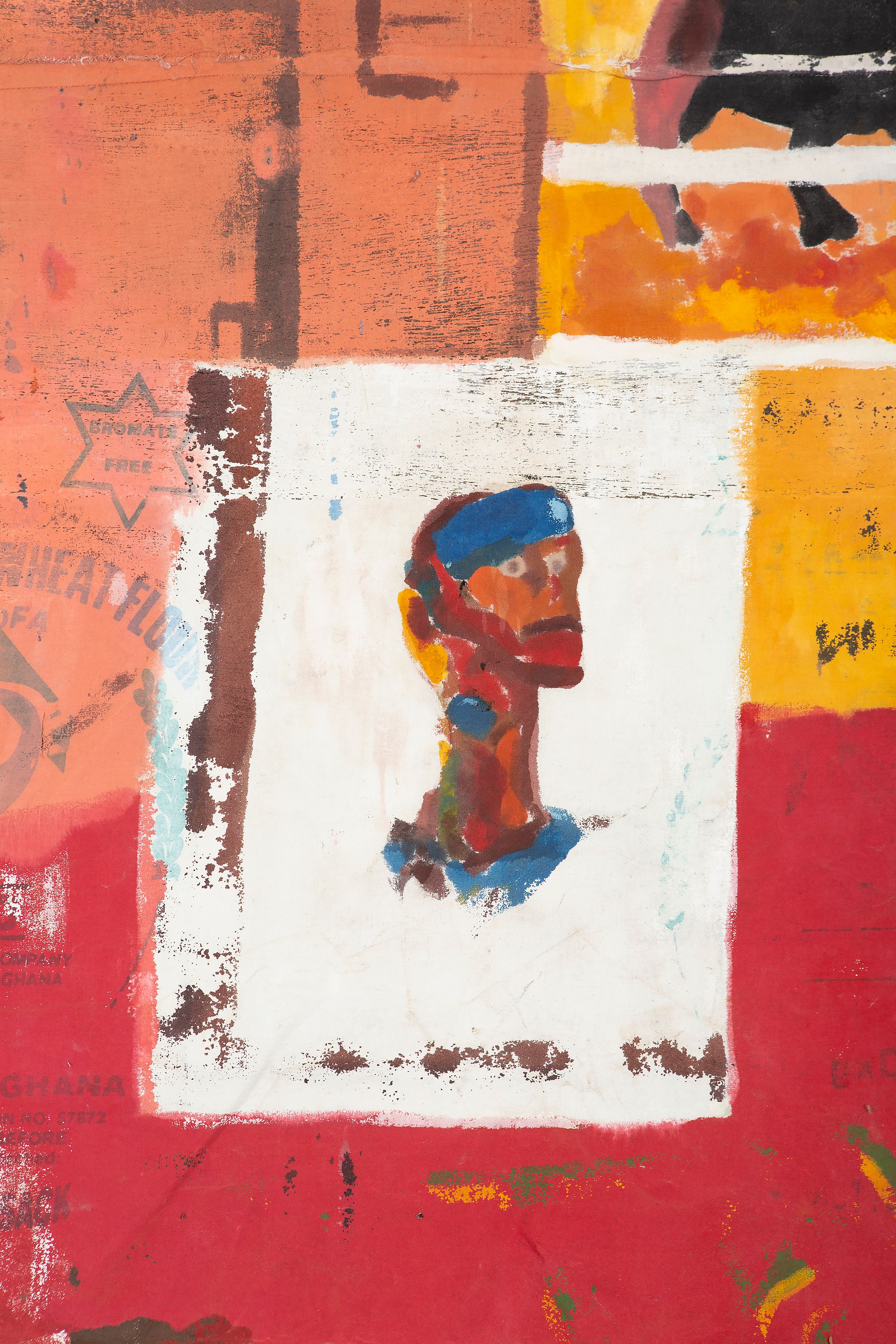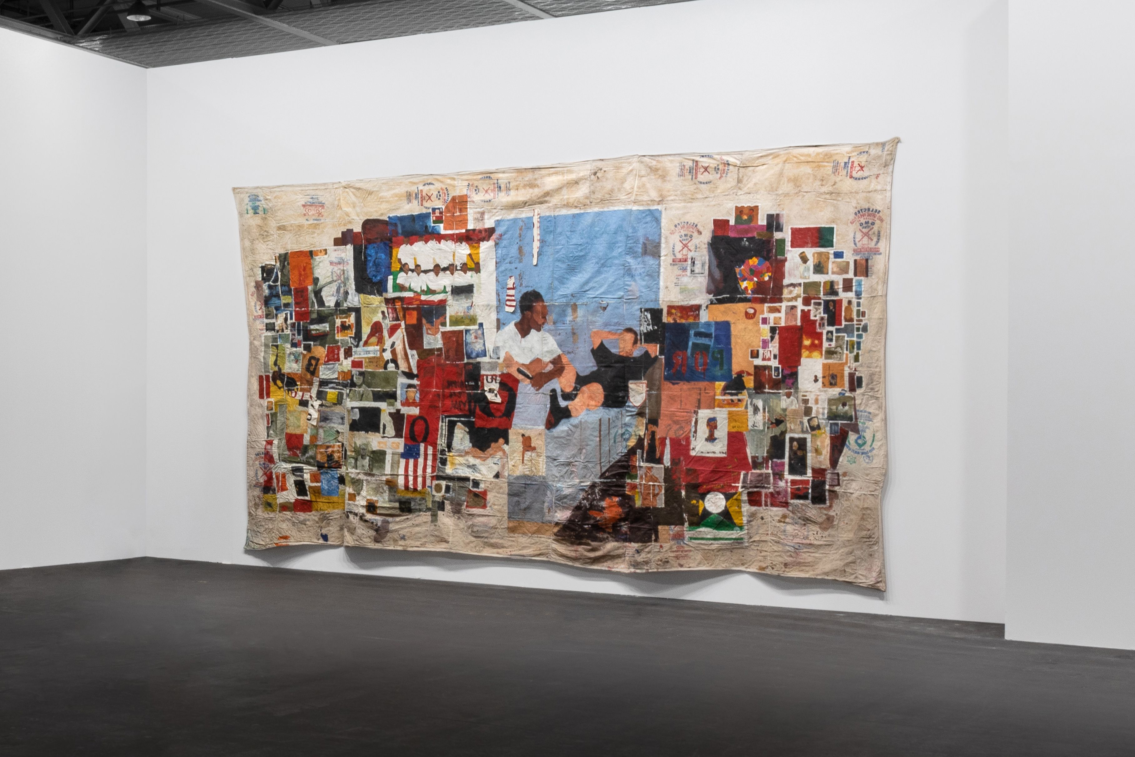This same image motif recurs as a centerpiece in Blow Up (Verso), 2010-19, which takes its inspiration from Harris’ earlier collage Blow Up IV (Sevilla) and was produced in collaboration with a local Ghanaian sign painter (Nicholas Wayo) as a mural-sized acrylic painting on burlap (approx. 4.3 x 7.5 meters), comprised of commercial flour bags originally stitched together for use as a sunshade by local fishermen working on Ghana’s Cape Coast.