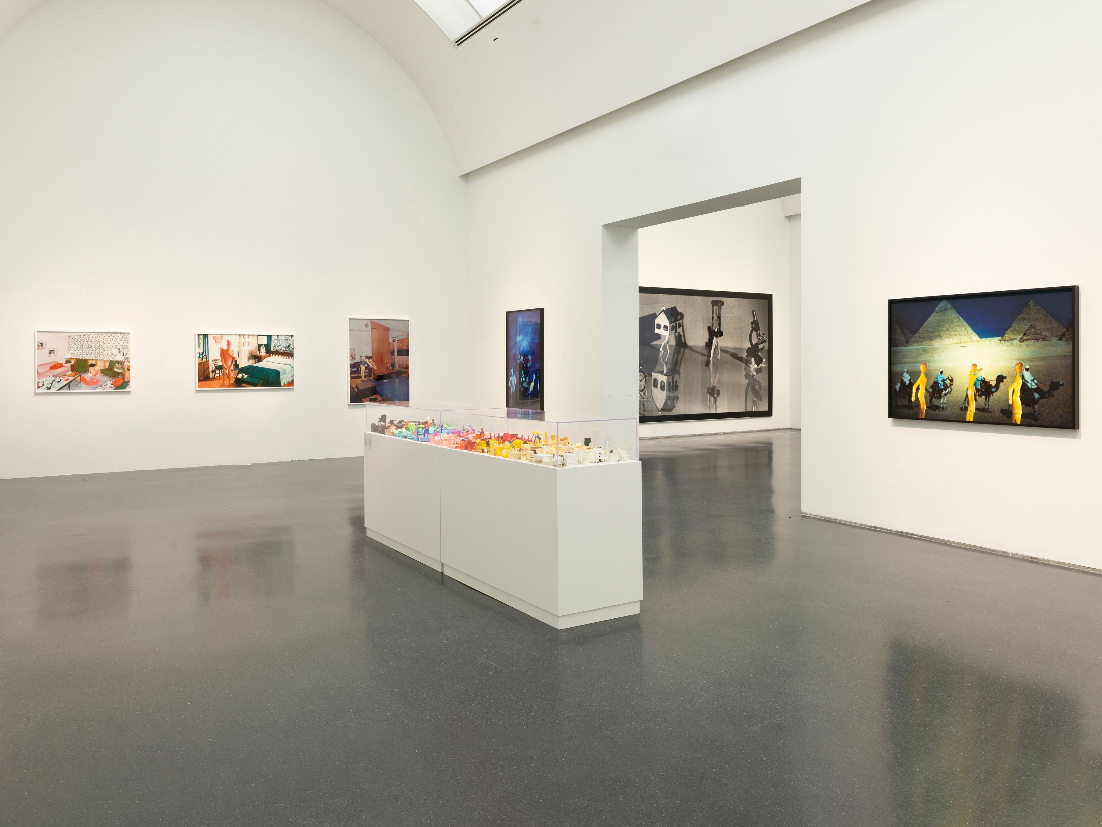 Laurie Simmons: Big Camera/Little Camera presents nearly all of the artist’s major series, including Cowboys (1979), Family Collision (1981), Color Coordinated Interiors (1982–83), Tourism (1983–84), and Clothes Make the Man (1990–92). In one of the artist’s most well-known series, Walking & Lying Objects (1987–91), Simmons used oversized props as opposed to miniatures. Posing wearing giant props, her subjects hide their faces while showing their legs. The personified objects probe the question of the importance of “props” with respect to humanity by representing the items we rely on to help define who we are.