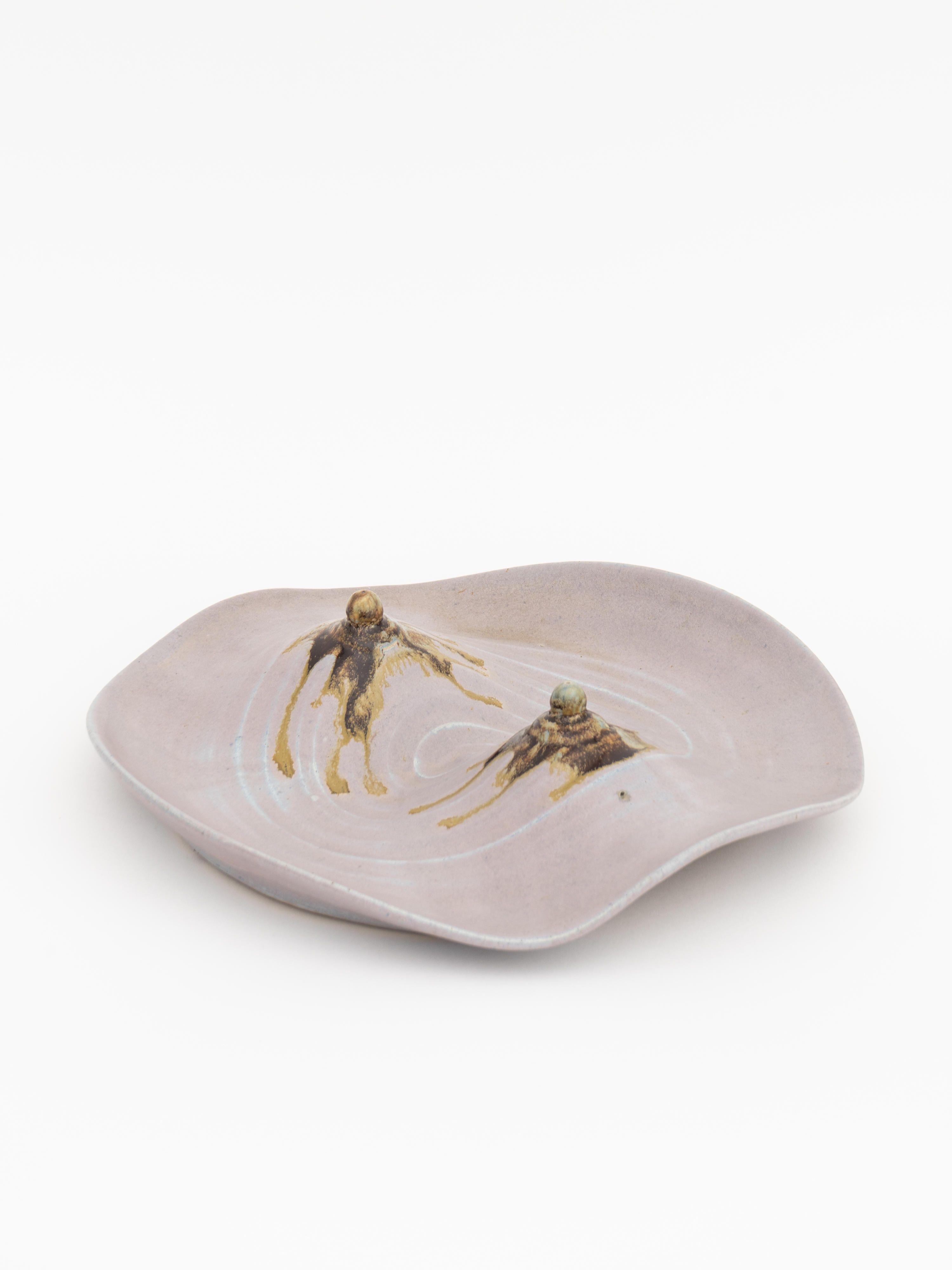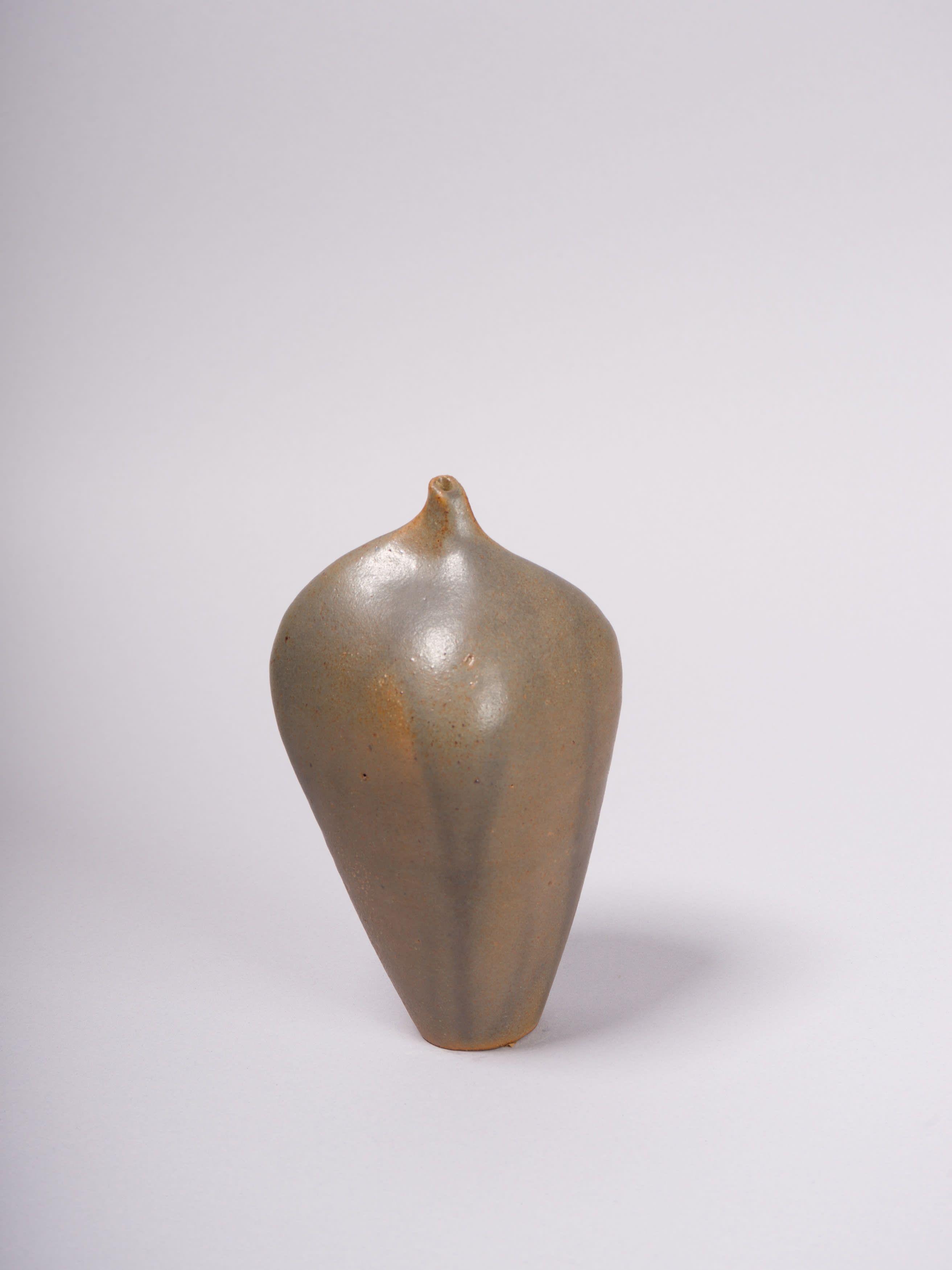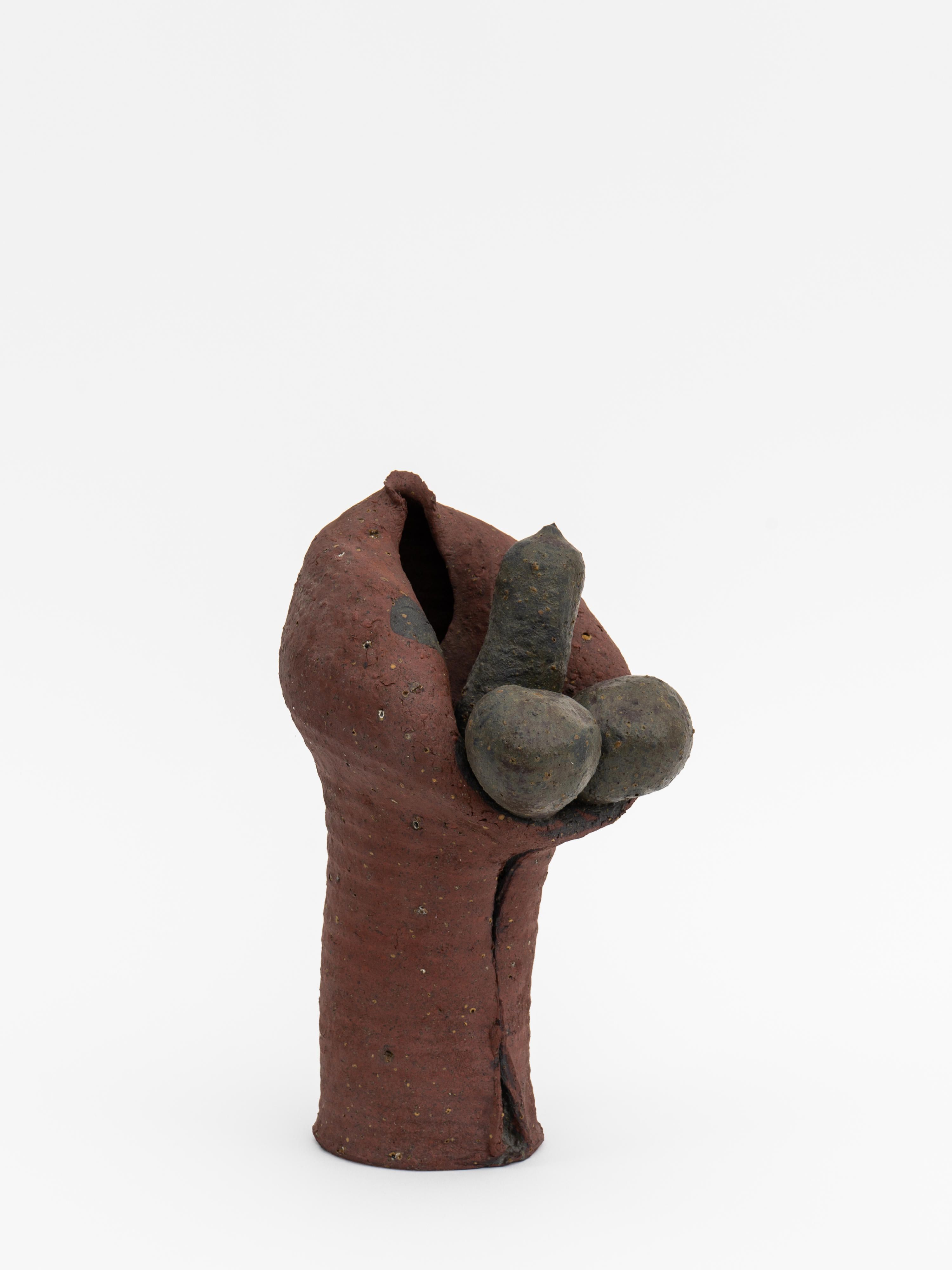 Kazemi’s sculptural vessels of the mid-1970s embody both formation and deformation in their making. High-fired stoneware, wheel-thrown then manipulated by hand, their bulges, twists, and eruptions follow and form organic contours. These are not functional vessels but bodies in transformation—part anatomical, part botanical—where containment itself seems unstable. The void within each form is as vital as its surface; the interior volume holds memory just as powerfully as the clay walls shaped by Kazemi’s hand. Her work demonstrates how material carries its own poetics, revealing clay as a medium of both persistence and fragility, foretelling a country on the cusp of war.