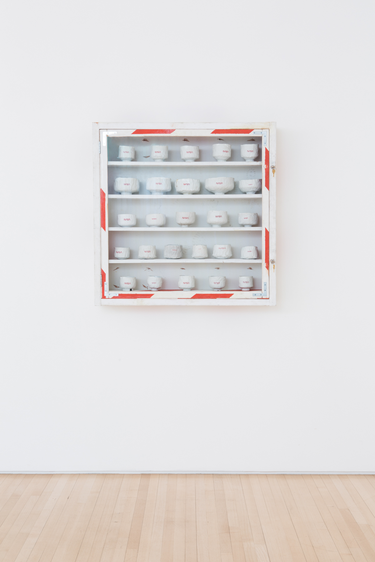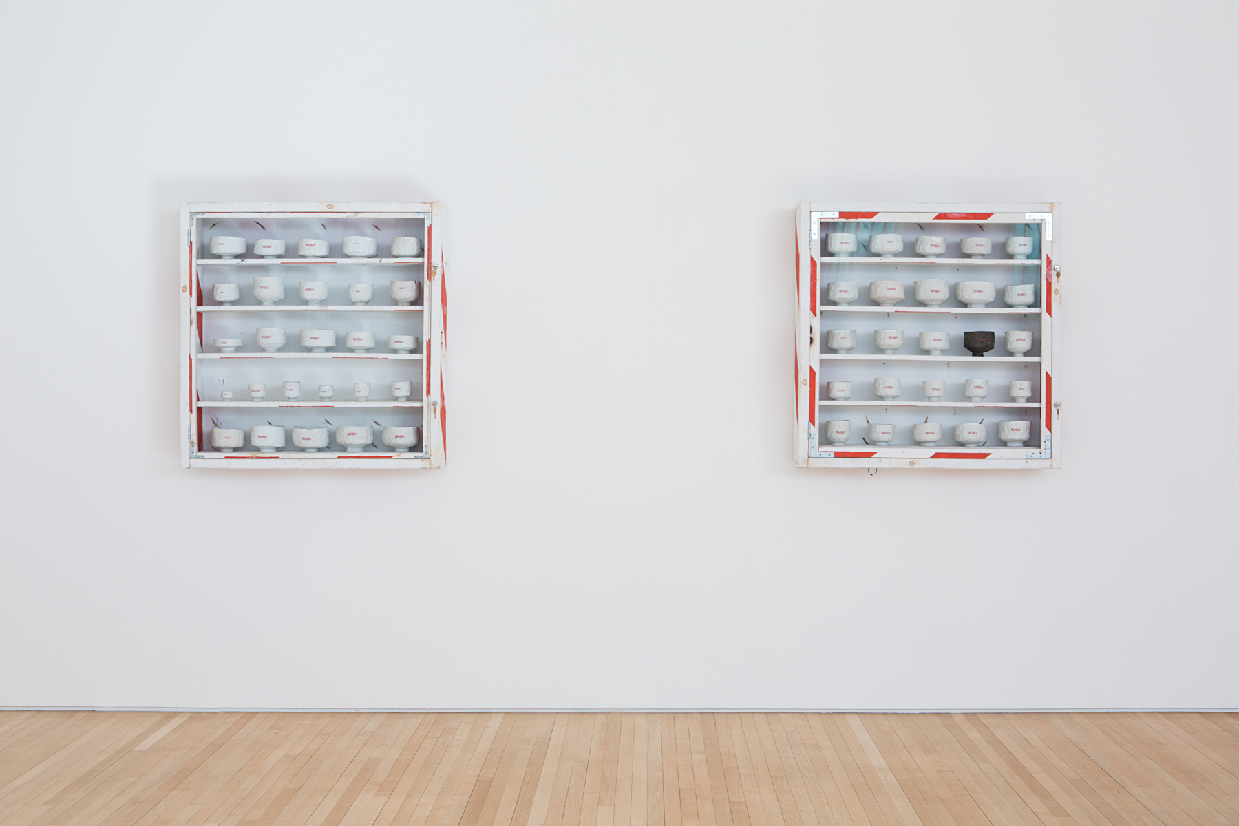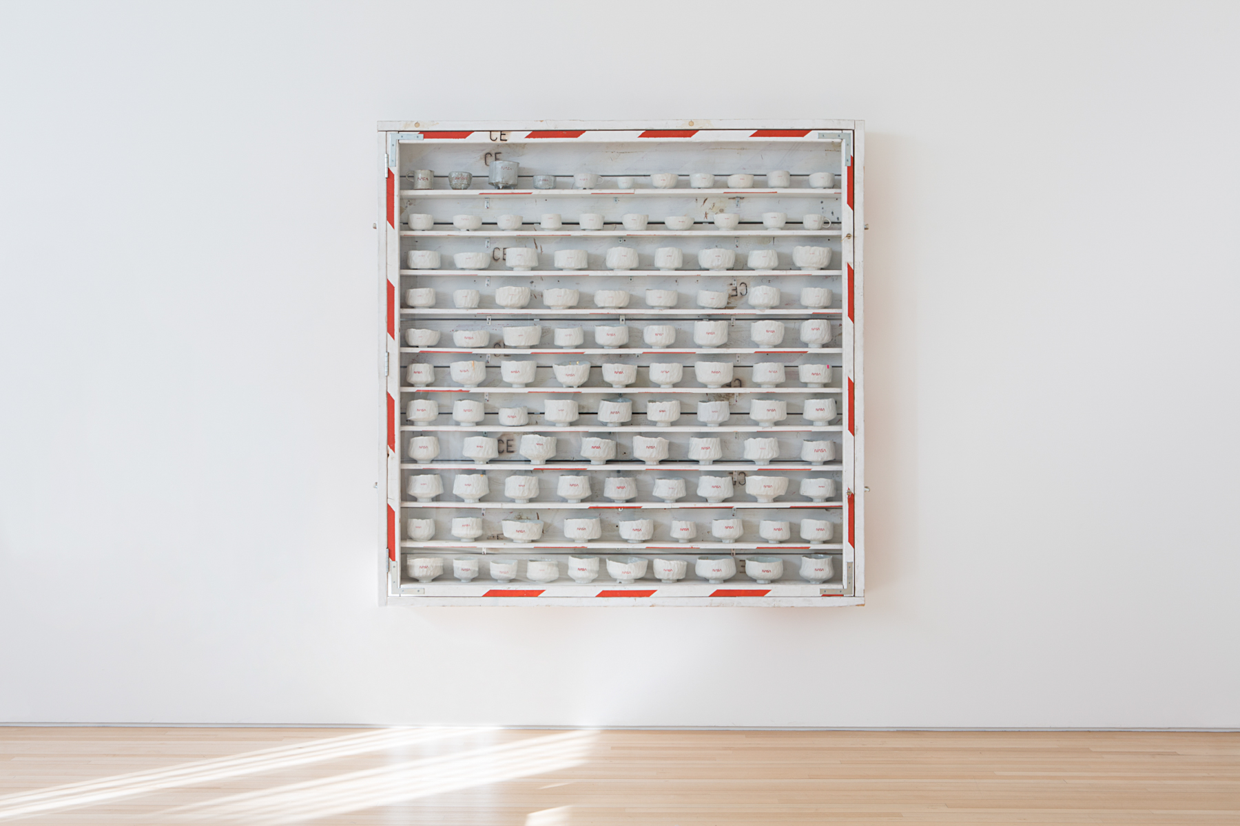 As branding is an important theme in Sachs’ work, the artist again labeled the work with what he considers the ultimate brand – NASA. The gallery will feature four cabinets custom made by the artist each containing between 25 and 140 bowls approximately six inches in diameter. The artist’s most successful efforts to make a great chawan (dubbed “heroes” by Sachs) are individually packaged in their own handcrafted plywood boxes. In the ancient tradition, the “heroes” receive appropriately descriptive names like: Conejo, The Mighty Sparrow and Shelley Duval. "In 5000 years, when all of the wood, bronze, steel and plastic that surround us have decomposed, these humble bowls will still be around since they are already as inert as stone."