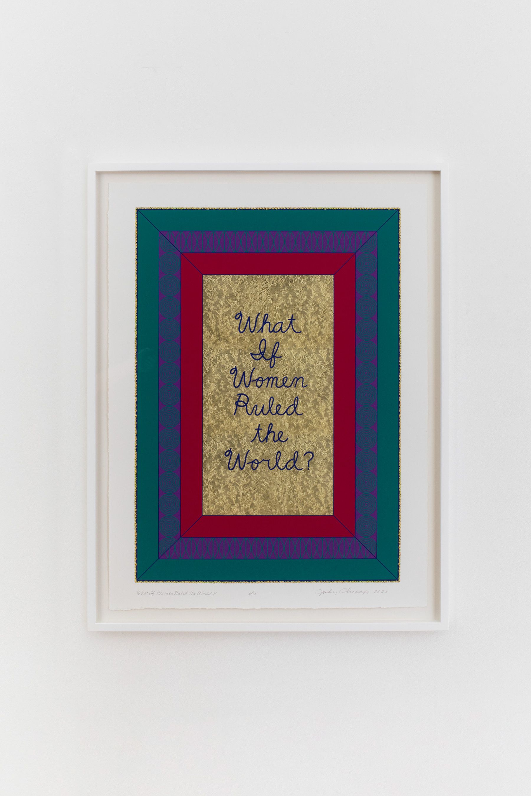 Early works like Flashback, Version 2 and Red Flag vibrate through and connect with more recent prints, like In Praise of Prairie Dogs (2019), which positions feminism within a politics of ecological harmony that encompasses the eroticism between non-human creatures as well. Chicago’s newest print in the exhibition, What if Women Ruled the World? Commemorative Print, was created as part of The Female Divine, a collaboration between Chicago and Dior that inspired the Spring/Summer 2020 haute couture collection. The first 25 prints in the edition are available exclusively on the site for $4,500. Judy Chicago, ever shifting, adapting, collaborating, and exploring new media, has nevertheless remained steadfast in her core values and vision for over 50 years. Her prints are a driving force of that legacy and indicate the evolution of an inimitable formal language that is both meticulous and brazen.