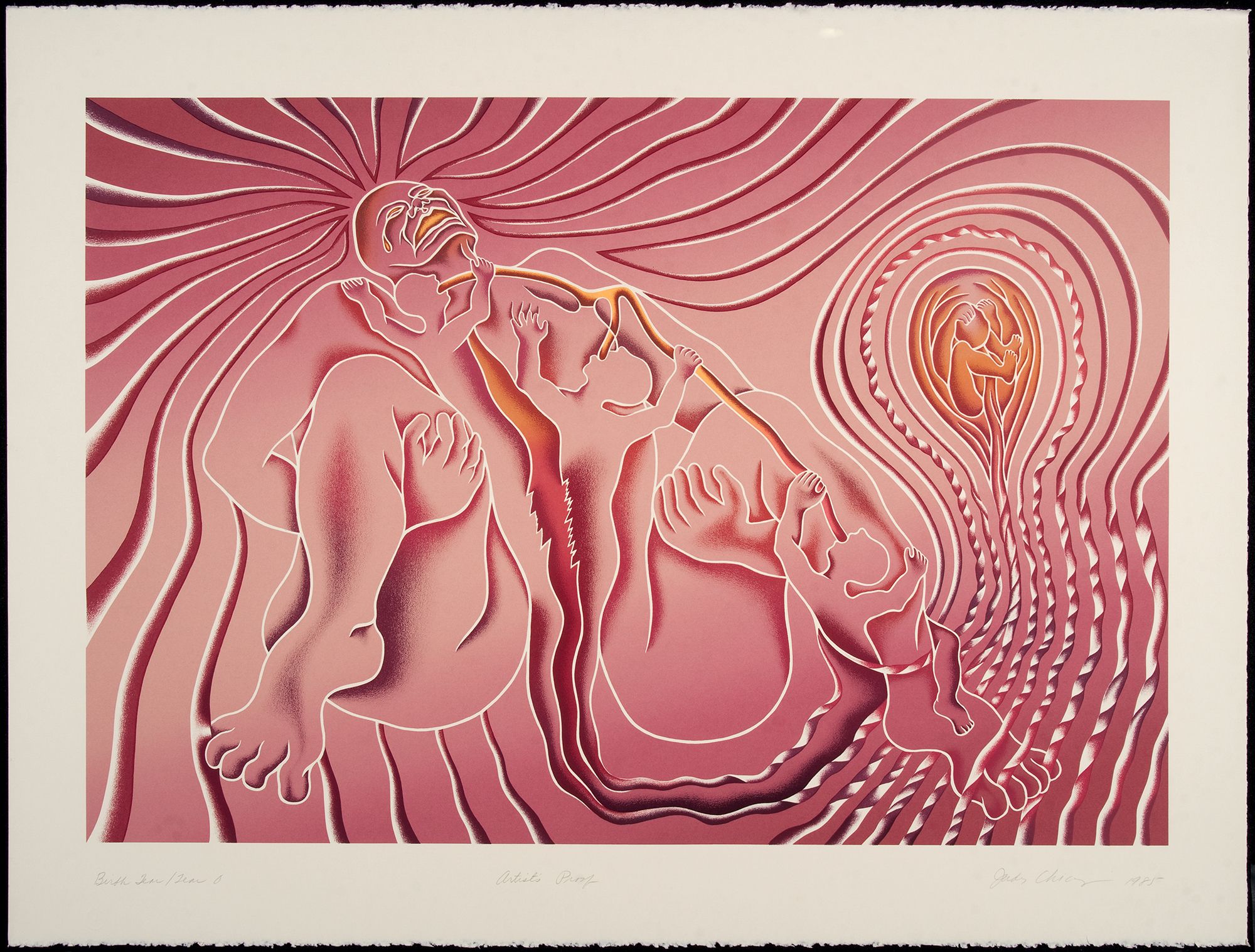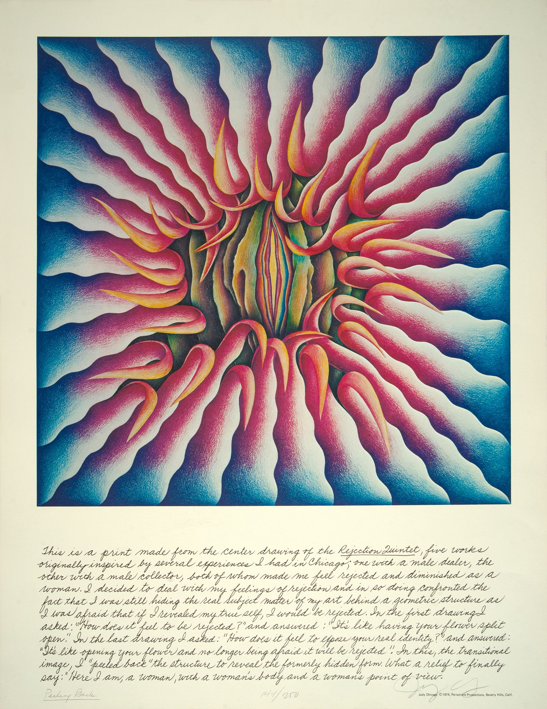 Chicago in Ink: An Autobiography spans the majority of that history. Included is a rare print called Flashback, version 2 from 1965—so early that it is signed “Gerowitz,” Chicago’s surname before she, in a feminist gesture to subvert tradition, chose her own name in 1970. Flashback, Version 2 is a print that appears to be minimal but already suggests the central core imagery and color that would come to be associated with the more recognizably feminist imagery that she pioneered in the 1970s.