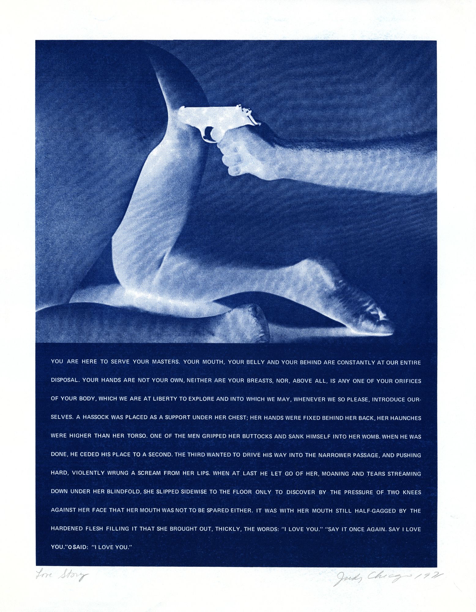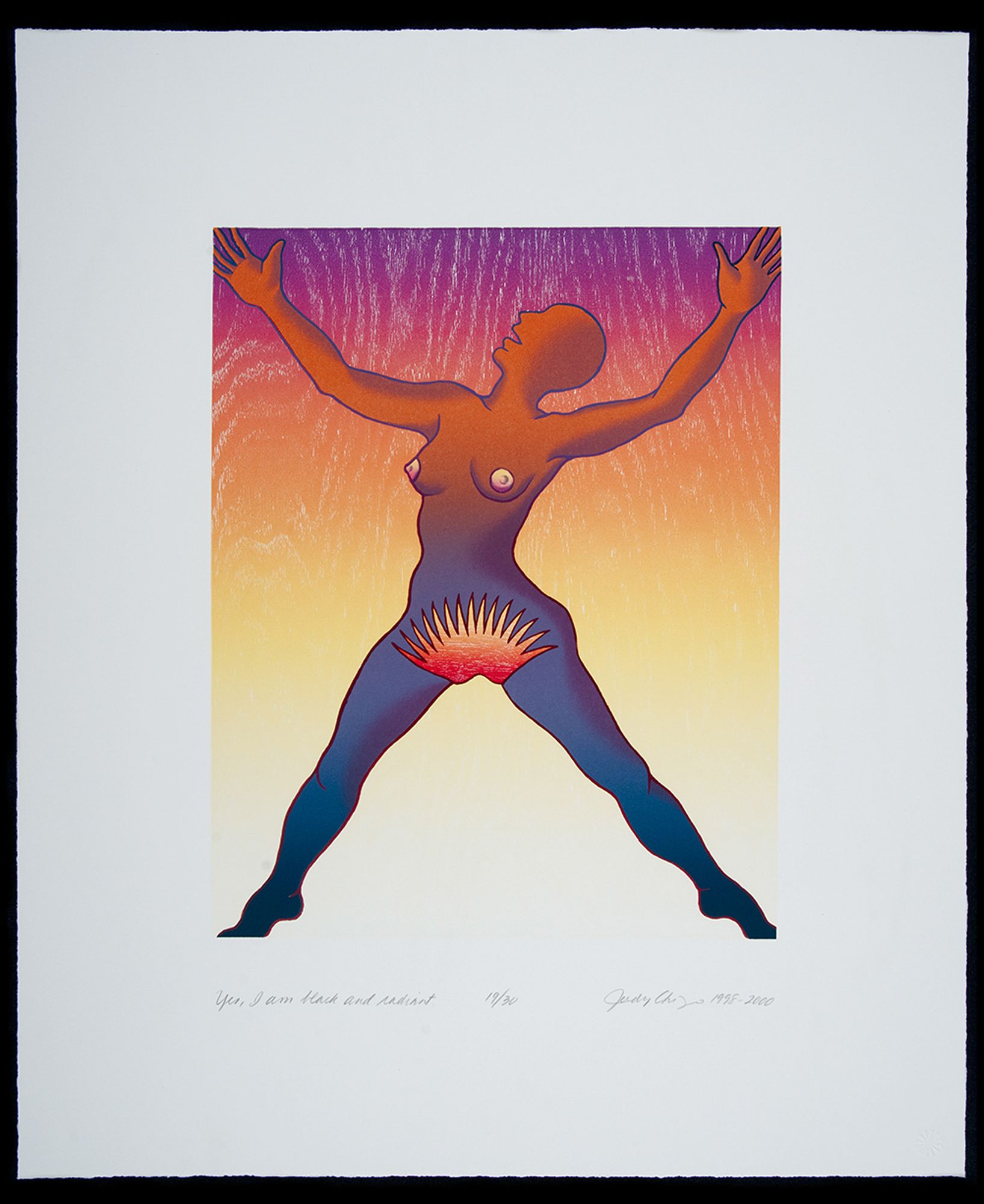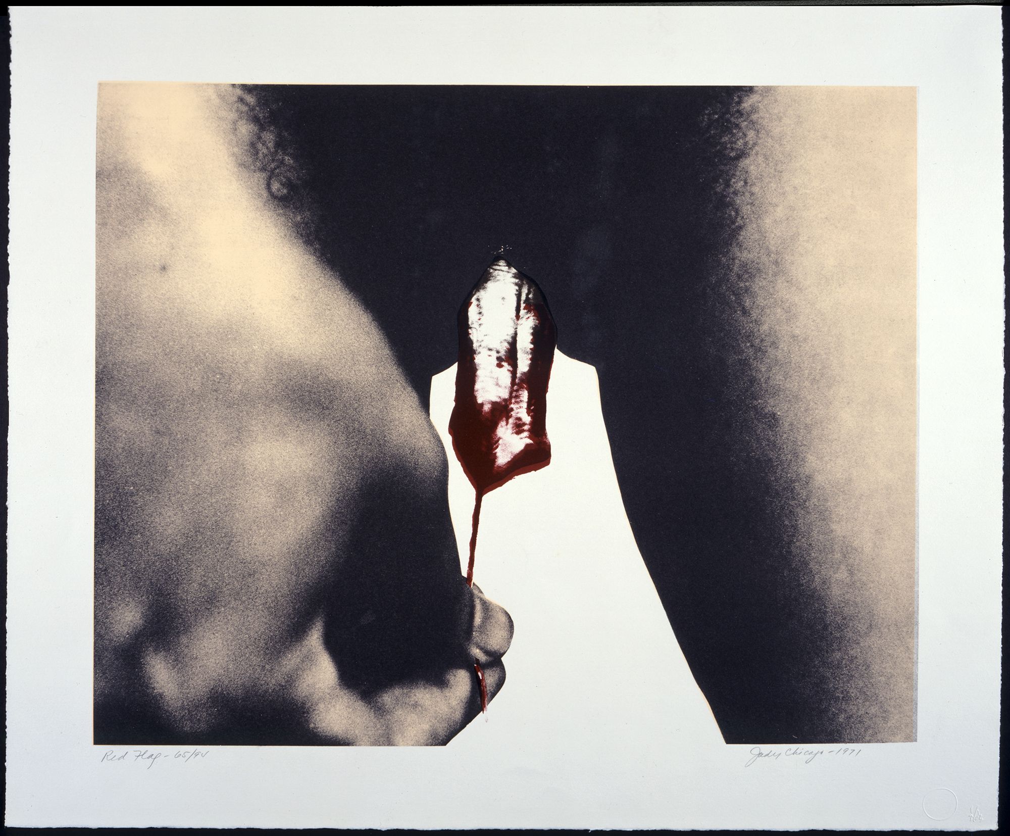 In the 1960s and into the 1970s, print studios in Southern California were invariably owned by men, and Chicago’s printmaking became a way for her to claim these spaces and their techniques for women. In her autobiography, Chicago recalls creating Red Flag (1971), regarded as the first image of menstruation in contemporary art, “I was very nervous when I brought the photograph to [Sam Francis’s] litho shop, where I would work with a male printer… I made the print for two reasons: first, I wanted to validate female subject matter by using a ‘high art’ process of hand lithography and second, I was trying to test male reaction to overt female subject matter.” The thought of Chicago showing up to a print studio with a photograph of a bloody tampon remains bold and disruptive.