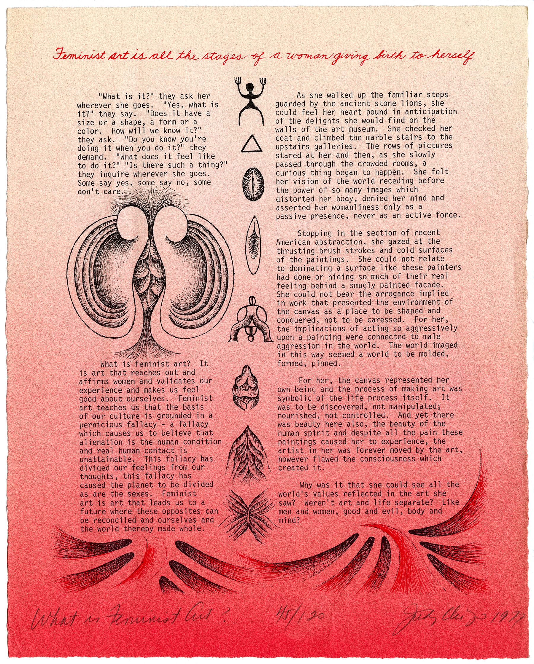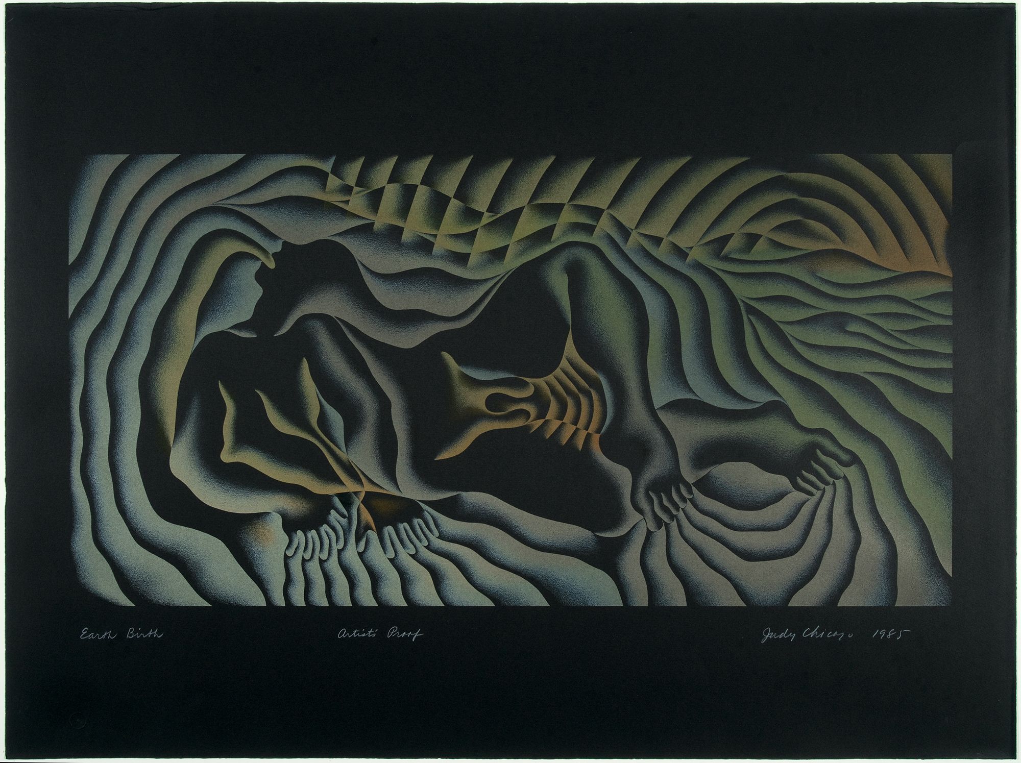 Chicago’s graphic impulse and an interest in the emotive potential of color, printmaking offers a degree of control otherwise not afforded by needlework and other techniques. From that control, she generates chromatic waves of energy, rhythms of line that echo the lines of the body, and vibrating whispers or screams ranging from pain to joy. Seeing these prints together enables us to locate Chicago in a history and track her visual style while simultaneously locating historical styles like Finish Fetish, the Bauhaus, post-minimalism, text-based conceptualism, and Expressionism.