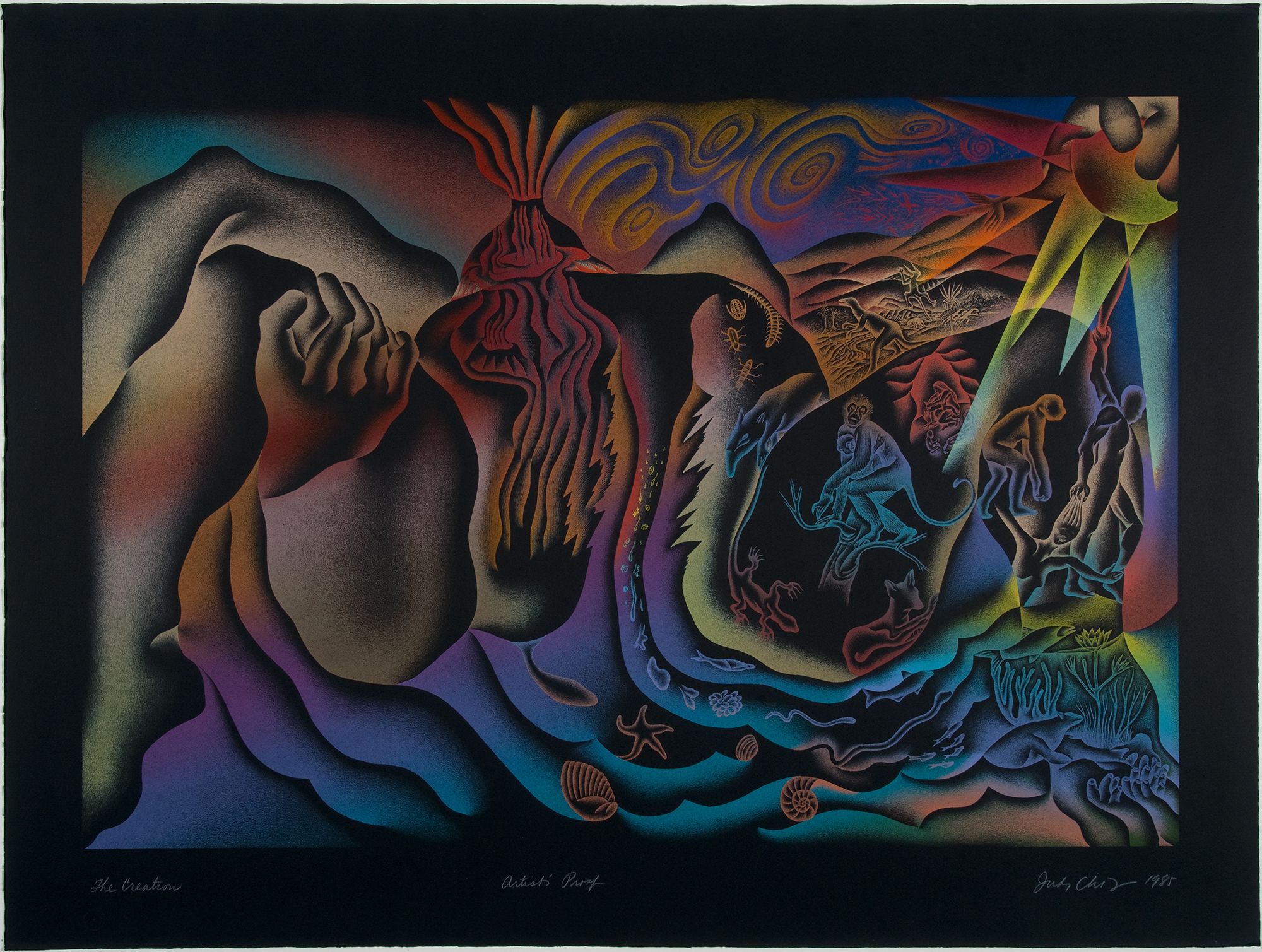 In a rare gesture for a contemporary artist, Judy Chicago has made prints with most of her bodies of work since 1965. Like much of the media she employs, printmaking is an inherently collaborative venture. Harnessing the respective expertise of master printers, Chicago fiercely experiments in various printing techniques. The multiplicity of prints and their collaborative production process expands the democratic accessibility of Chicago’s work. Over the past few years, we have re-engaged with Chicago’s political and inventive use of autobody airbrush painting, smoke and fireworks, needlework, sculpture and installation, china and glass painting, and so on. So, it is a great pleasure to invite equal attention to her prints and multiples, which advocate for the coextensive nature of feminist art and technical innovation. In these works, we can see the pioneering of new forms and visual languages and the consistency of her trademark notations, like flowers, rainbow ring motifs, butterflies, figures blended with landscapes, and unapologetically feminine colors.
