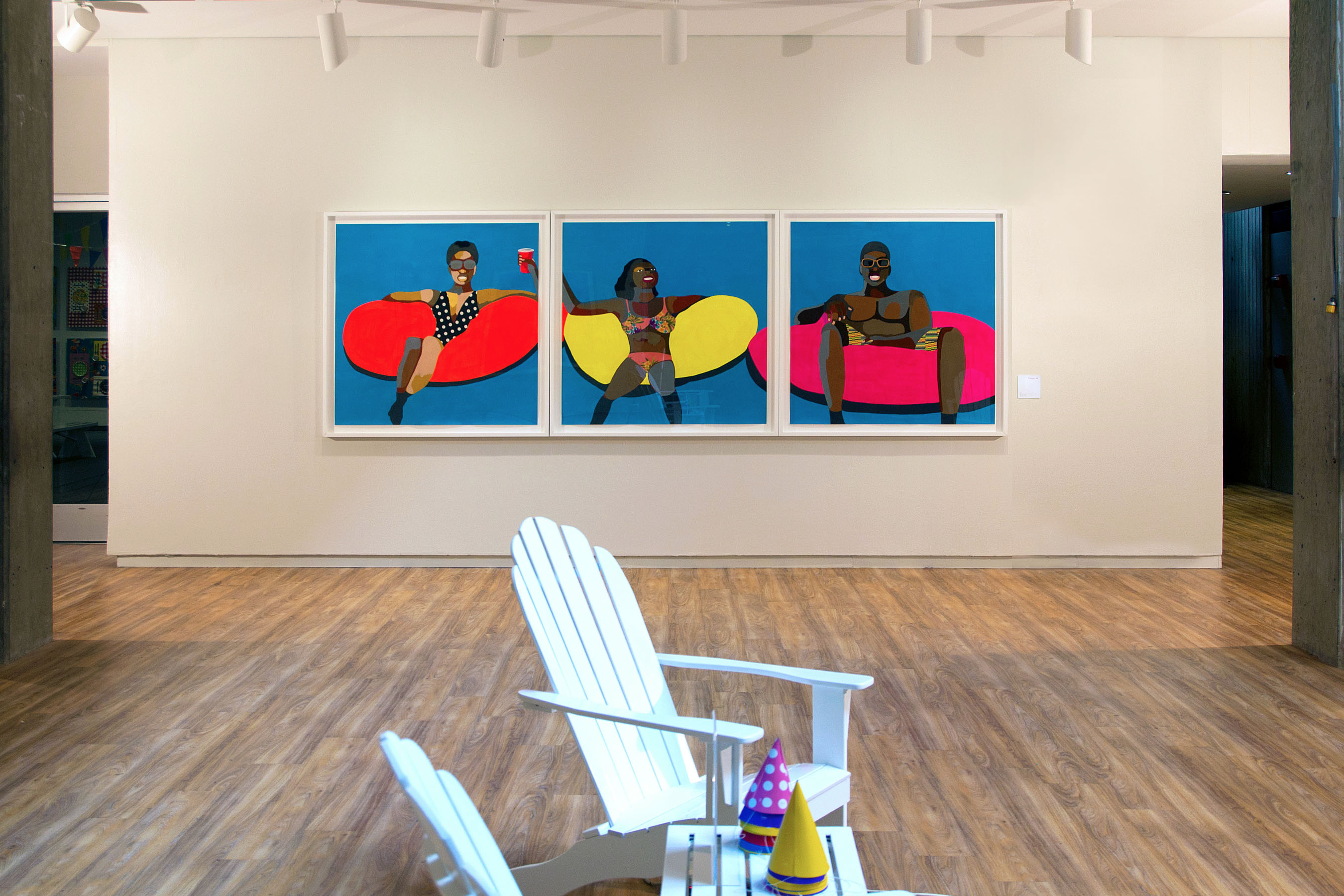 Much like water, the exhibition flows to unexpected spaces. In addition to works from the Floaters series, Buoyant features an immersive, large-scale installation entitled We Came to Party and Plan, a newly created body of work that invites the viewer into a party atmosphere full of complexity, as well as Tables Turned, an earlier series also related to celebration. In other areas of the Museum, the artist curated a selection of works from the Hudson River Museum’s collection, casting a fresh perspective on historical and twentieth-century works related to the subjects of water and leisure.