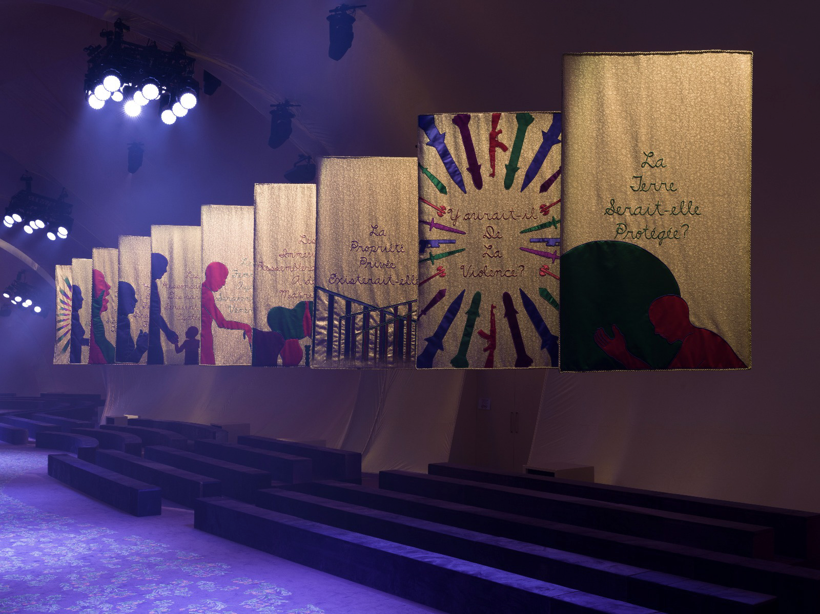 At the far end of the runway a large banner measuring 12 x 7 meters would hang. This banner would be comprised of purple velvet with gold brocade backing and gold braided edges. Embroidered in gold thread will be the question: What if Women Ruled the World?, aimed at inspiring viewers to imagine the possibility of a different, hopefully more humane world. Continuing along the sides of the runway will hang twenty more, smaller banners, embroidered with other questions formulated around this idea of imaging a world in which women are in charge. The questions would be asked in English and French.