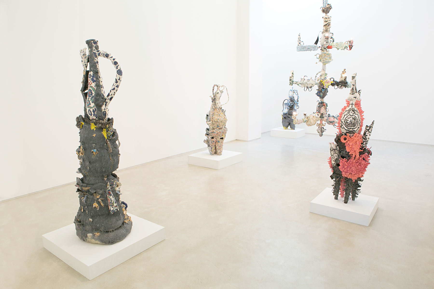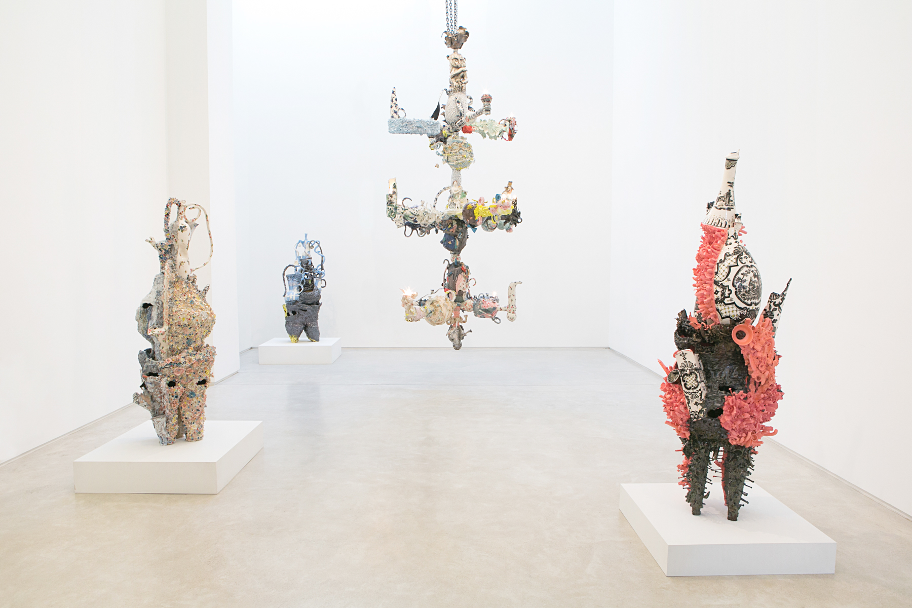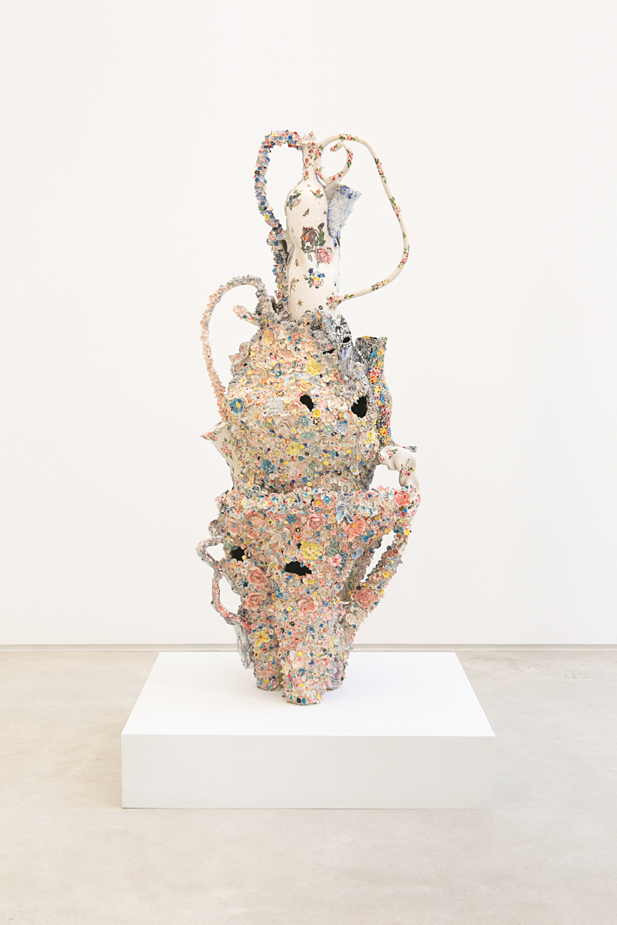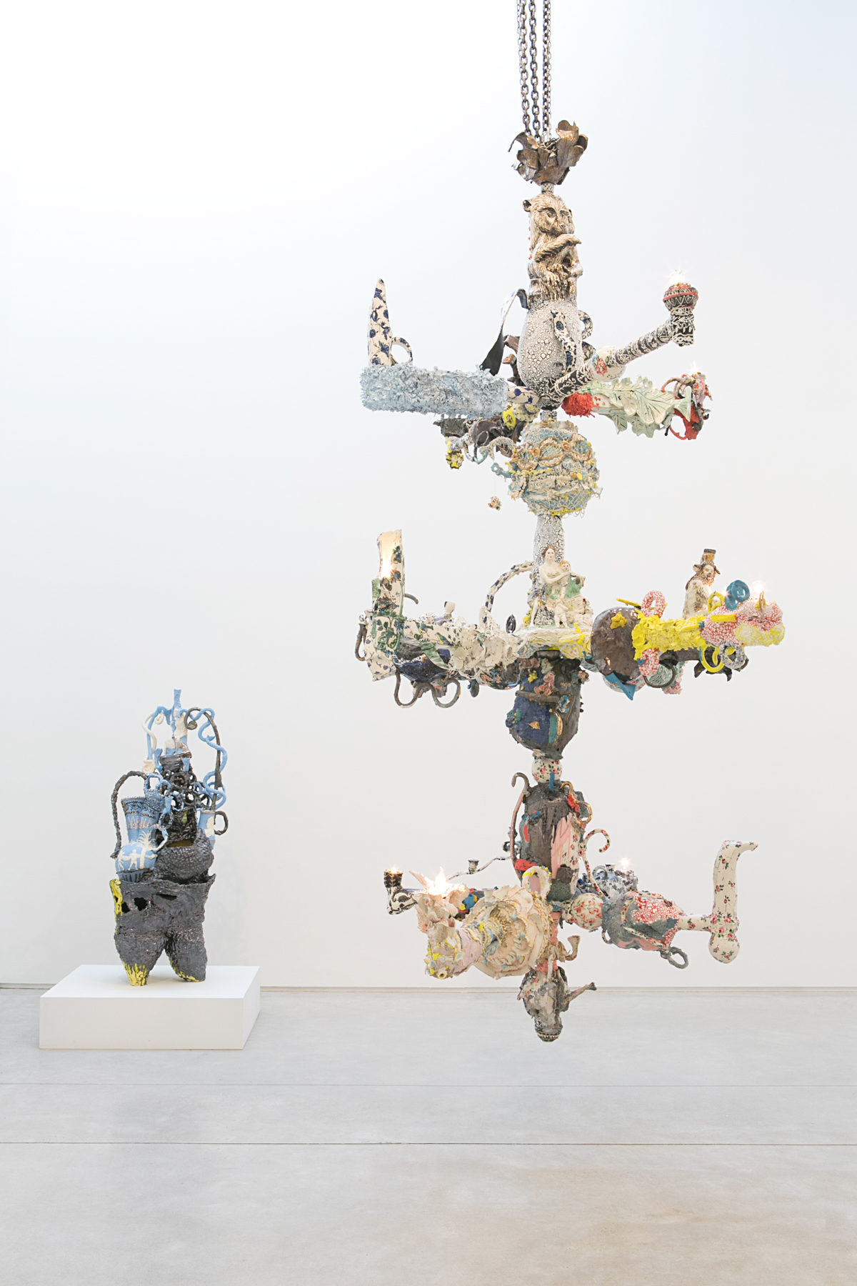 The forms of the functional domestic object—the handles, holes and spouts of vases; the legs and feet of tables and chairs; and the protruding arms of chandeliers—becomes subject and fodder for her artistic inventions. While domestic objects have historically been associated with the feminine, and relegated to the lowest position in the hierarchy of the arts, DiMattio elevates them into vehicles for expression through her monumental shifts in scale and in her deconstruction and abstraction of recognizable forms. In her largest and most ambitious sculpture to date, Chandelobra (2015), she perverts and distorts the familiar form of the chandelier, transforming it into something ominous and starkly unfamiliar. In Bloemenhouder (2015), DiMattio hand-sculpts hundreds of tiny porcelain flowers and pairs them with robust, flowing lava and crackle glazes. Overwhelming the surface with ornament, the floral accents become viral - almost grotesque – while the lava glaze shifts from the primordial to the elegant, partially obscuring the vessel beneath.