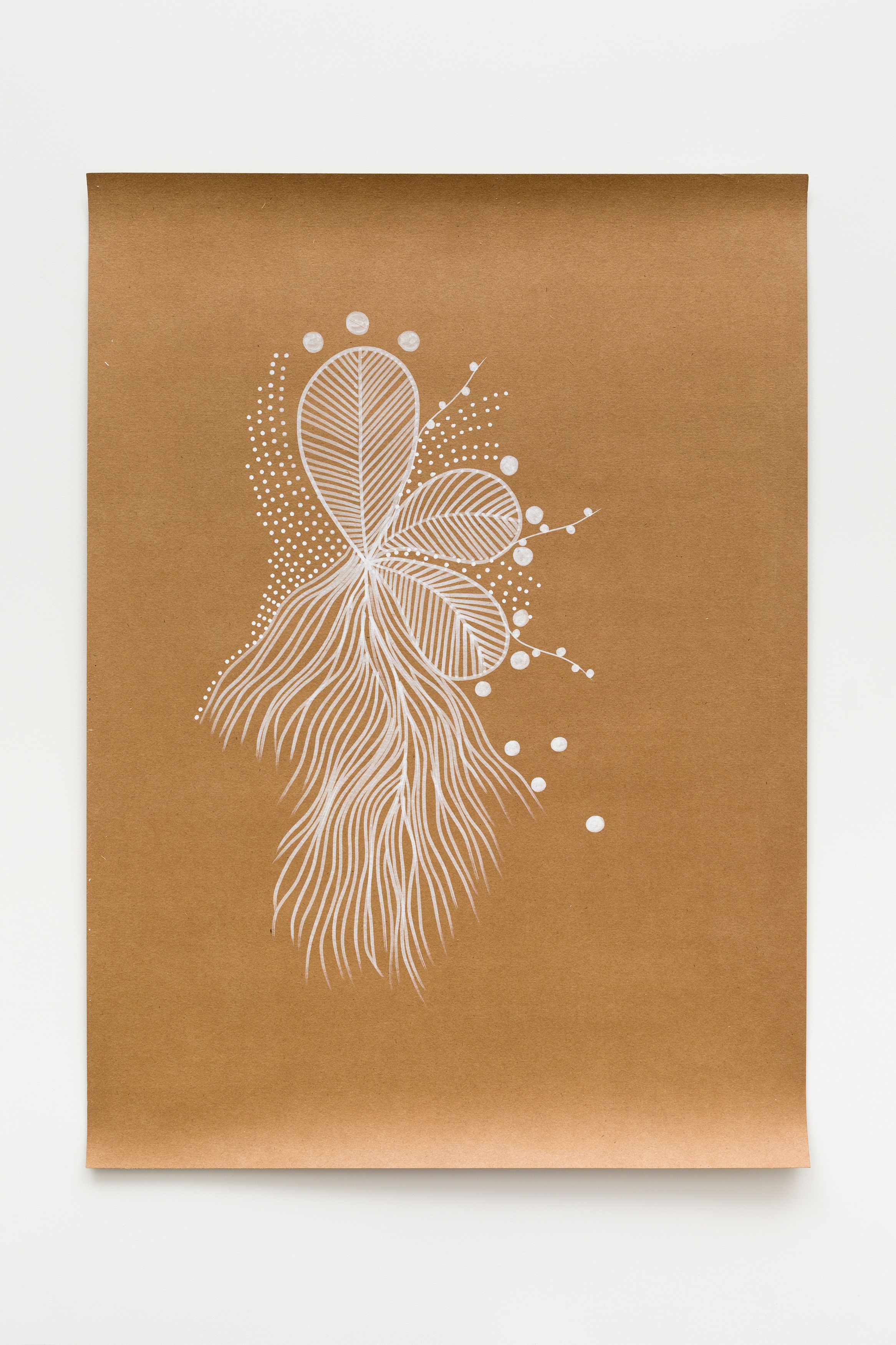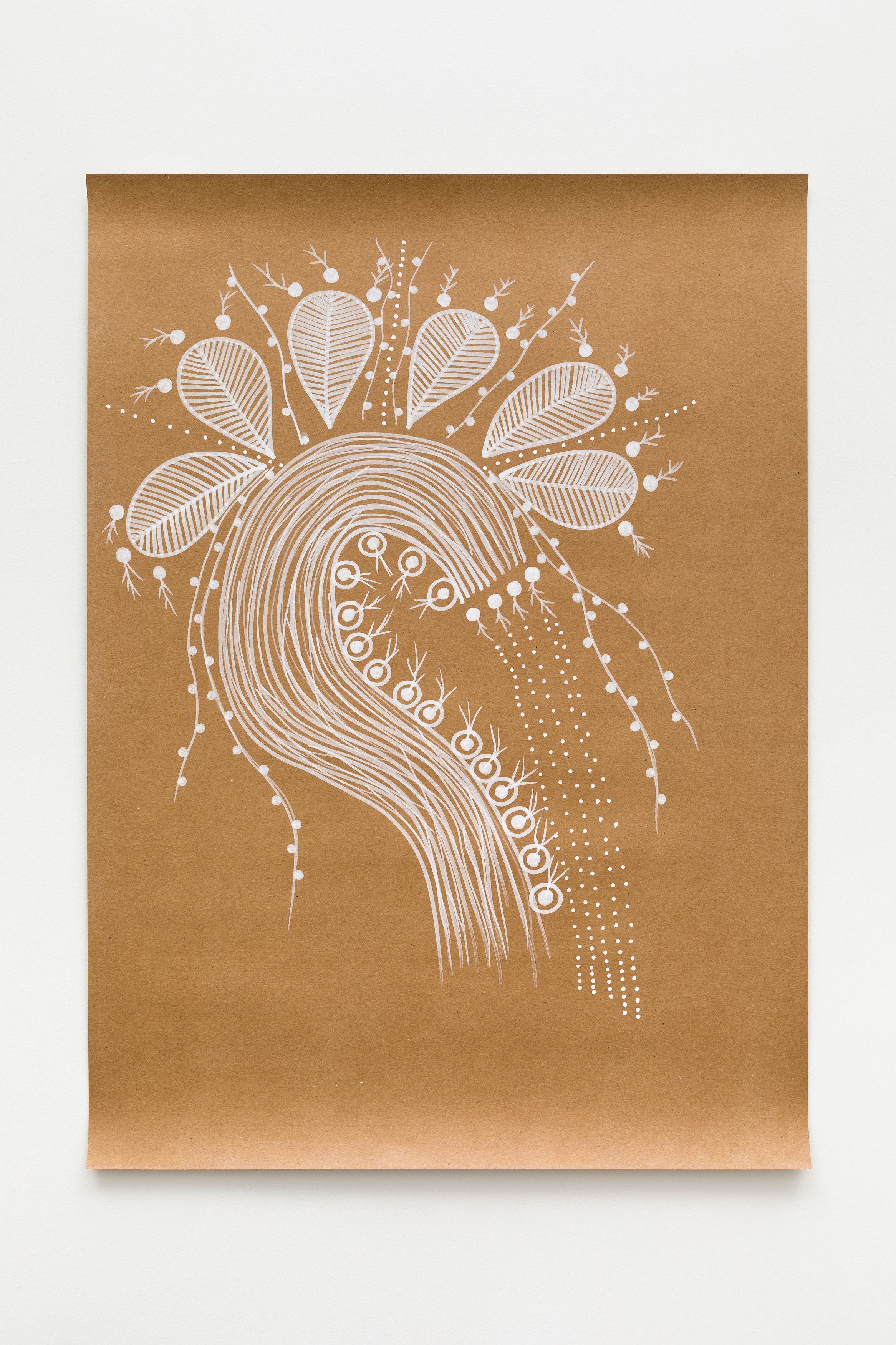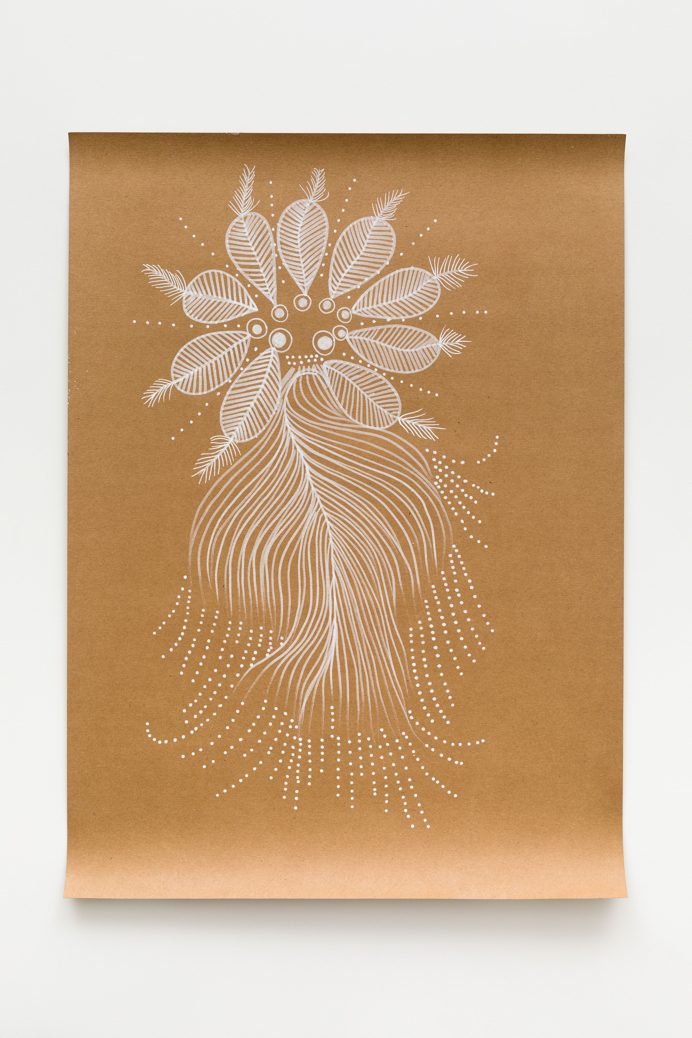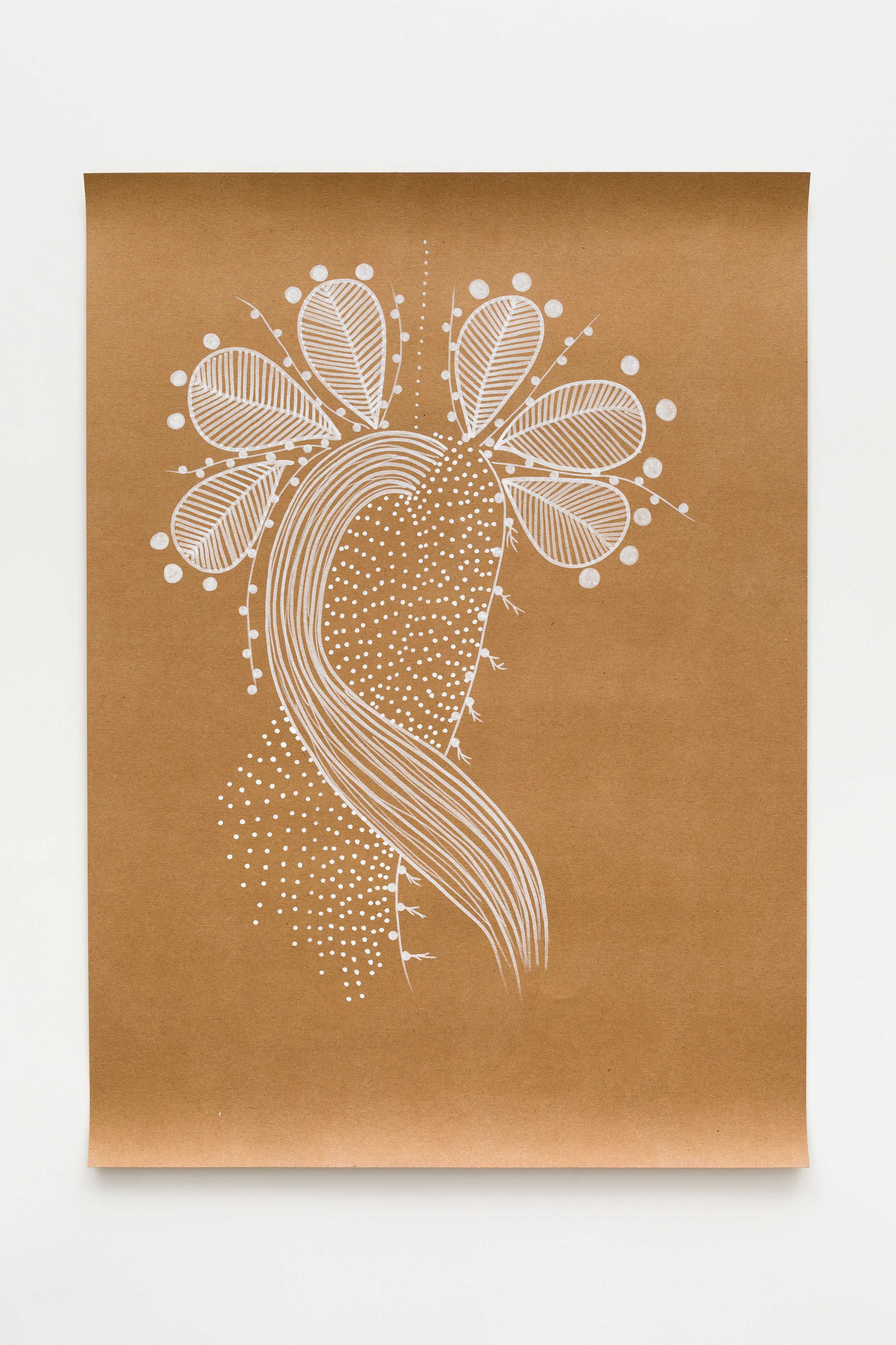 The works presented in Endless River refer to and build upon Pankararu’s unique worldview through the visual and material alike: the white pigment used in many of his paintings is a natural clay material traditionally used by the Pankararu to adorn the body for ceremonies, making each monochromatic work a body, a group of bodies, and a sampler of ornamental possibility. Other works burst with color, showing the vibrant and fecund natural world of cacti, roots, leaves, seed pods, and flowers that reference the earthy terrains and flora as well as the ingredients and elements for healing, as well as the forest setting where healers work.