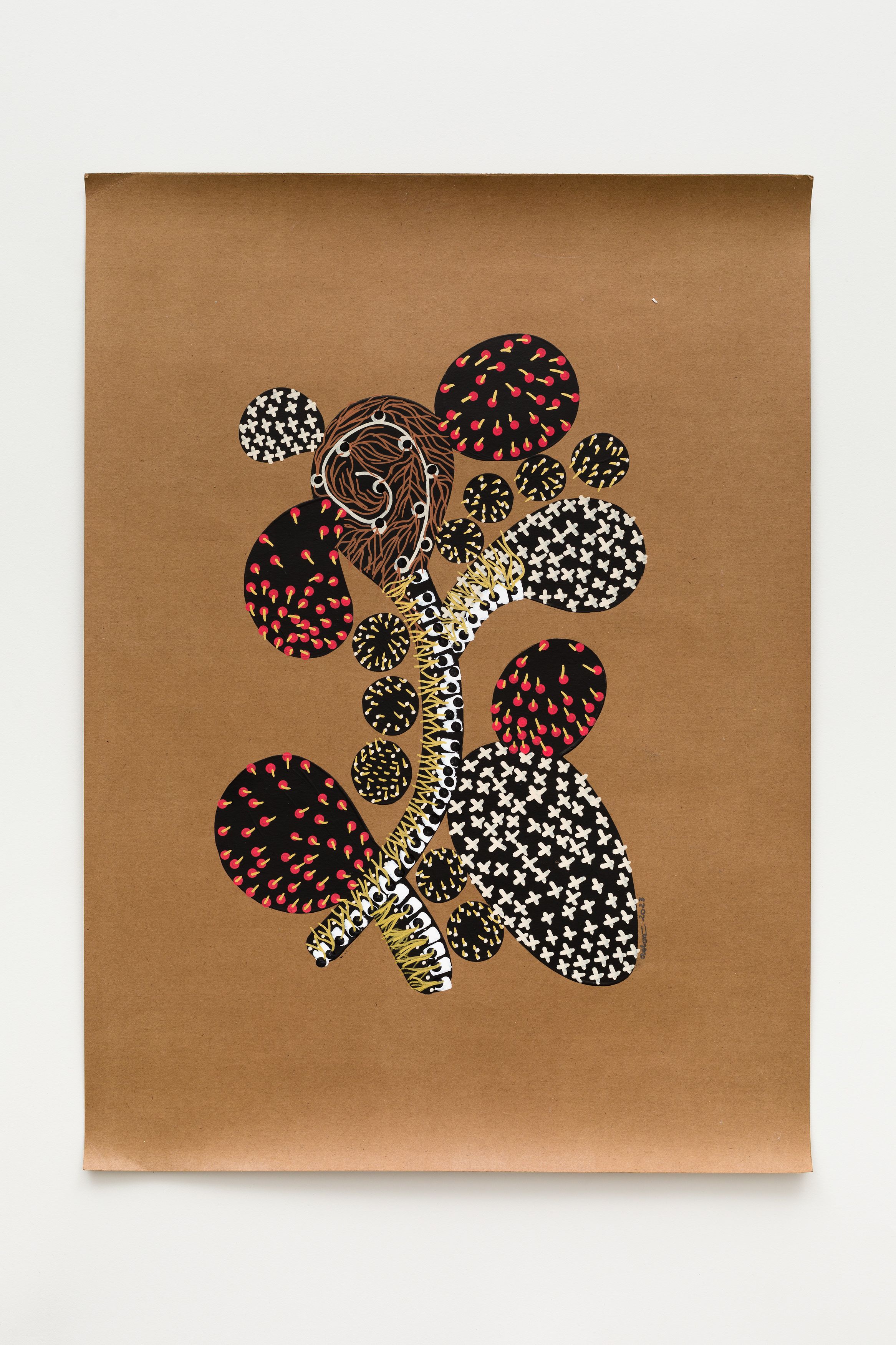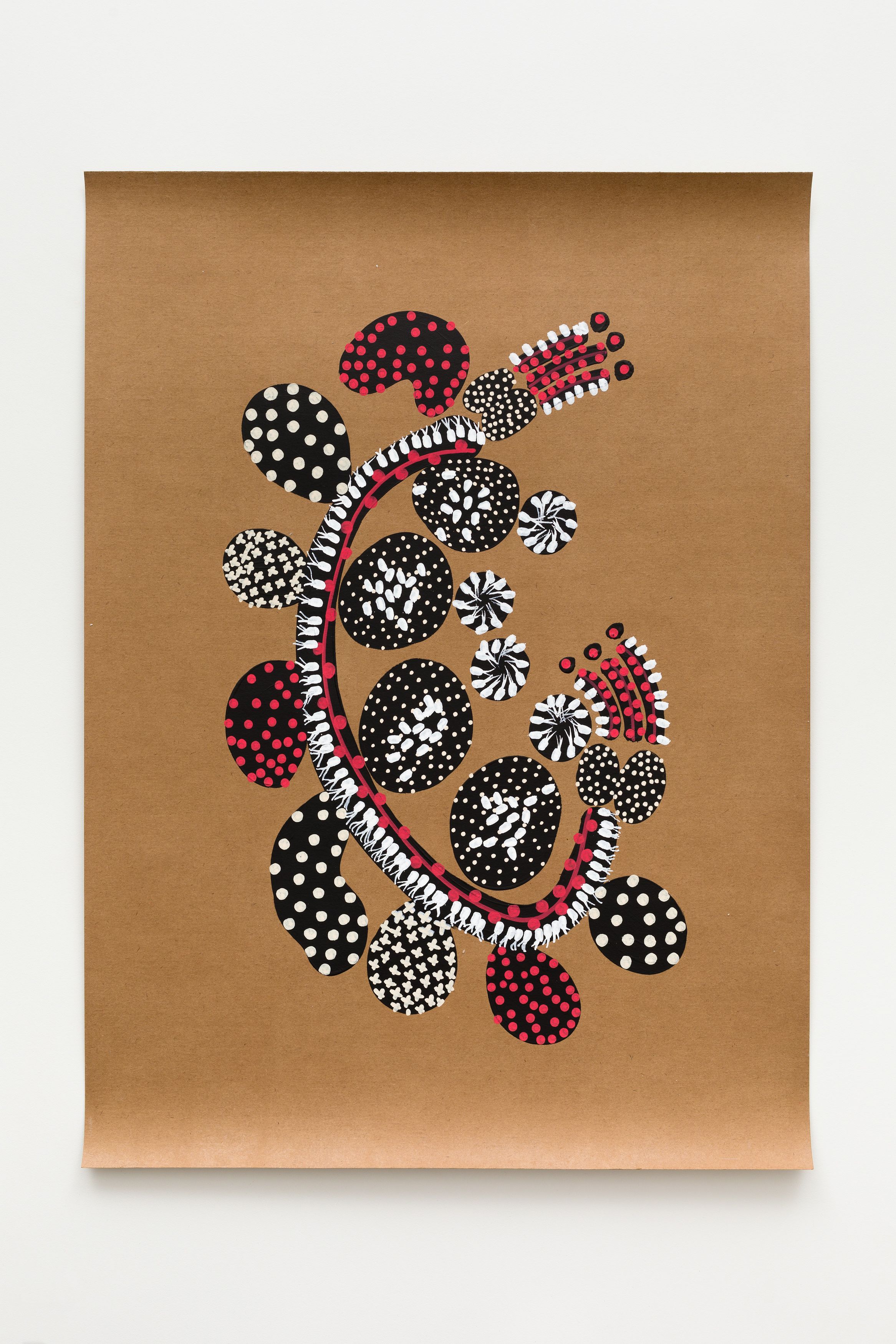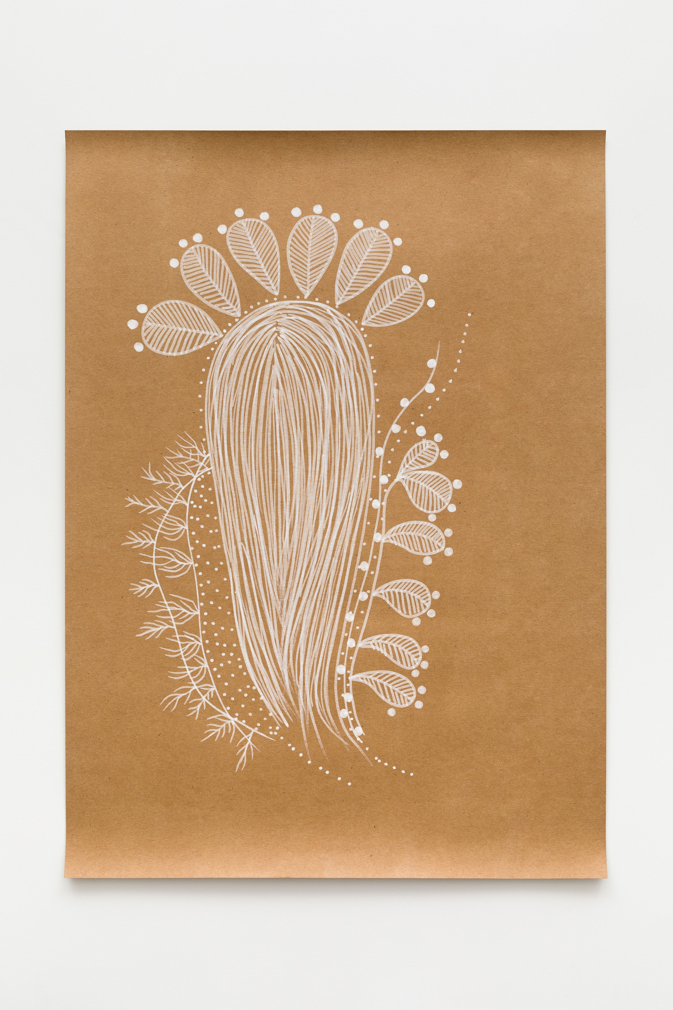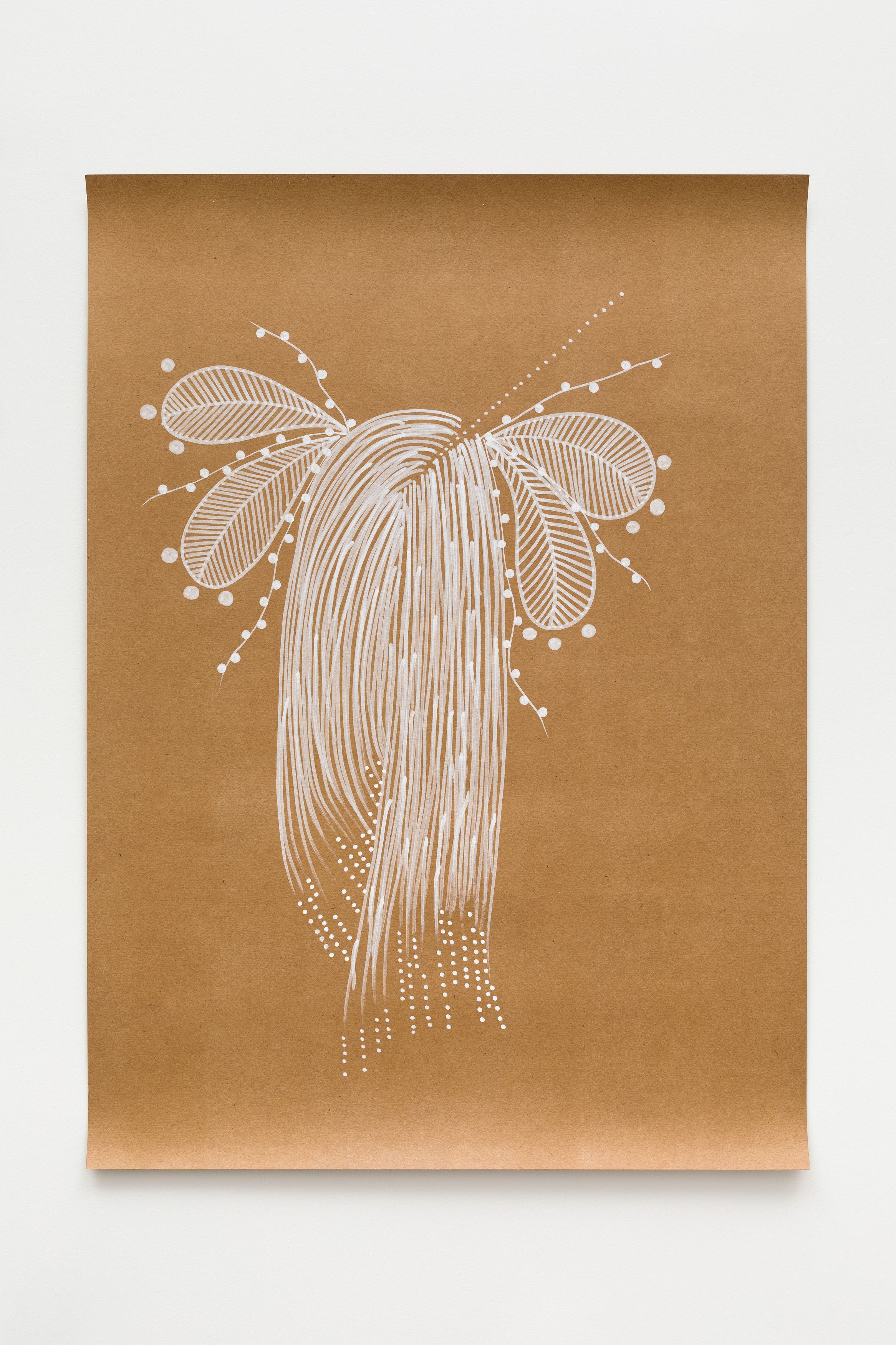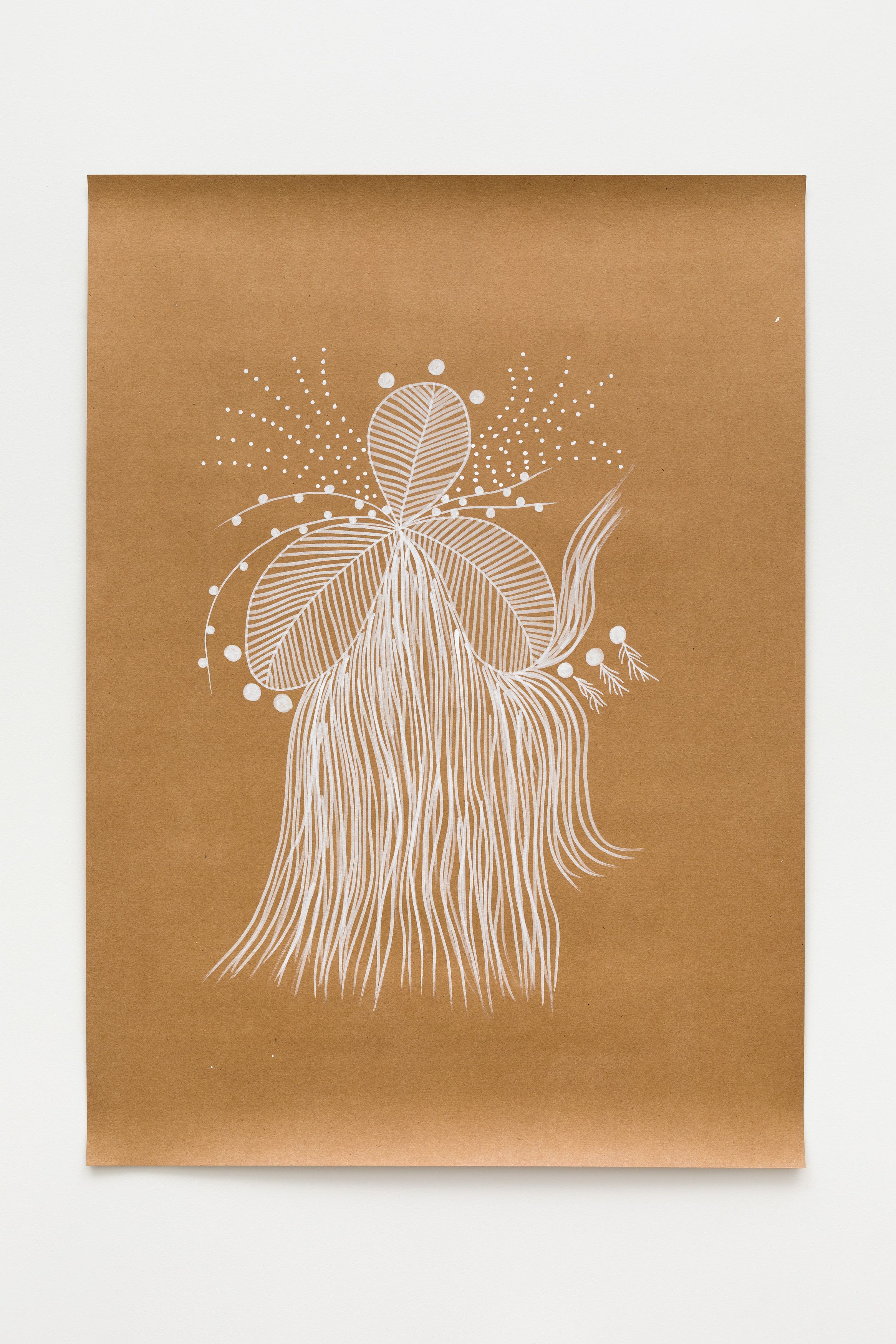 The works presented in Endless River refer to and build upon Pankararu’s unique worldview through the visual and material alike: the white pigment used in many of his paintings is a natural clay material traditionally used by the Pankararu to adorn the body for ceremonies, making each monochromatic work a body, a group of bodies, and a sampler of ornamental possibility. Other works burst with color, showing the vibrant and fecund natural world of cacti, roots, leaves, seed pods, and flowers that reference the earthy terrains and flora as well as the ingredients and elements for healing, as well as the forest setting where healers work.