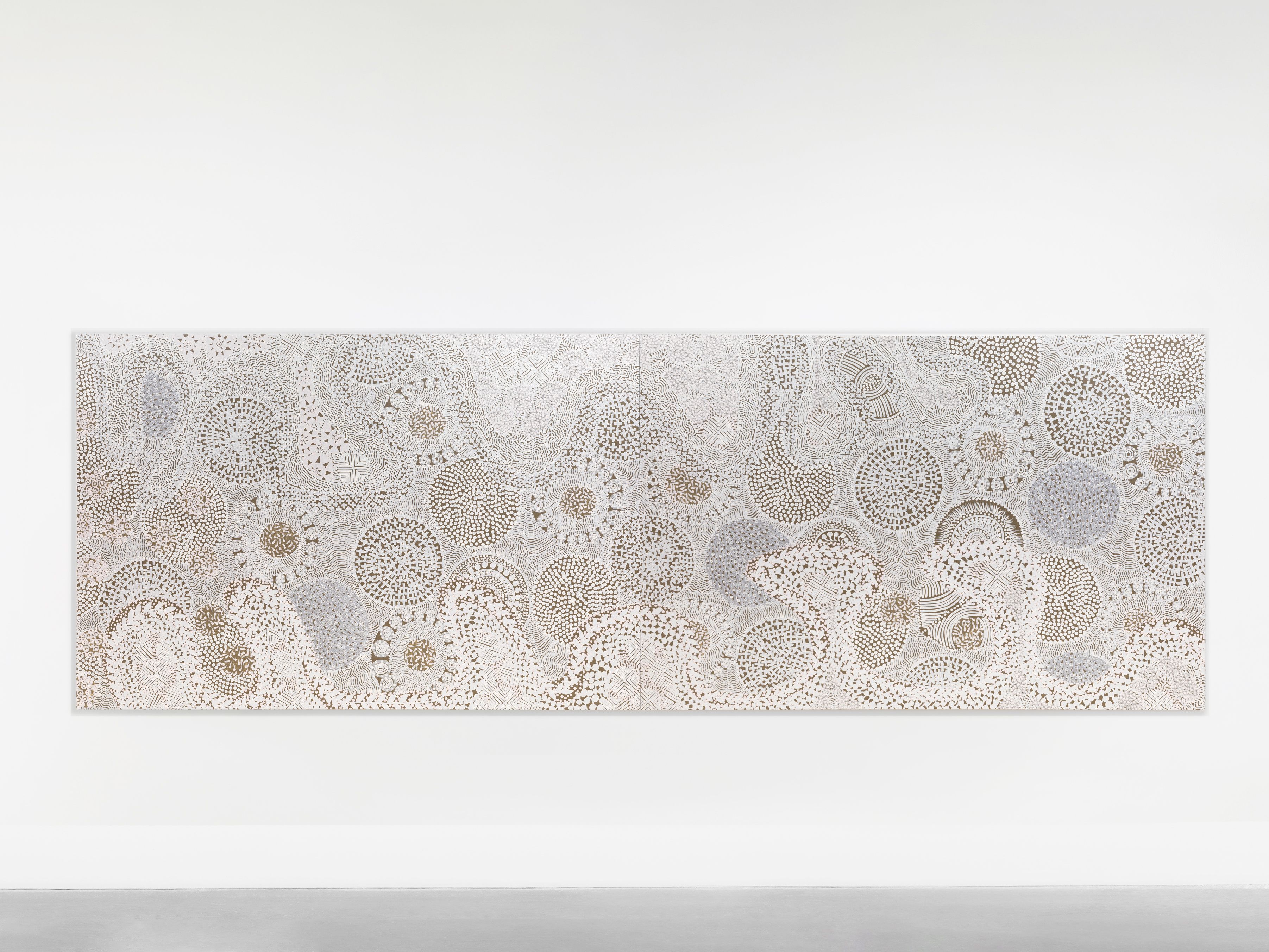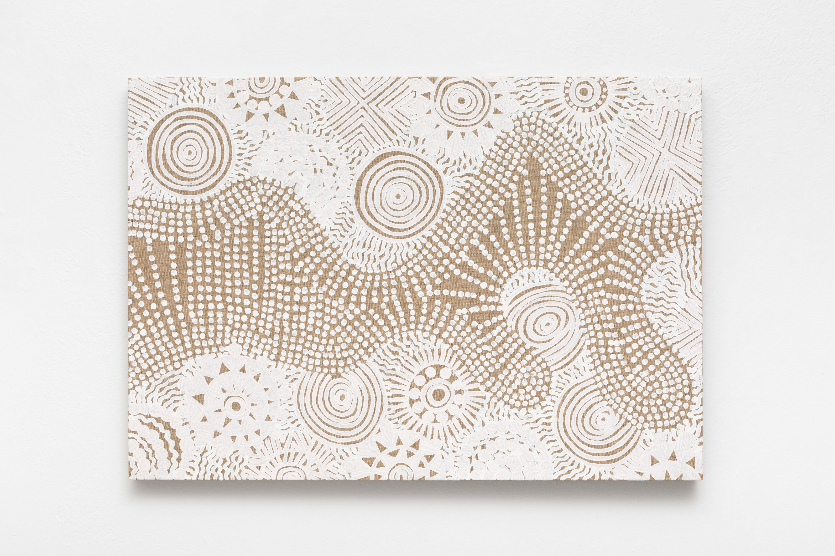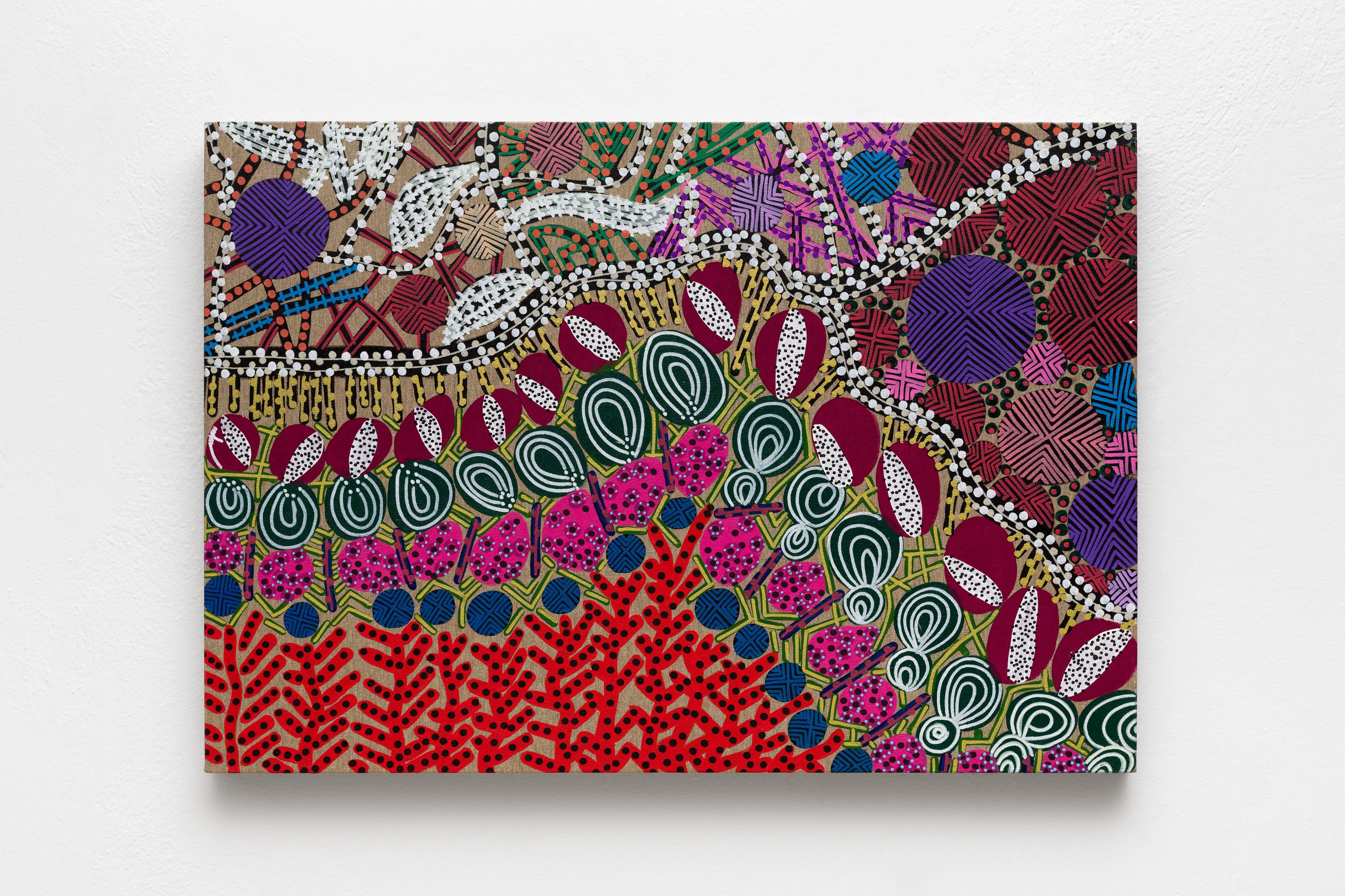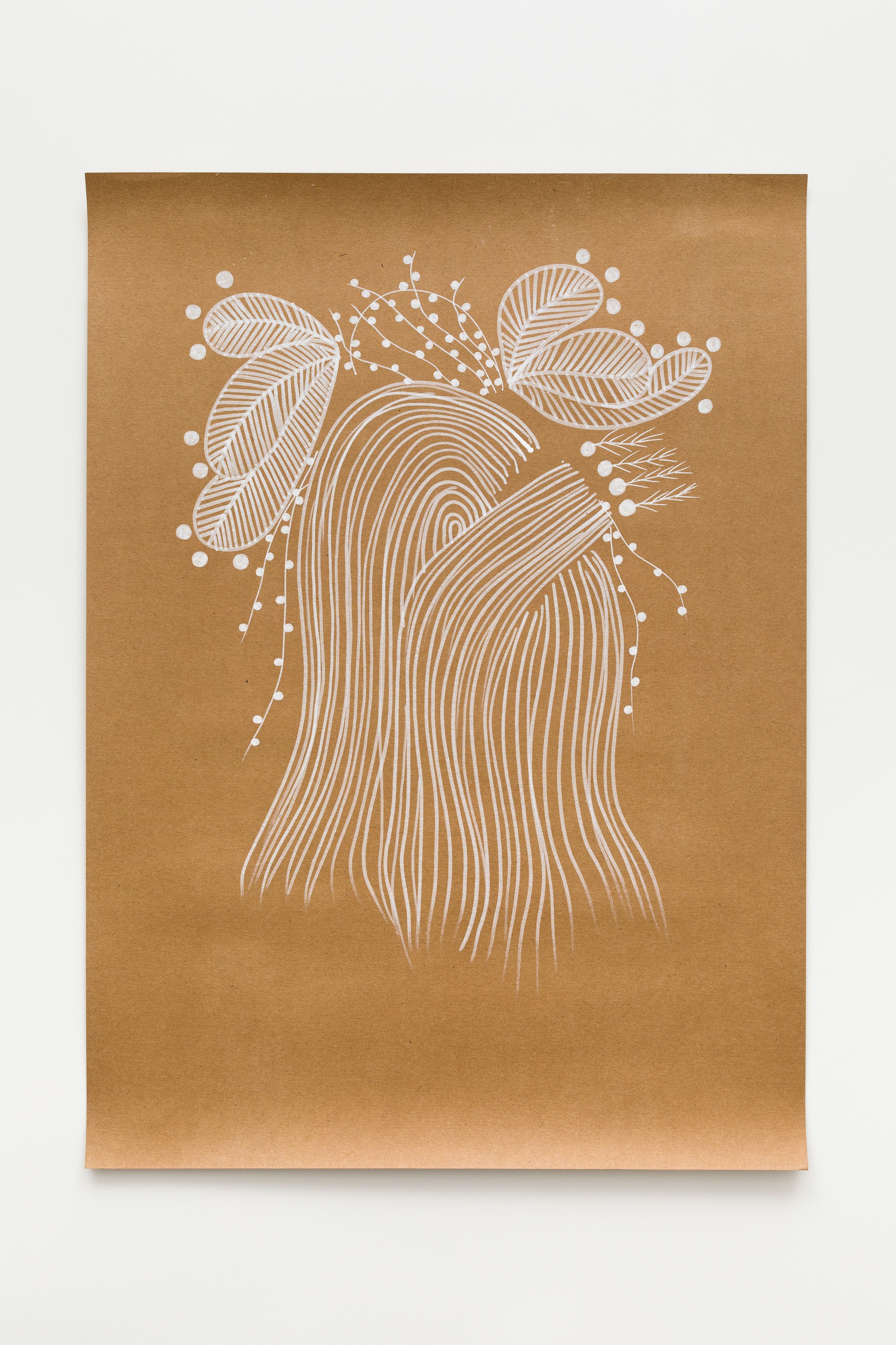 The works presented in Endless River refer to and build upon Pankararu’s unique worldview through the visual and material alike: the white pigment used in many of his paintings is a natural clay material traditionally used by the Pankararu to adorn the body for ceremonies, making each monochromatic work a body, a group of bodies, and a sampler of ornamental possibility. Other works burst with color, showing the vibrant and fecund natural world of cacti, roots, leaves, seed pods, and flowers that reference the earthy terrains and flora as well as the ingredients and elements for healing, as well as the forest setting where healers work.