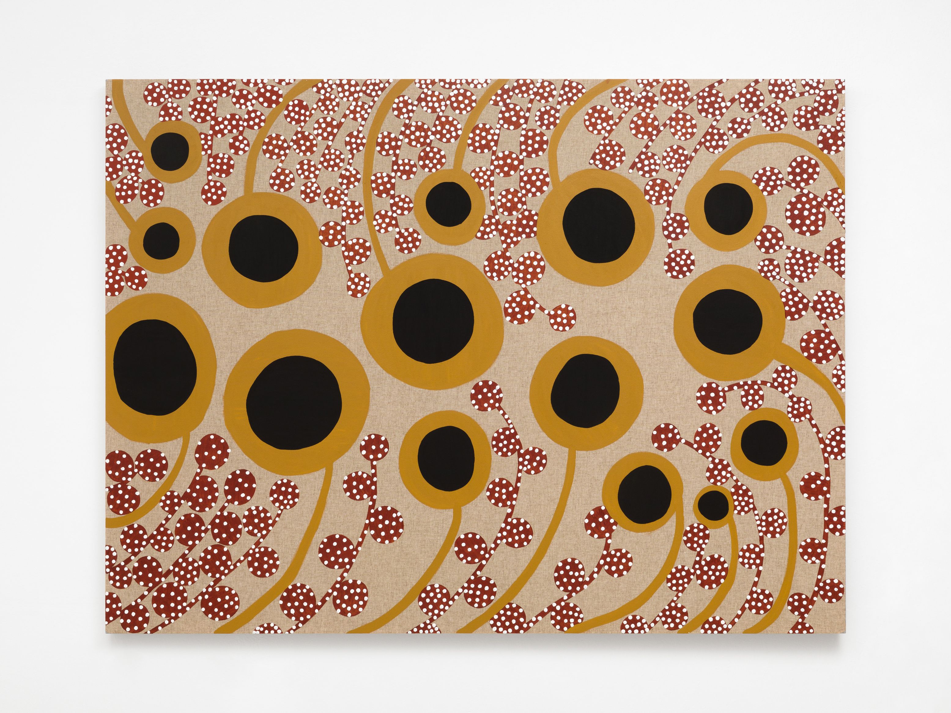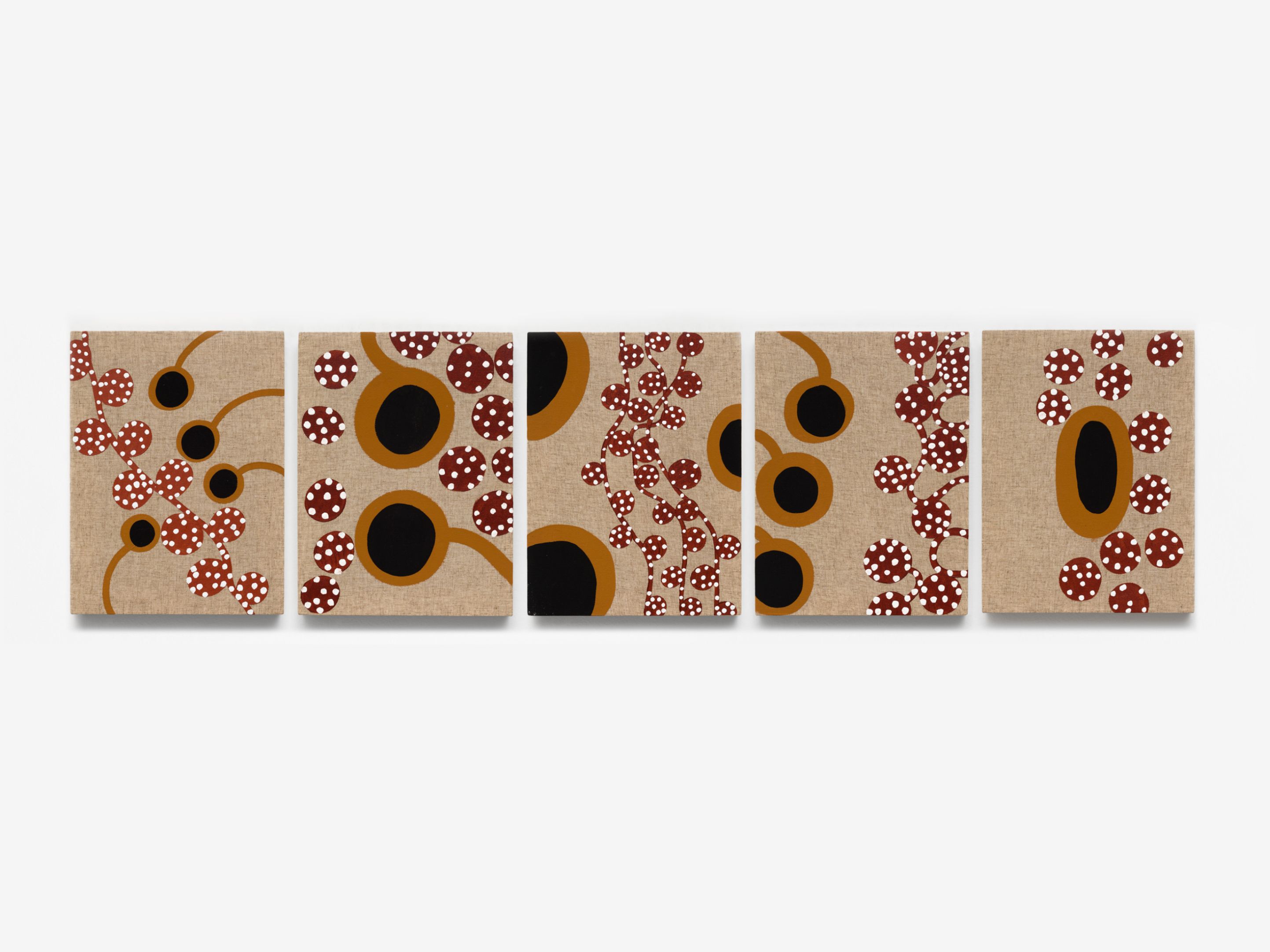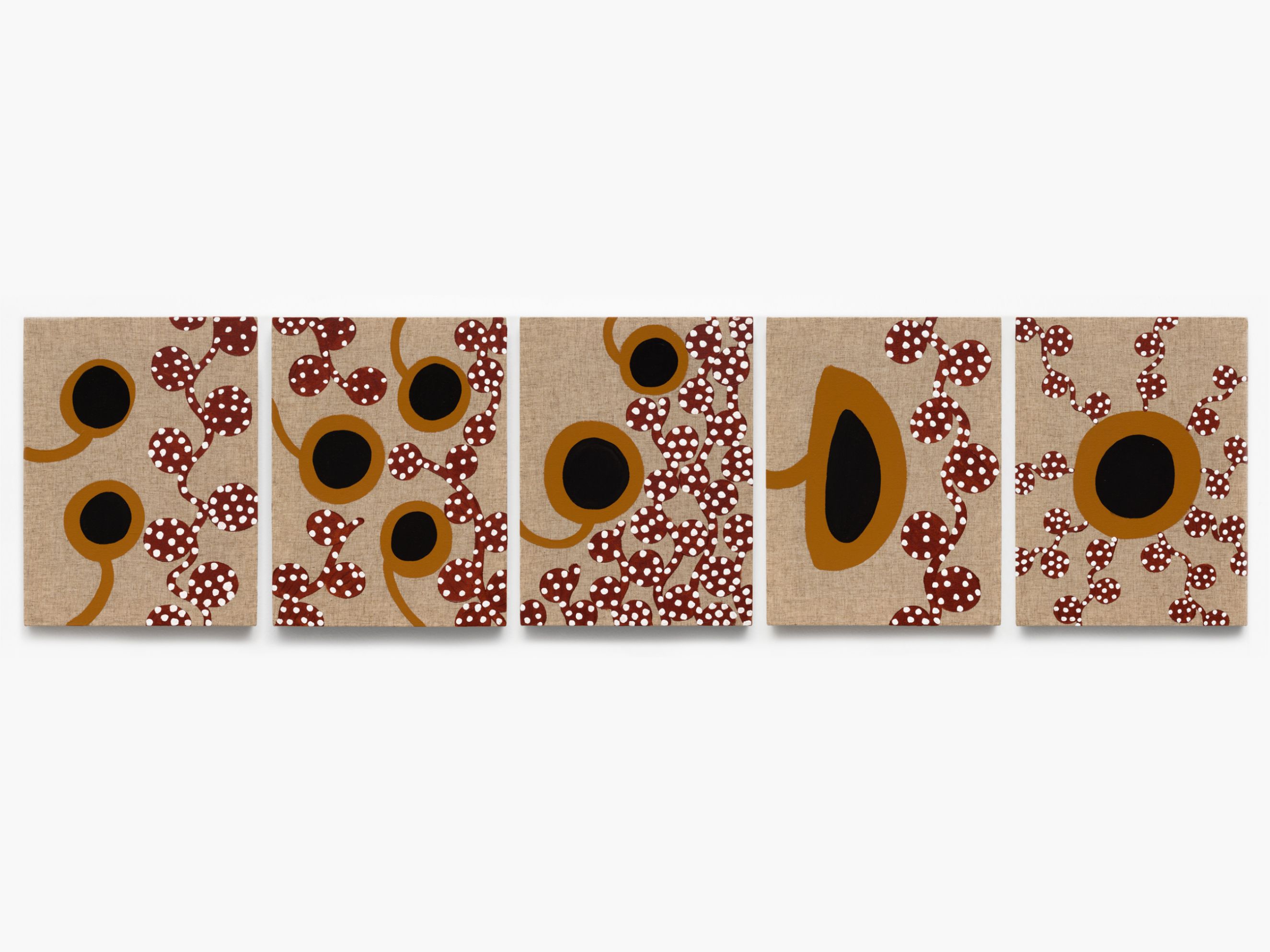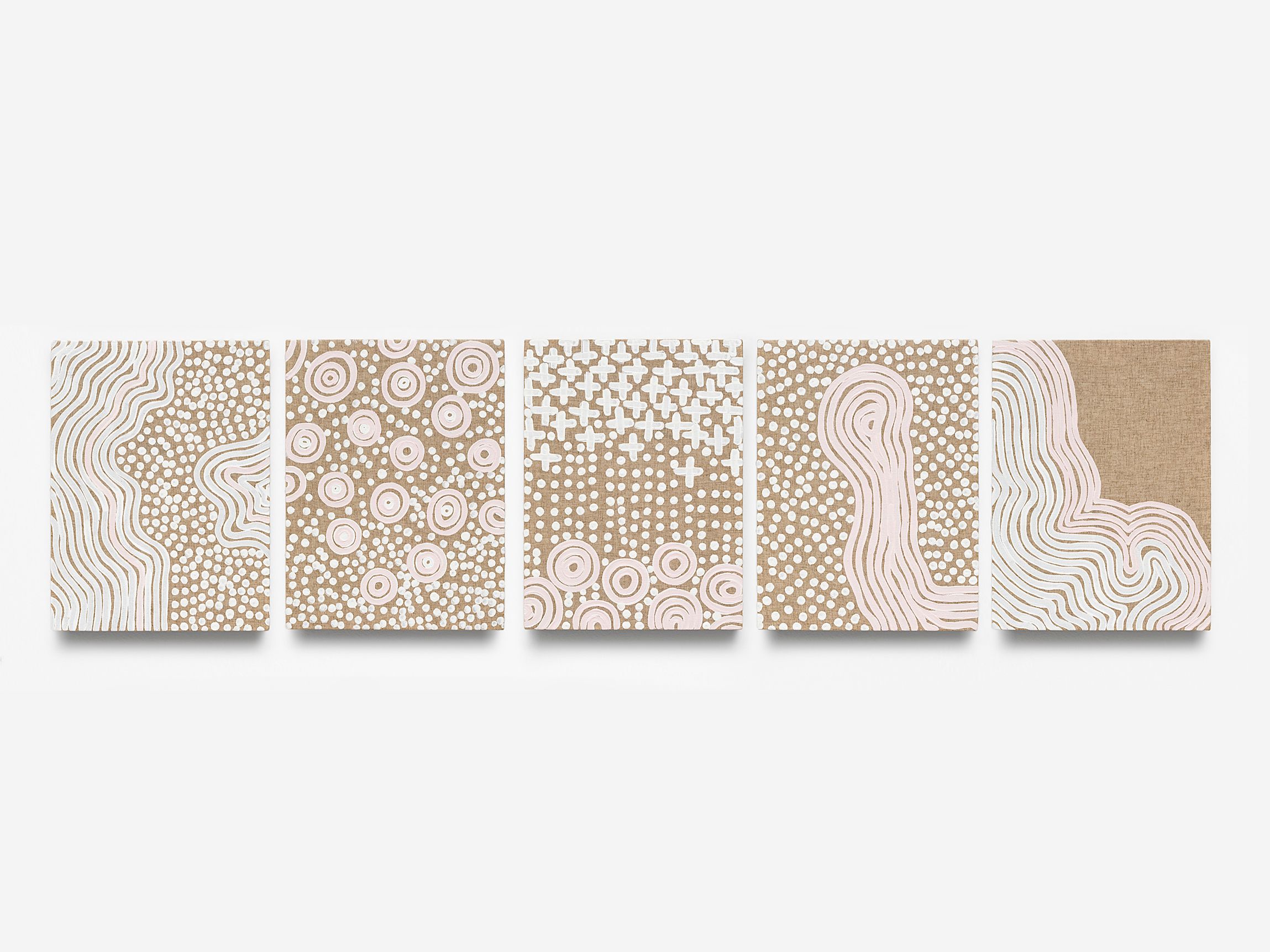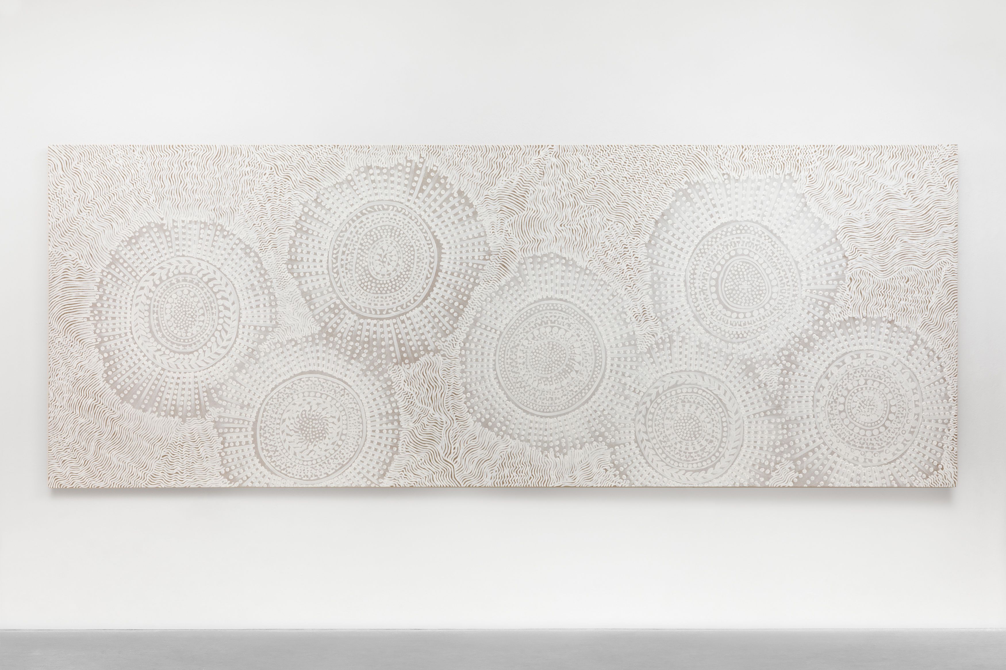 The works presented in Endless River refer to and build upon Pankararu’s unique worldview through the visual and material alike: the white pigment used in many of his paintings is a natural clay material traditionally used by the Pankararu to adorn the body for ceremonies, making each monochromatic work a body, a group of bodies, and a sampler of ornamental possibility. Other works burst with color, showing the vibrant and fecund natural world of cacti, roots, leaves, seed pods, and flowers that reference the earthy terrains and flora as well as the ingredients and elements for healing, as well as the forest setting where healers work.