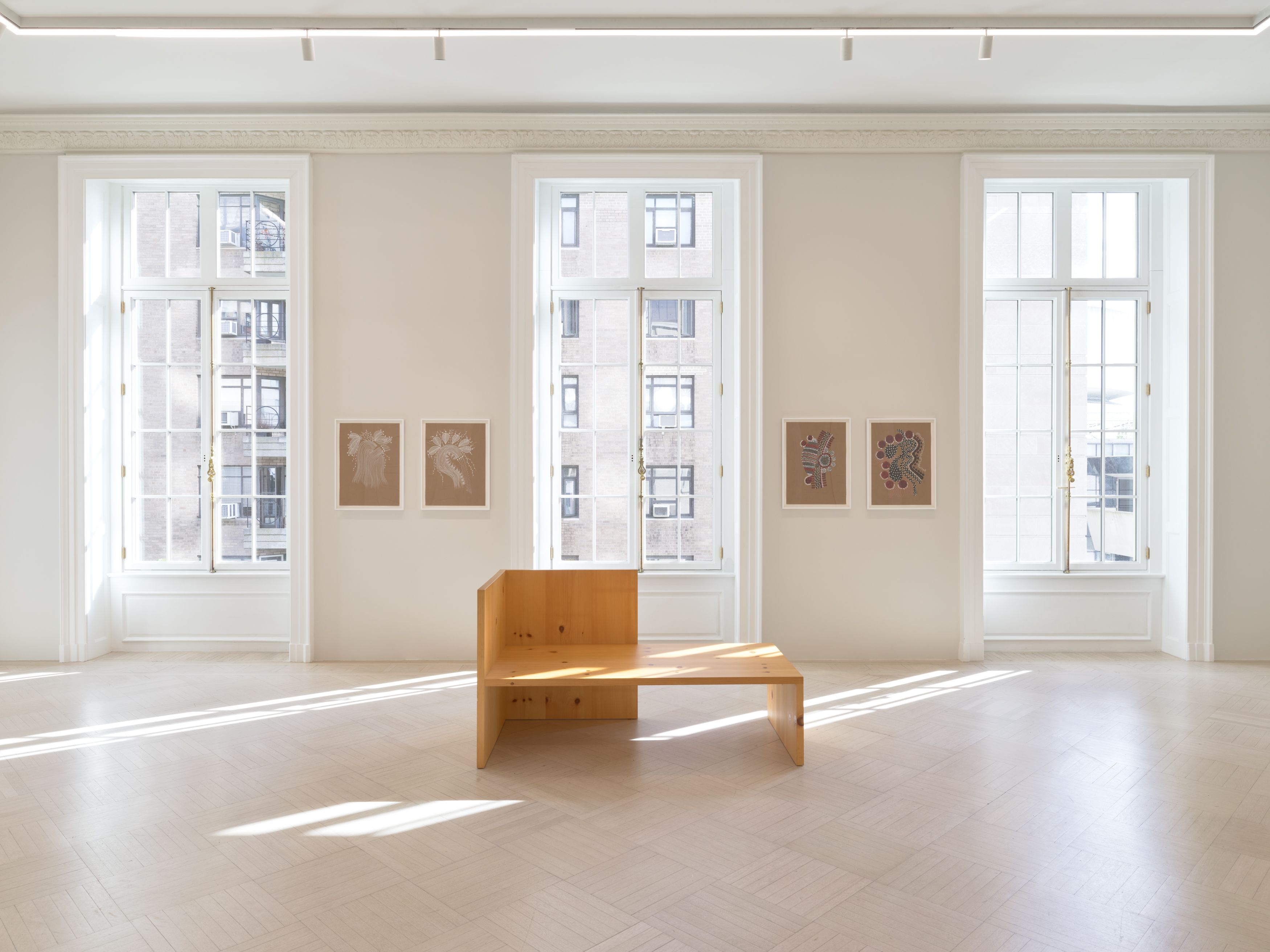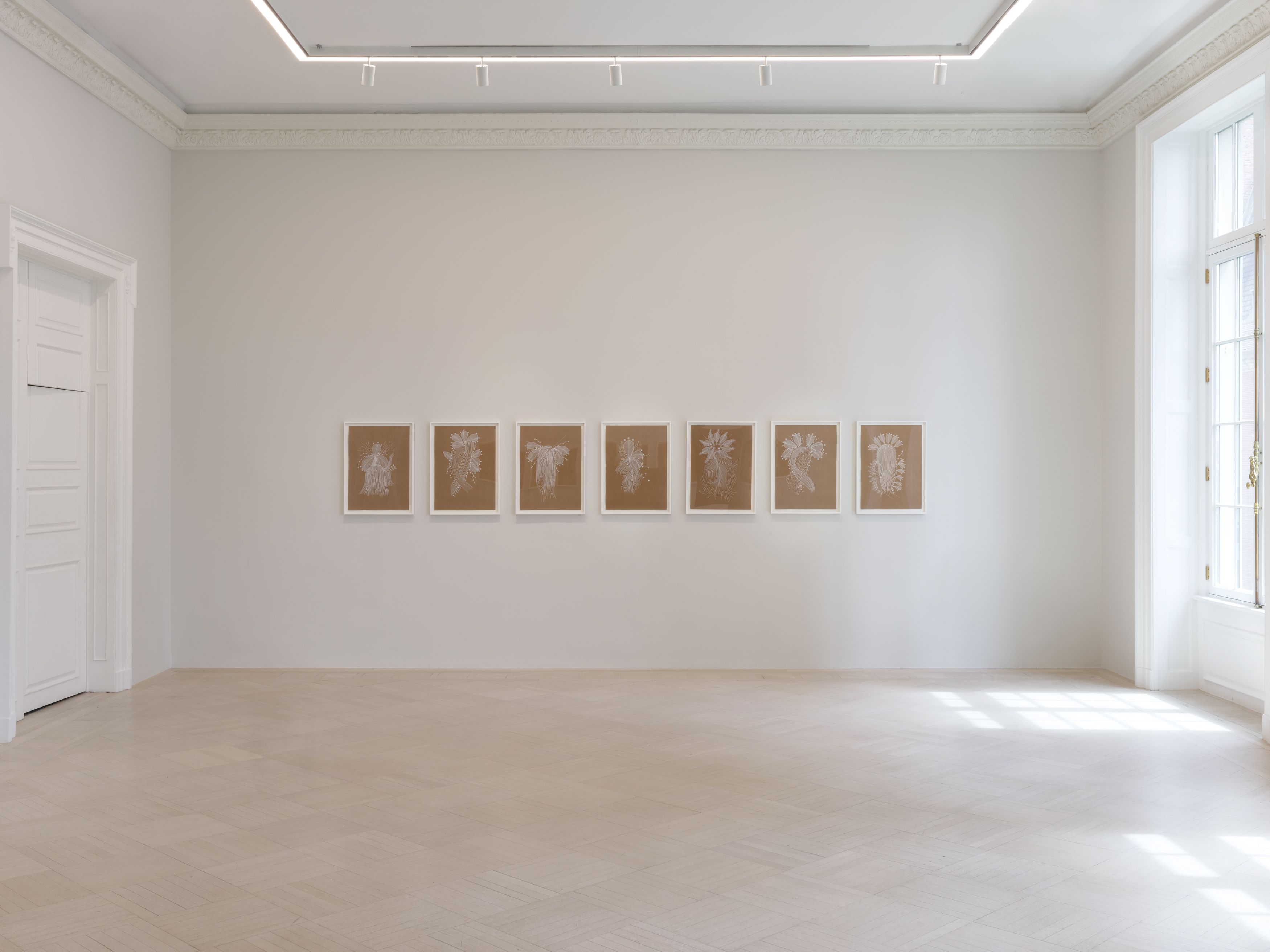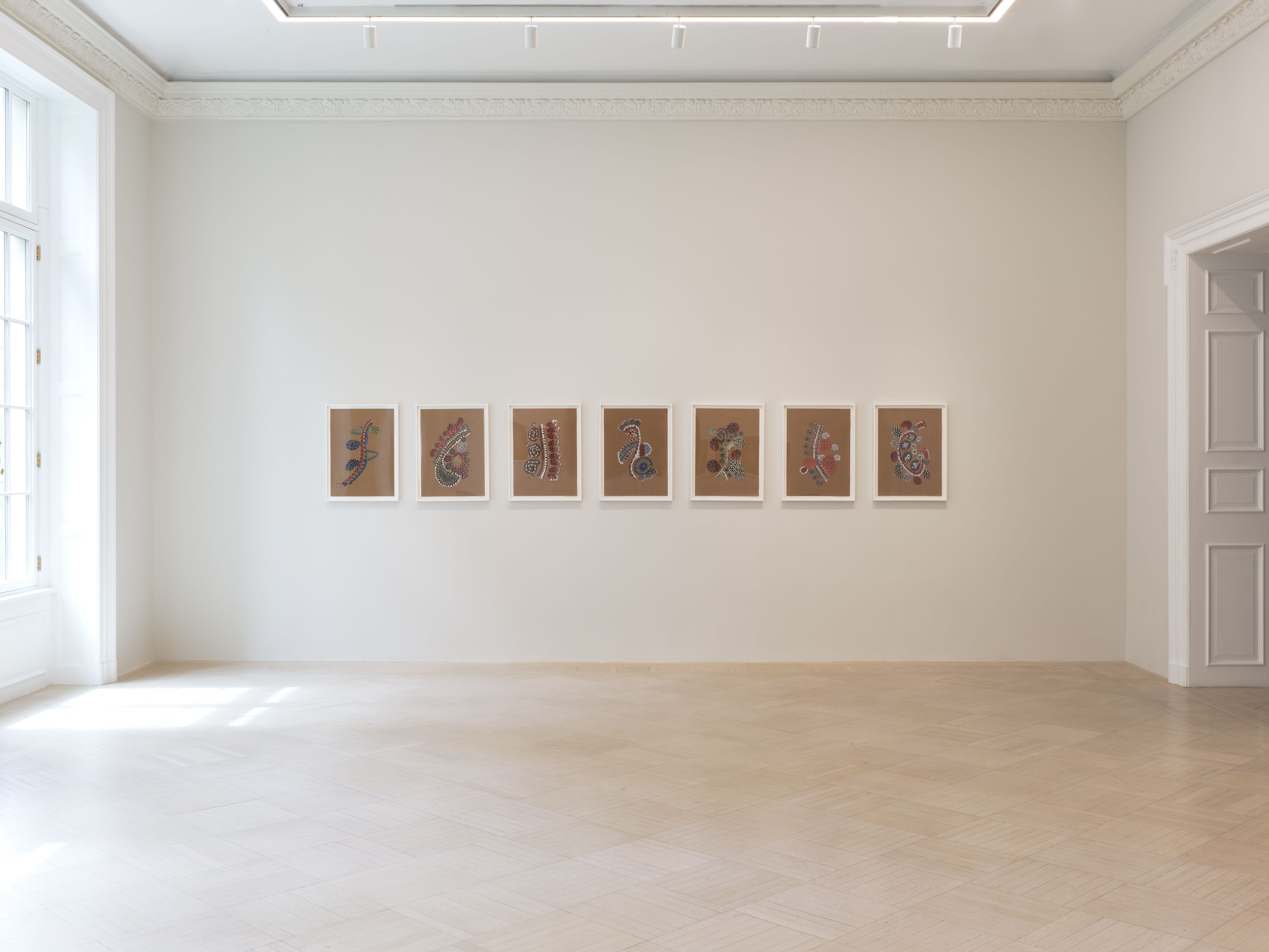 The works presented in Endless River refer to and build upon Pankararu’s unique worldview through the visual and material alike: the white pigment used in many of his paintings is a natural clay material traditionally used by the Pankararu to adorn the body for ceremonies, making each monochromatic work a body, a group of bodies, and a sampler of ornamental possibility. Other works burst with color, showing the vibrant and fecund natural world of cacti, roots, leaves, seed pods, and flowers that reference the earthy terrains and flora as well as the ingredients and elements for healing, as well as the forest setting where healers work.
