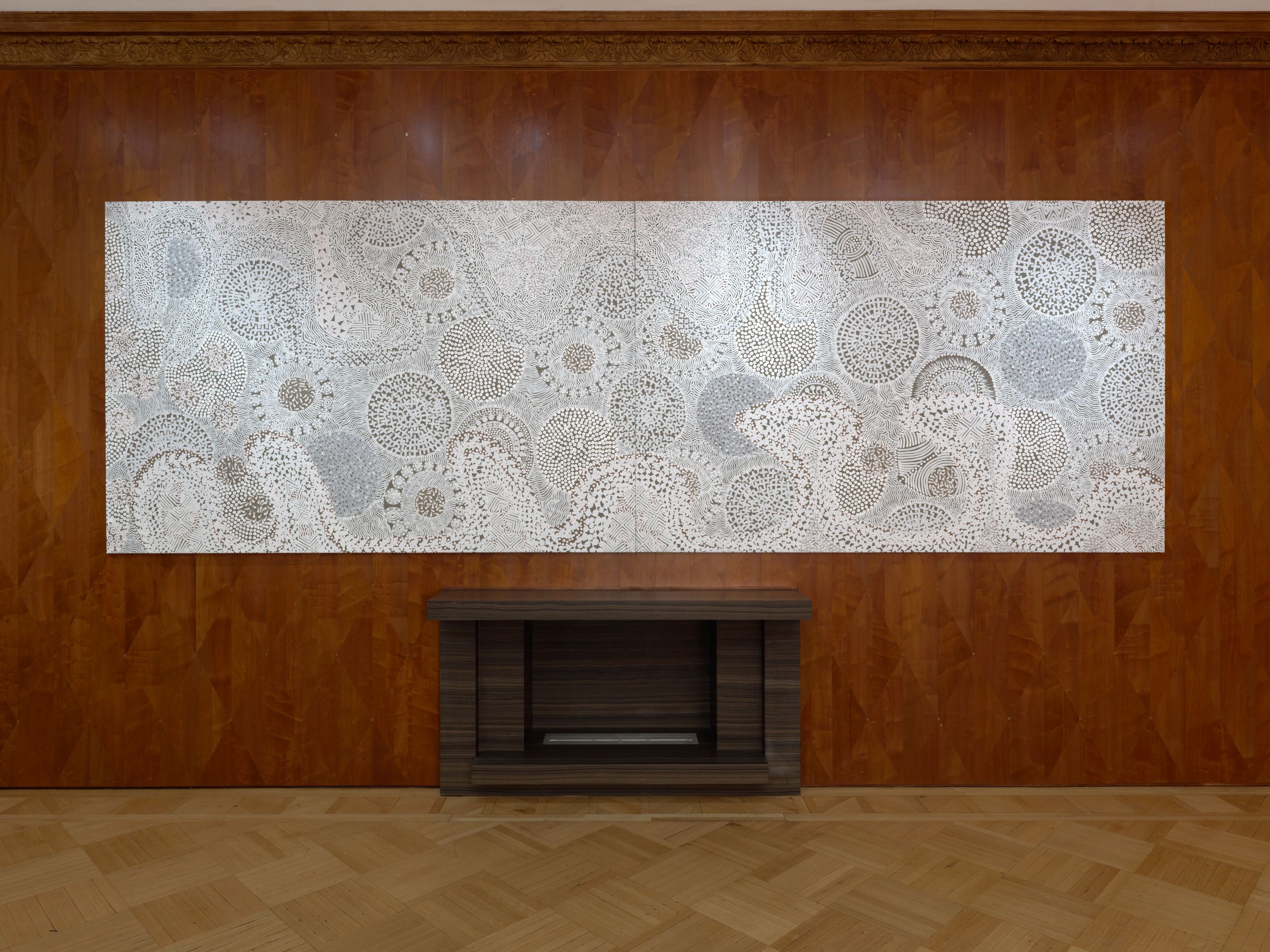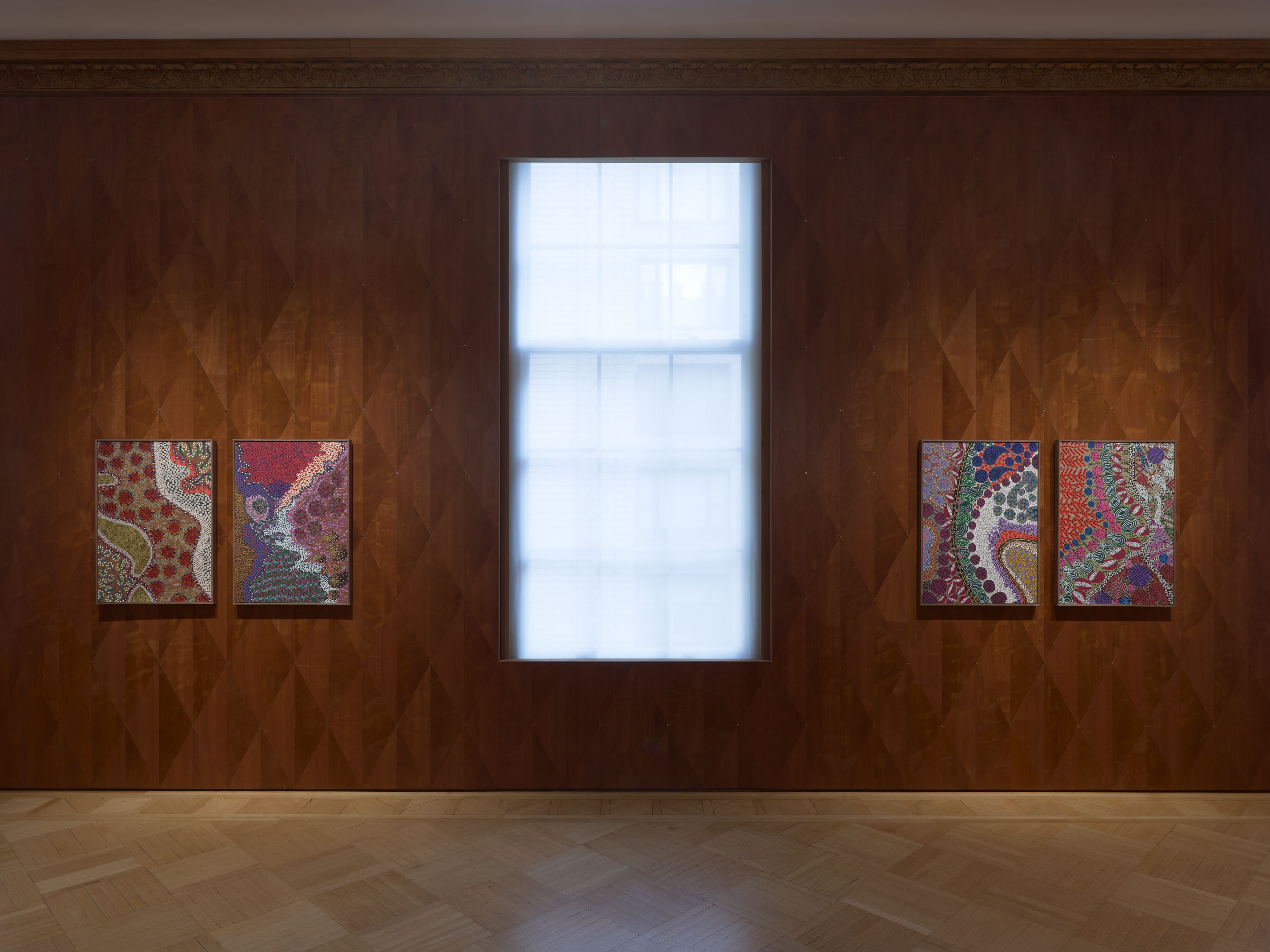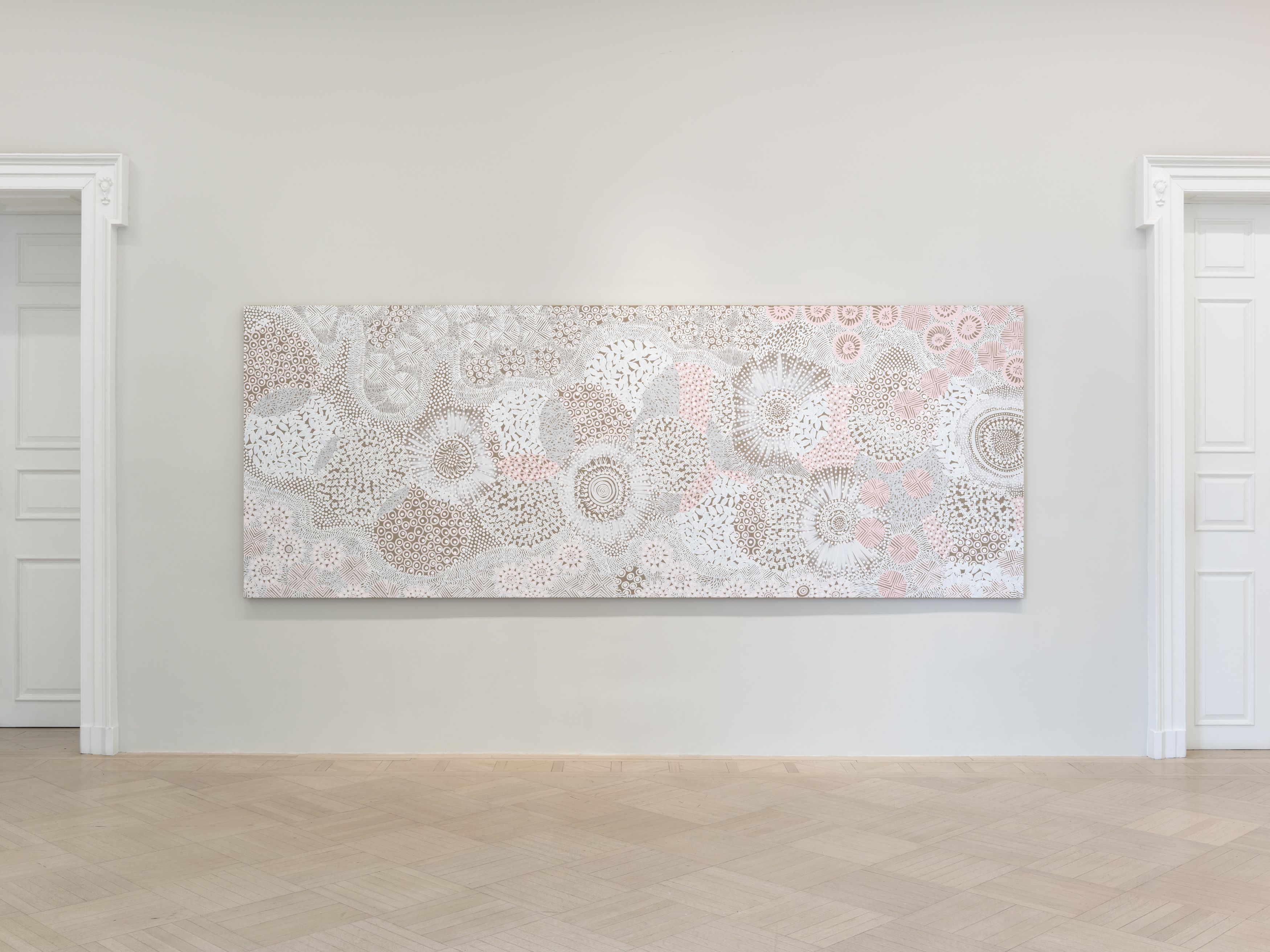 The works presented in Endless River refer to and build upon Pankararu’s unique worldview through the visual and material alike: the white pigment used in many of his paintings is a natural clay material traditionally used by the Pankararu to adorn the body for ceremonies, making each monochromatic work a body, a group of bodies, and a sampler of ornamental possibility. Other works burst with color, showing the vibrant and fecund natural world of cacti, roots, leaves, seed pods, and flowers that reference the earthy terrains and flora as well as the ingredients and elements for healing, as well as the forest setting where healers work.