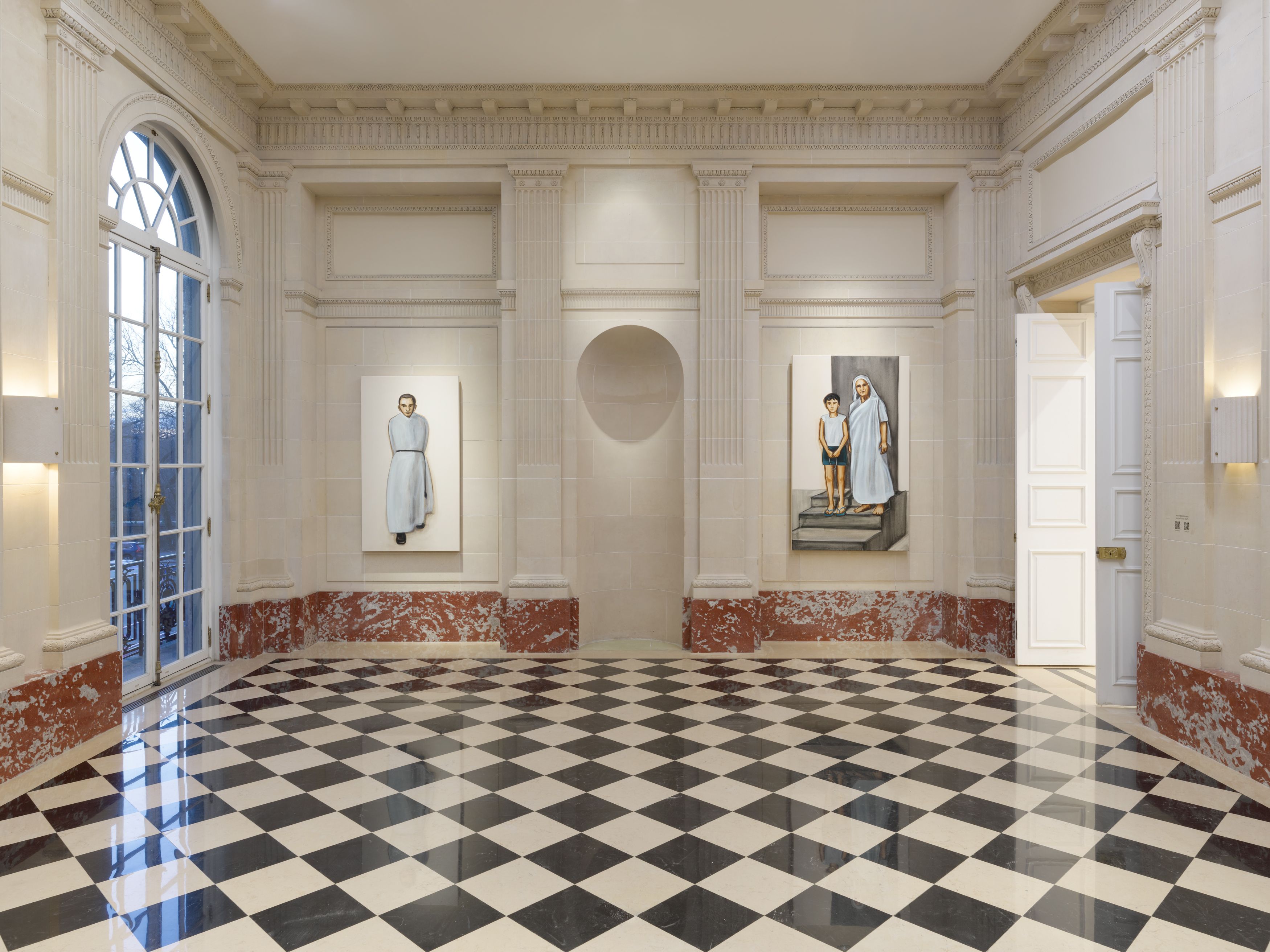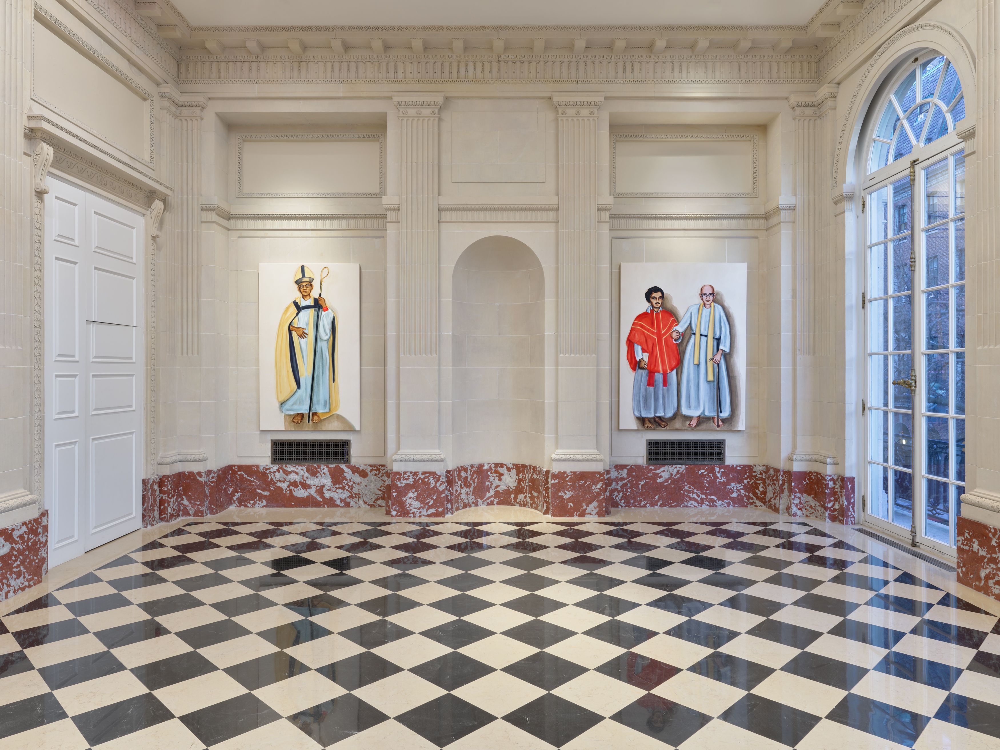 Born in England to a White Christian missionary father and an Indian-born theologian mother, Krishanu moved as an infant with his parents and older brother to Dhaka in 1981, where his father served as a priest in the Church of Bangladesh, established in 1974 in the wake of the country’s independence from Pakistan in 1971. Krishanu’s encounters with flesh-and-blood people, his childhood memories, and the surfeit of emotions tied to places—the Bangladesh of his youth, punctuated by trips to India and back to the UK—undergird and resurface in his paintings, often developed in series that continue for years. The ongoing series Another Country, begun in 2012, follows two young boys in various settings across India and Bangladesh, drawing inspiration from, without being beholden to, photographs of Krishanu and his brother. The rituals and institutions of Christianity are a recurring subject. The Mission series, also begun in 2012, depicts figures—some recalling the artist’s parents—within the processes of blessing, ordination, and preaching, while Holy Family focuses on portraits of brown-skinned bishops, nuns, and priests, deliberately countering the dominant depictions of White clergy and laity that pervade the Euro-American painting canon. There are traces of real people, real lives, yet these are mediated by canvas and brush—suspensions of oil and pigment, surfaces and supports.