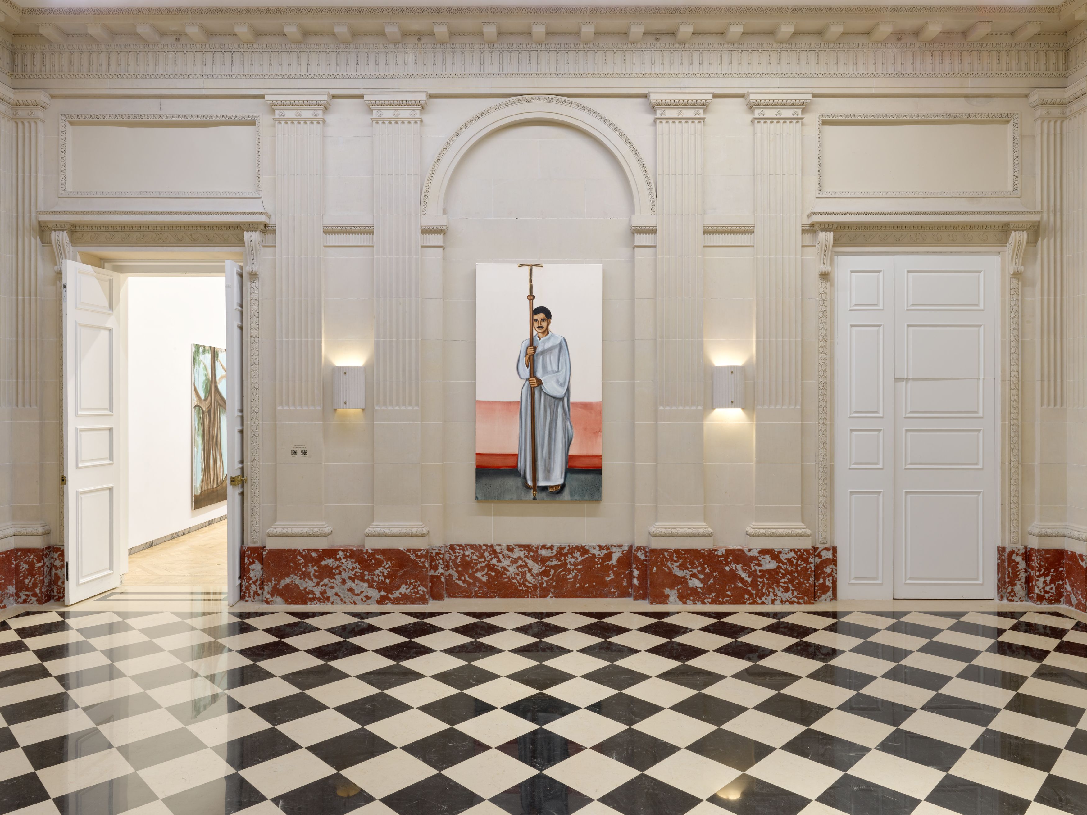 In Blessing (2024), Krishanu materializes tacit ambivalence within the context of Christian rites. The titular act is staged within a simple church interior, suggested by a set of pale orange columns. At center, a Brown bishop presides over the blessing of a man with black hair, his back turned to the viewer and a slash of red fabric draped across his white garments. Standing slightly above him are two White priests in profile, who lay their hands in solemn ceremony, pale against the black of his head. As in many of Krishanu’s Mission paintings, the focus of the scene is on the Brown members of the clergy and congregation—boys and women huddled together in the foreground. At the painting’s far left, three young robed men flanking the ceremony are shown in full view: two observe the ritual, while the central figure faces the viewer yet looks off into the distance. Within each canvas, Krishanu balances restraint and freedom, availing himself of the vast repertoire of painterly techniques, toggling between the generic and the particular, and probing the internal psychological struggles of individuals and the social structures that shape them.