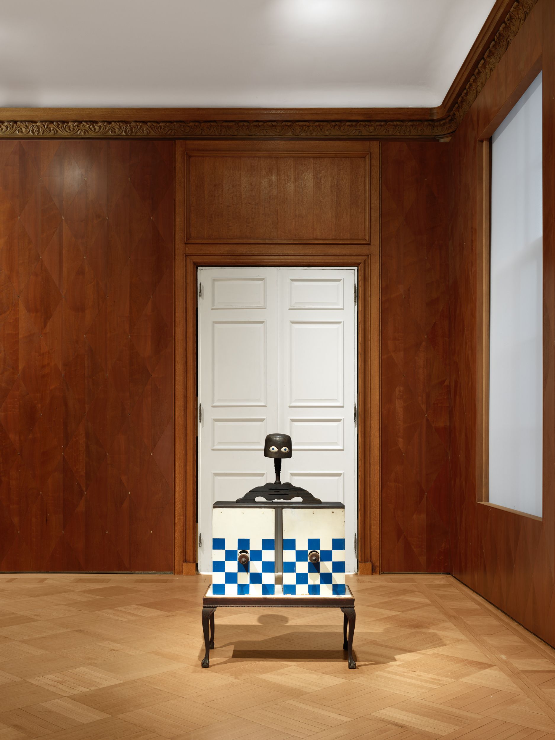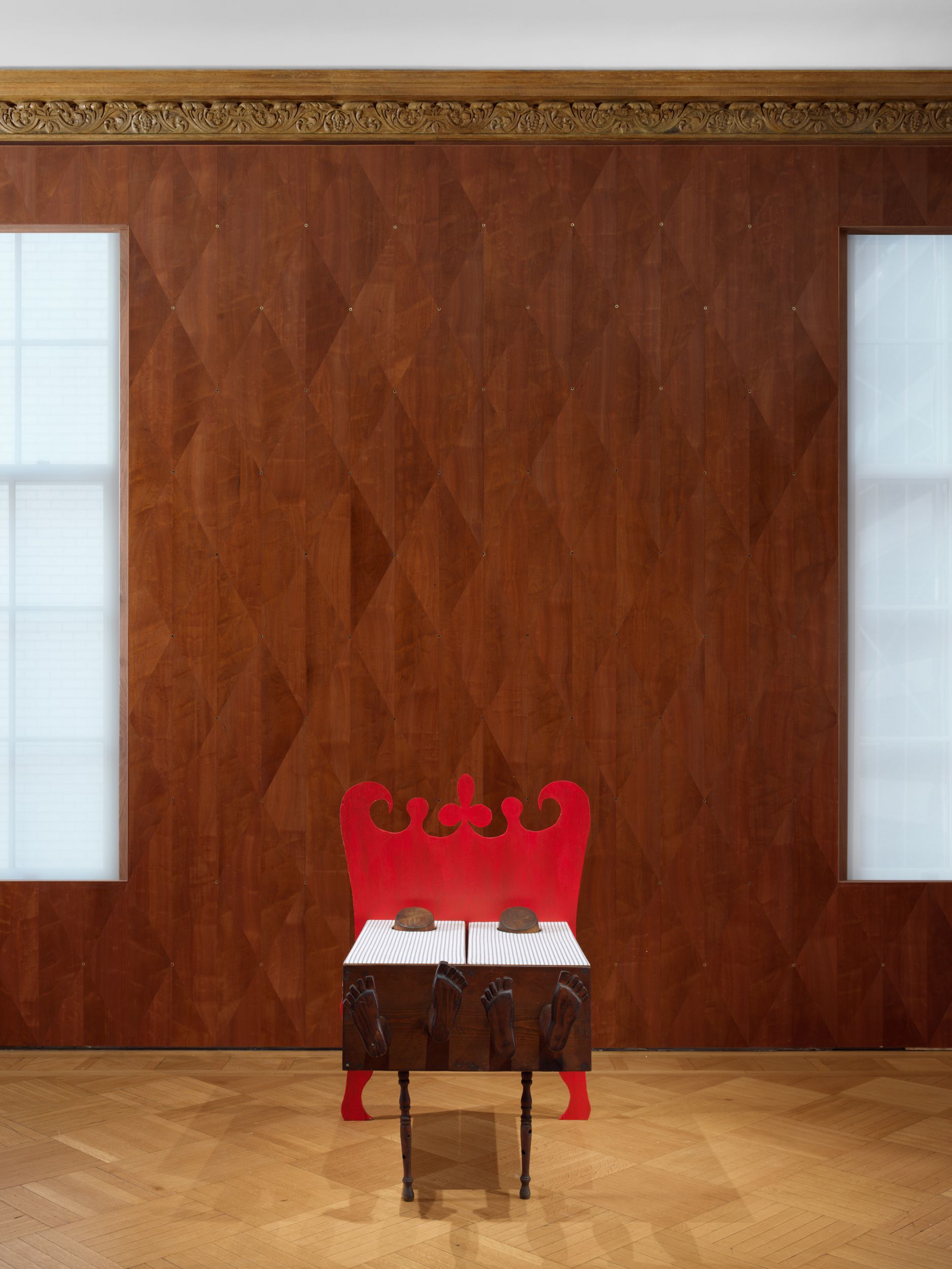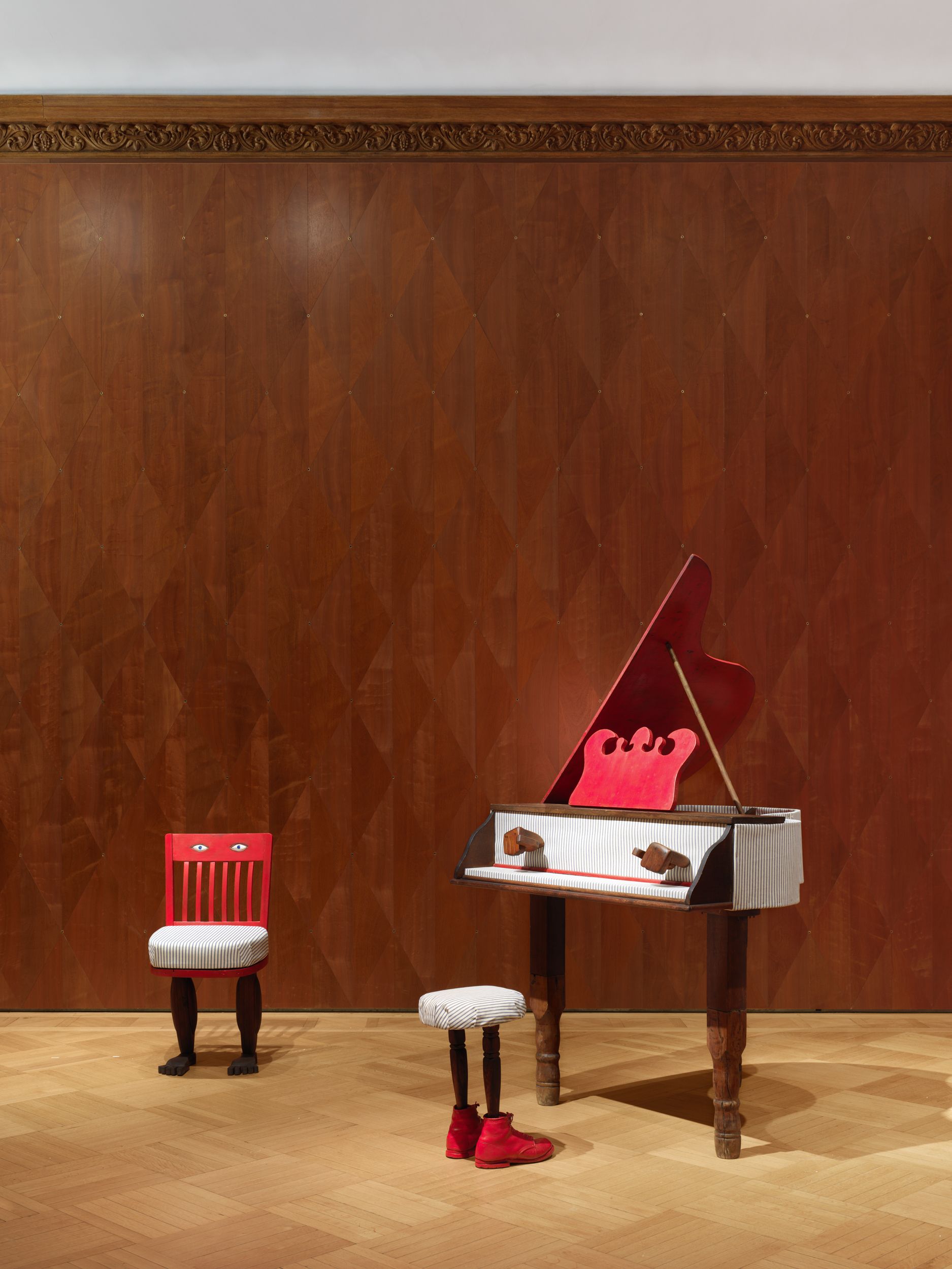 Assembled together for the first time in 50 years, Millett’s Fantasy Furniture works are hand-carved of wood, upholstered in mattress ticking and combined with found objects into anthropomorphic sculptures resembling domestic furniture; Chair, 1965 stands on two feet; Blue Eyed Marble Box, 1965, a cabinet of curiosities, peers out from a head with two blue eyes; Bed, 1965 with two sets of legs and heads protruding, suggesting a scene of two resting partners.