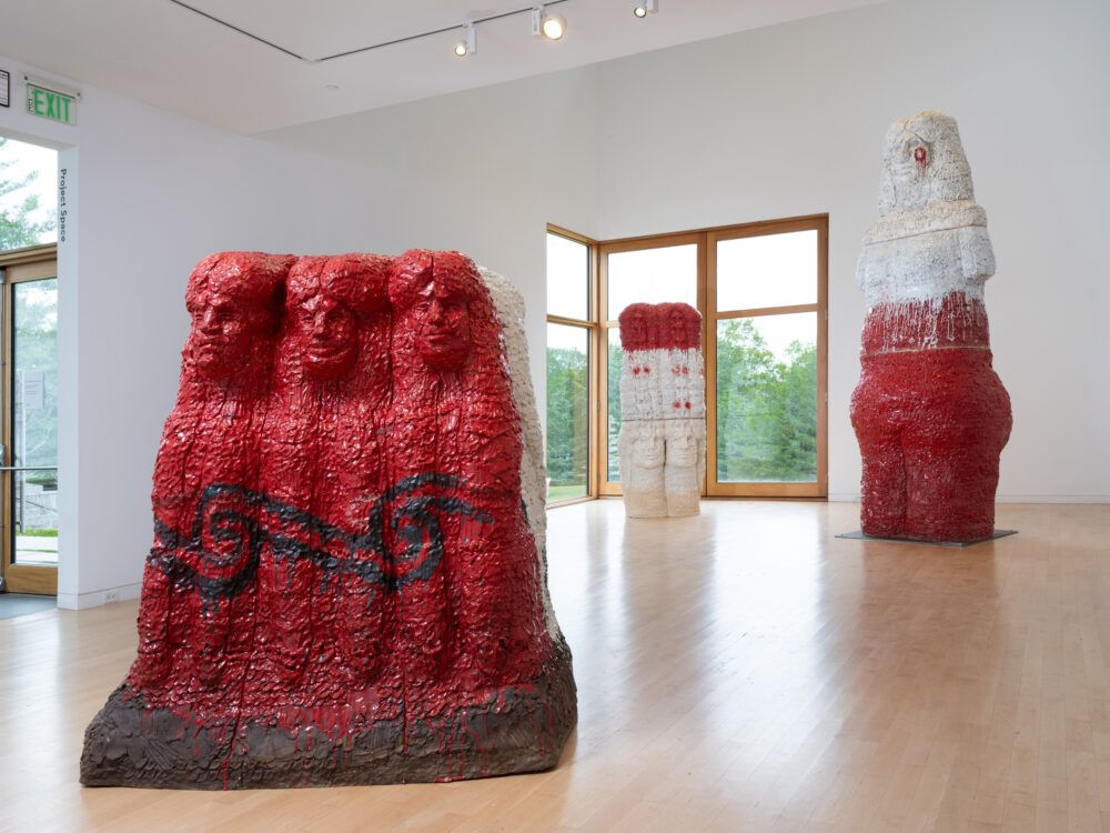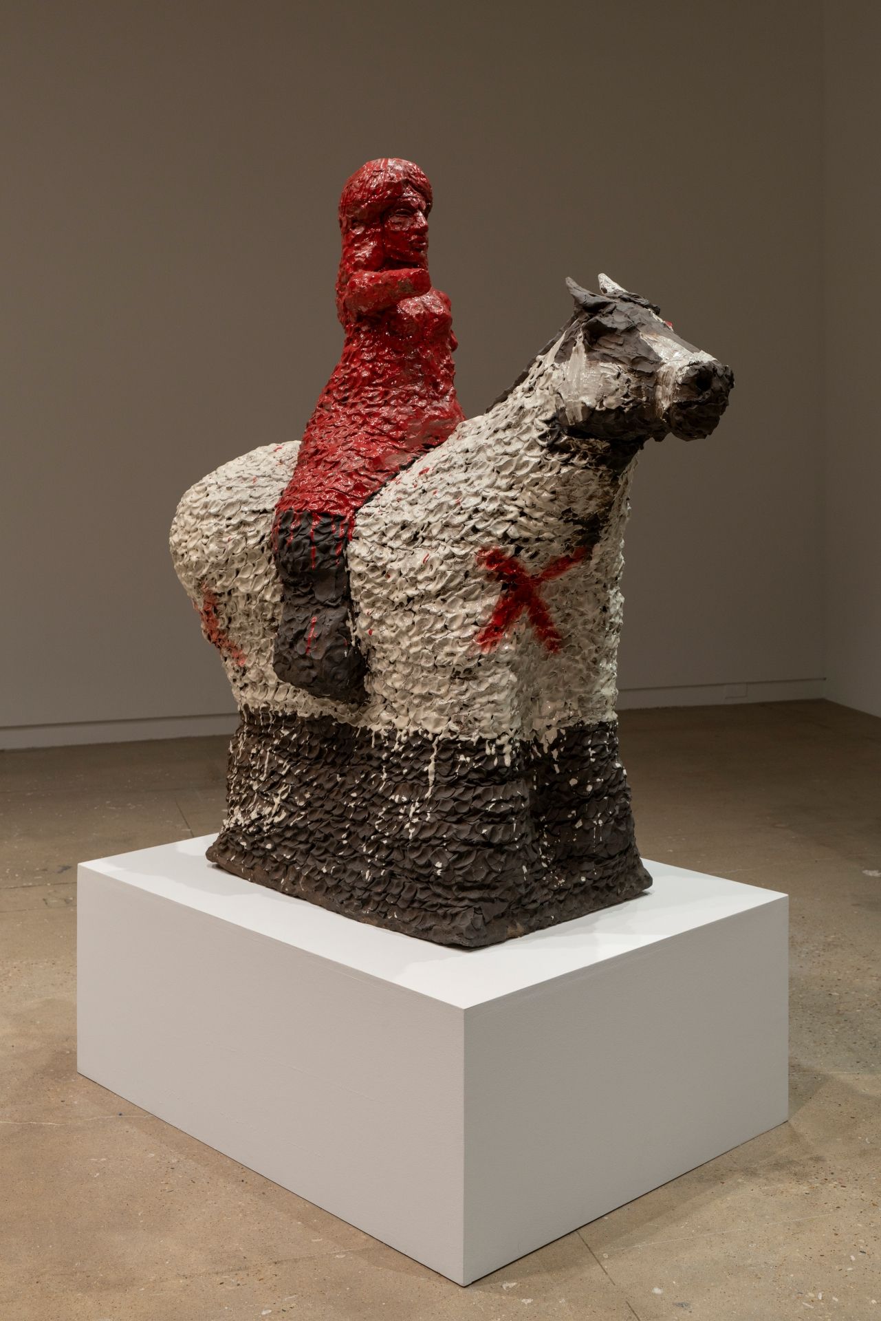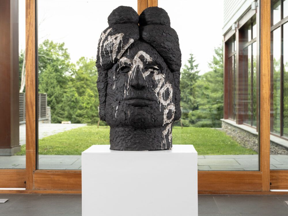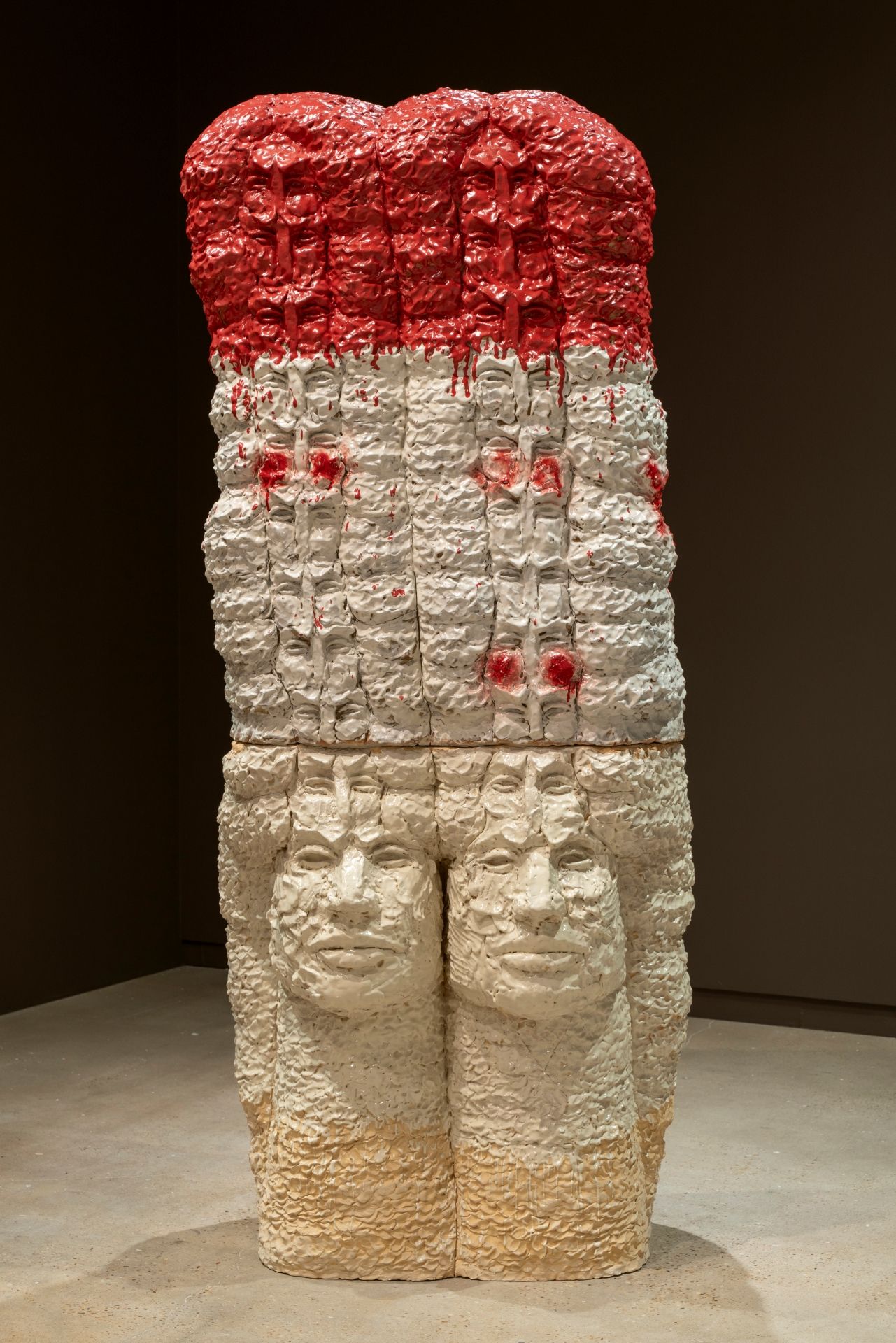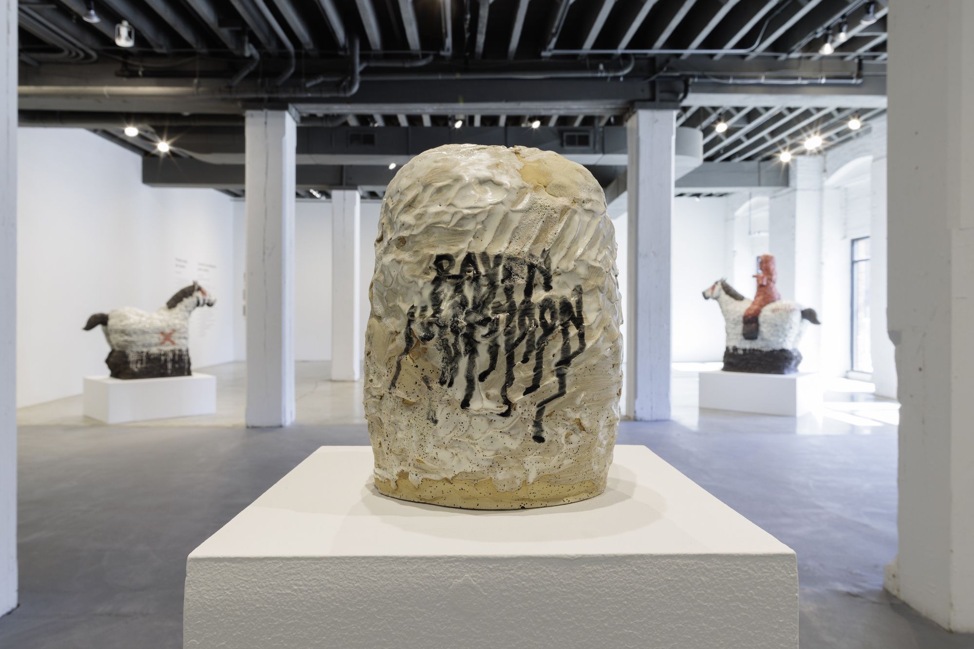 Raven Halfmoon’s practice spans torso-scaled and colossal-sized stoneware sculptures, with some soaring up to twelve feet and weighing over eight hundred pounds. With inspirations that orbit centuries from ancient Indigenous pottery to Moai statues to Land Art, Halfmoon interrogates the intersection of tradition, history, gender, and personal experience. Born and raised in Norman, Oklahoma, she learned about ceramics as a teenager from a Caddo elder. Working mainly in portraiture, Halfmoon hand builds each work using a coil method. Her surfaces are expressive and show deep finger impressions and dramatic dripping glazes—a physicality that presences her as both maker and matter. She fuses Caddo pottery traditions (a history of making mostly done by women) with populist gestures—often tagging her work (a reference to Caddo tattooing). Her palette is specific and matches both the clay bodies she selects and the glazes she fires with—reds (after the Oklahoma soil and the blood of murdered Indigenous women), blacks (referencing the natural clay native to the Red River), and creams. Sometimes she stacks and repeats imagery, creating totemic forms that represent herself and her maternal ancestry while also reinforcing the multiplicities that exist inside all of us. Her works reference stories of the Caddo Nation, specifically her feminist lineage and the power of its complexities. This exhibition includes a combination of new and borrowed works that vary in size and content from over the last five years.